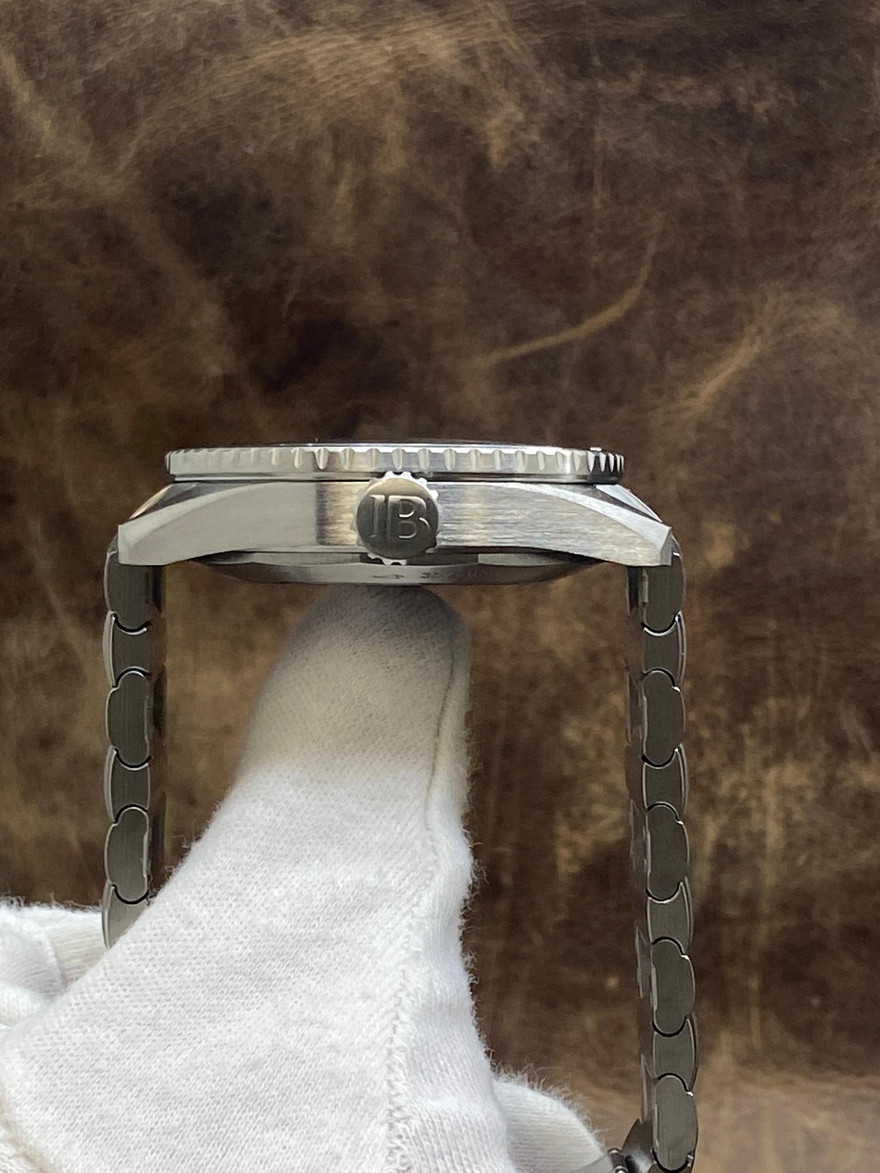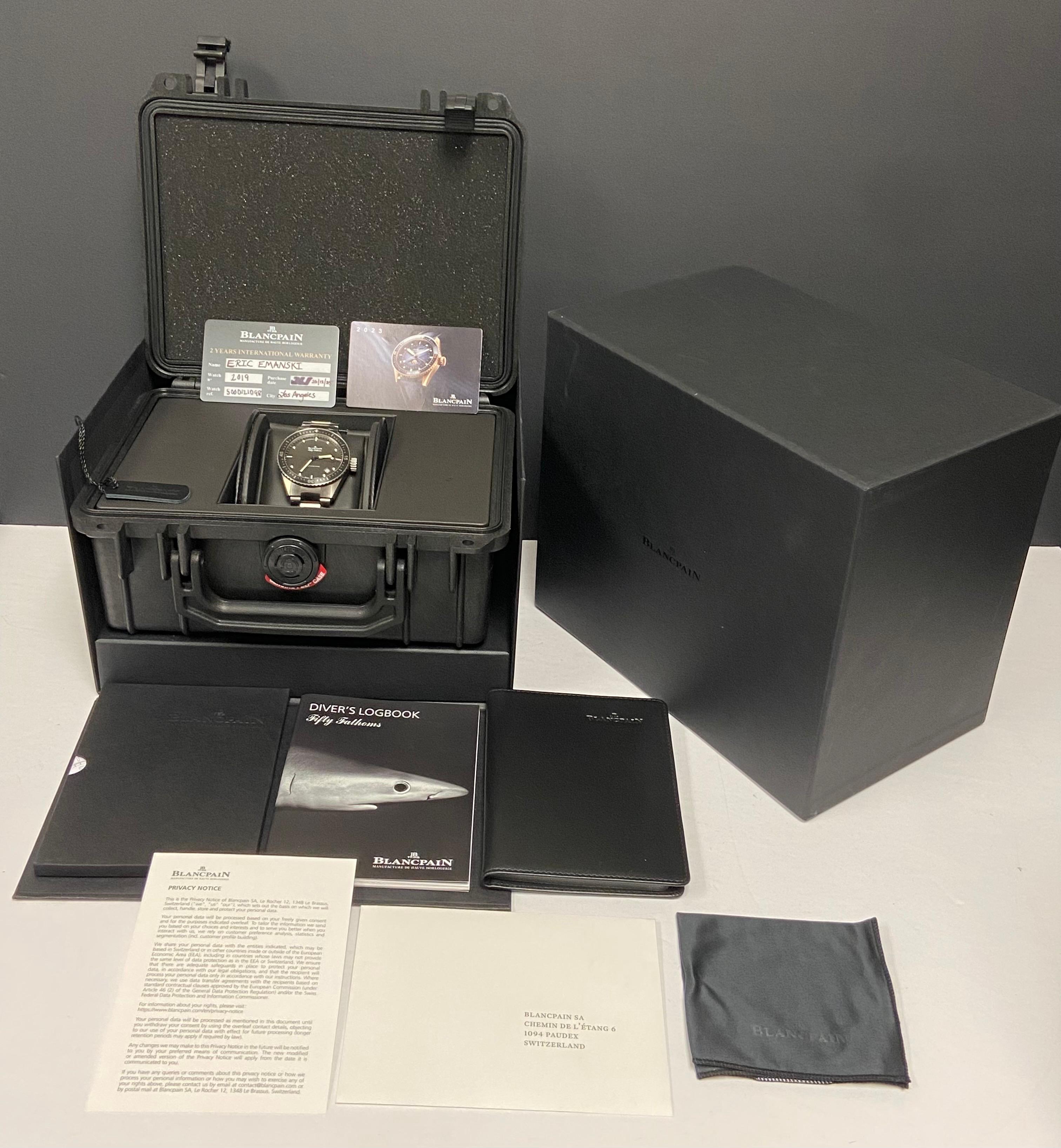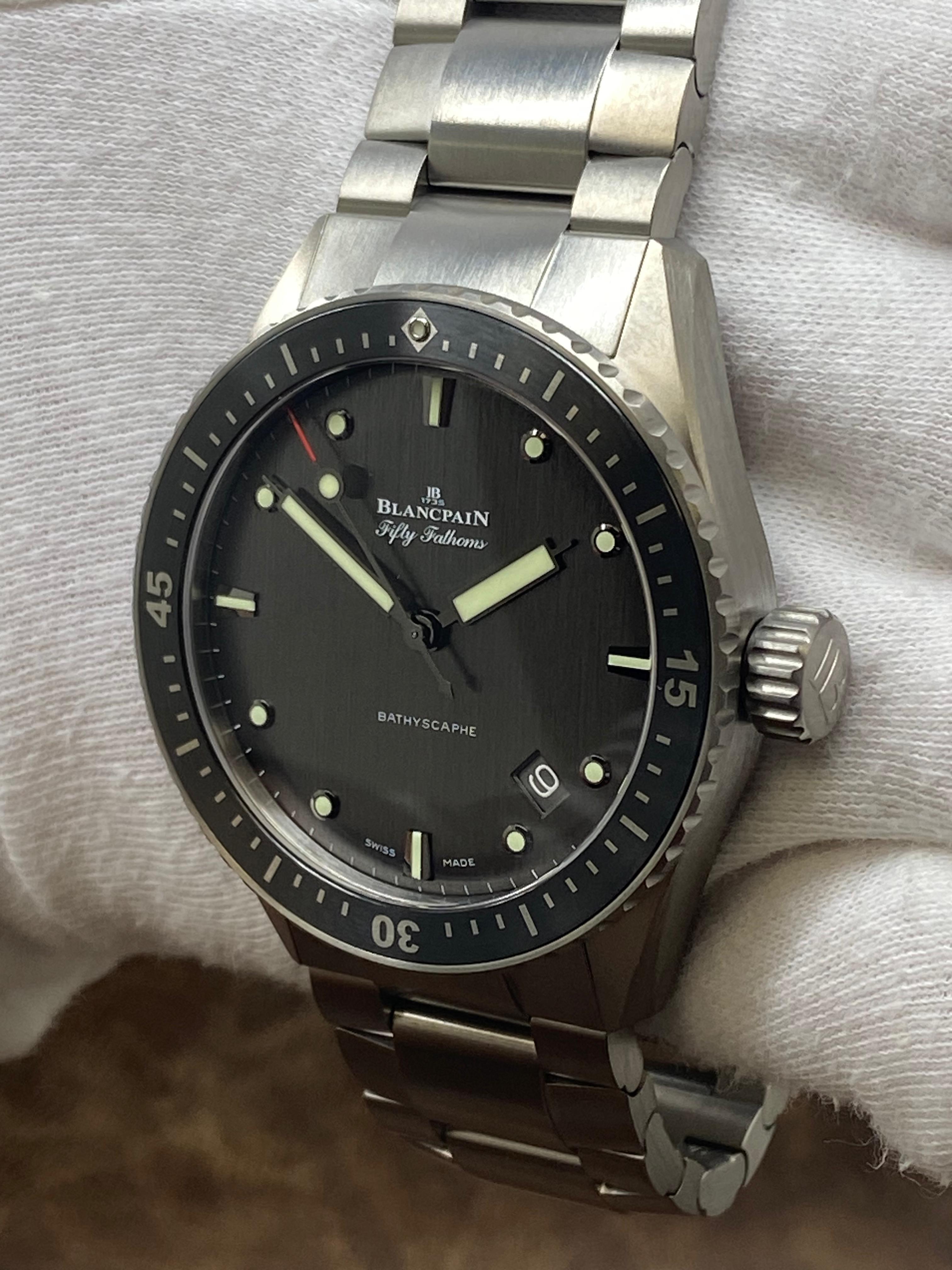 This pre-owned Blancpain Fifty Fathoms Bathyscaphe Titanium 5000 1210 98S is in mint condition and comes with: original Blancpain double box, tag, booklets and matching warranty card dated Dec 2025. Max wrist size: 7.5 in.