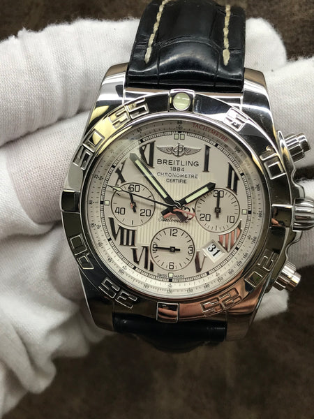 Stainless steel case with a leather strap. Uni-directional rotating stainless steel bezel. Offwhite dial with silver tone luminous hands and Roman numerals hour markers. Dial type: analog. Automatic movement with about of power reserve. Scratch resistant sapphire crystal. Screw down crown. Solid case back. Case size: 44 mm. Case thickness: mm. Round case shape. Band width: 22 mm. Deployment clasp. Water resistant at 500m. Functions: chronograph, hour, minute, seconds, date. Breitling Chronomat AB011012 Offwhite Dial Automatic Men's Watch.