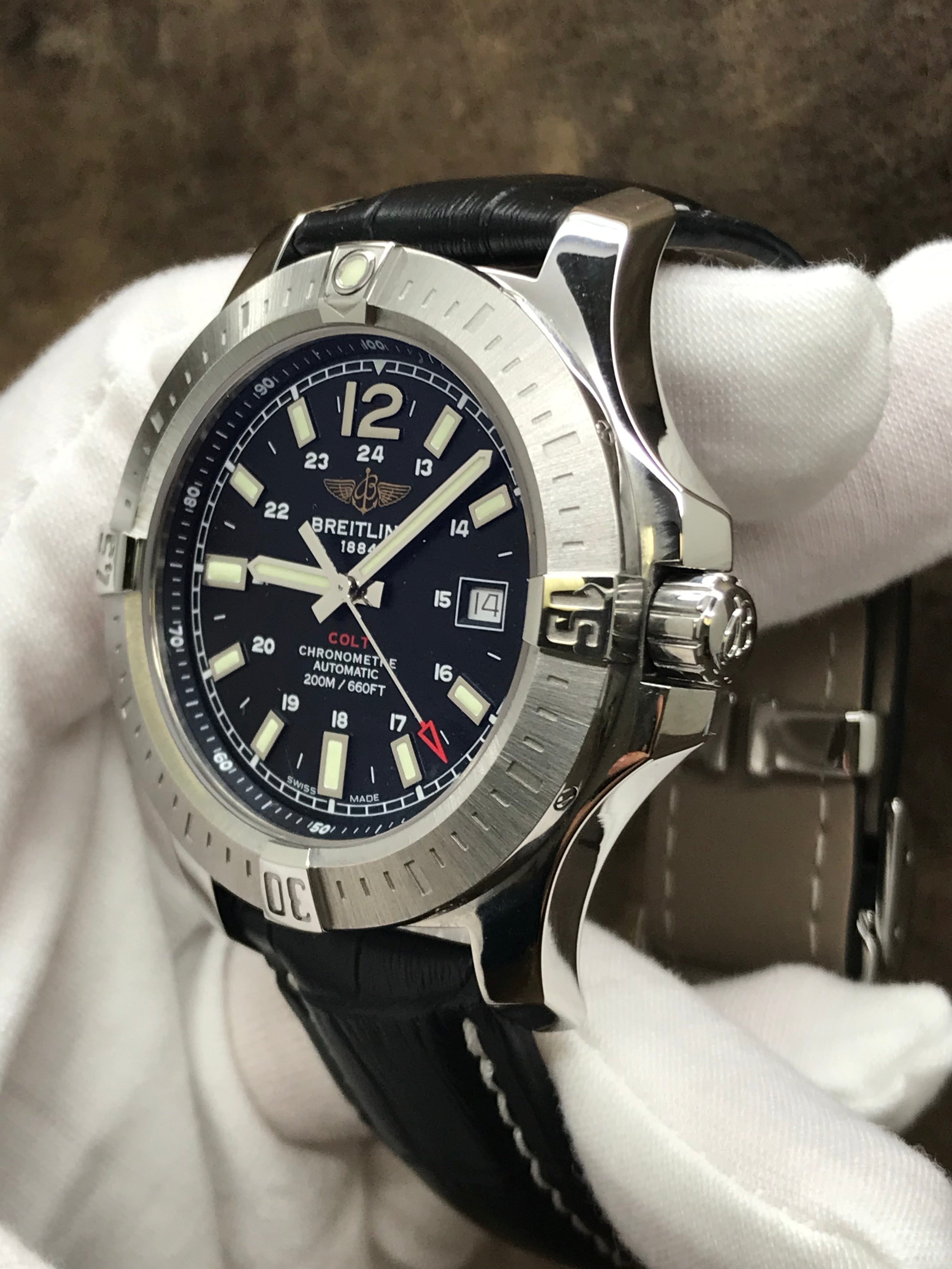 Stainless steel case with a leather strap. Uni-directional rotating stainless steel bezel. Black dial with silver tone luminous hands and luminous index hour markers. Dial type: analog. Luminescent hands and markers. Breitling calibre 17 automatic movement with about 42 hours of power reserve. Scratch resistant sapphire crystal. Screw in crown. Solid case back. Case size: 44 mm. Case thickness: 11.25 mm. Round case shape. Band width: 22 mm. Fold over deployant clasp. Water resistant at 200 meters / 660 feet. Functions: chronometer, date, hour, minute, second. Breitling Colt 44 A17388 Black Dial Automatic Men's Watch.