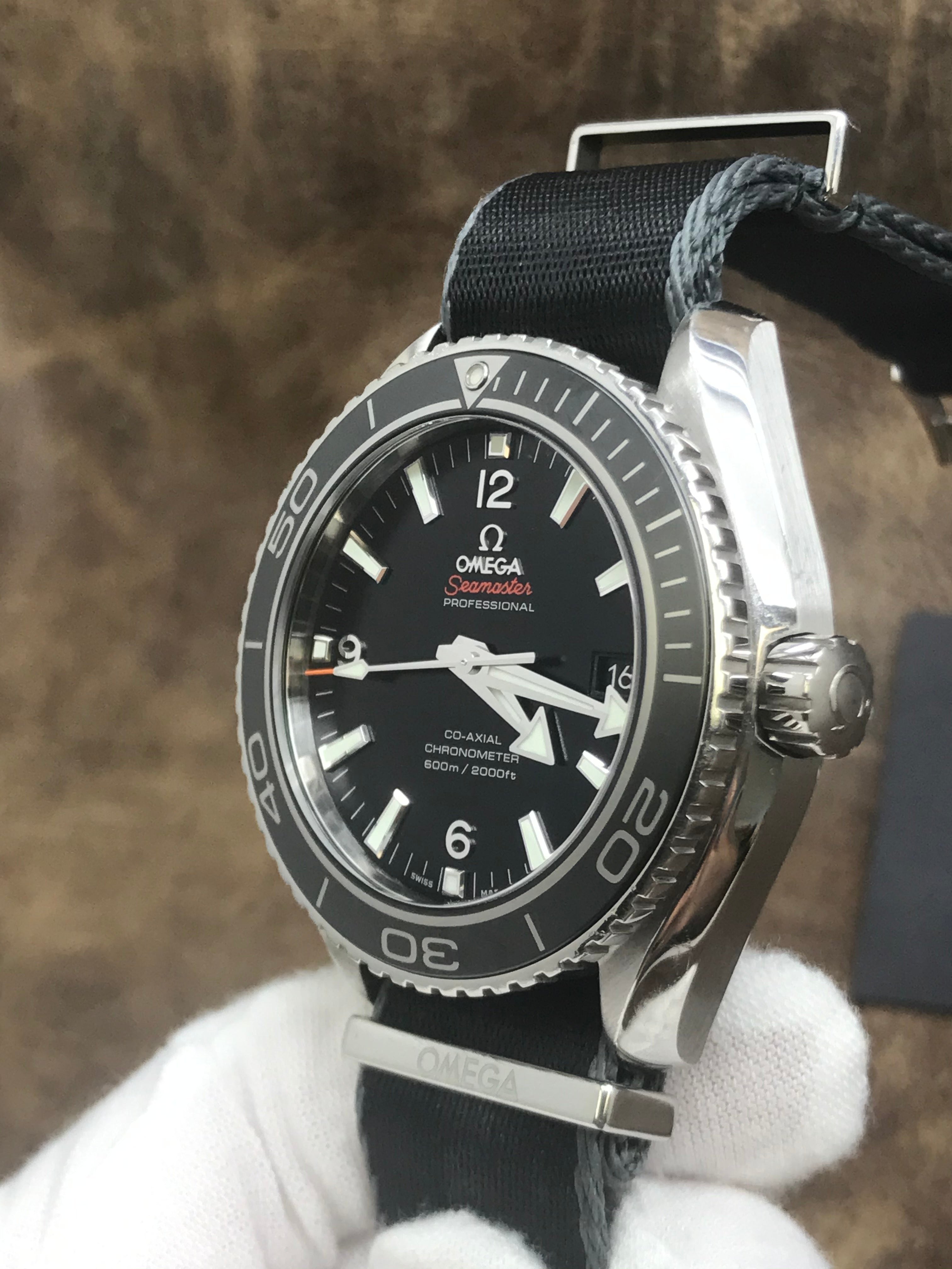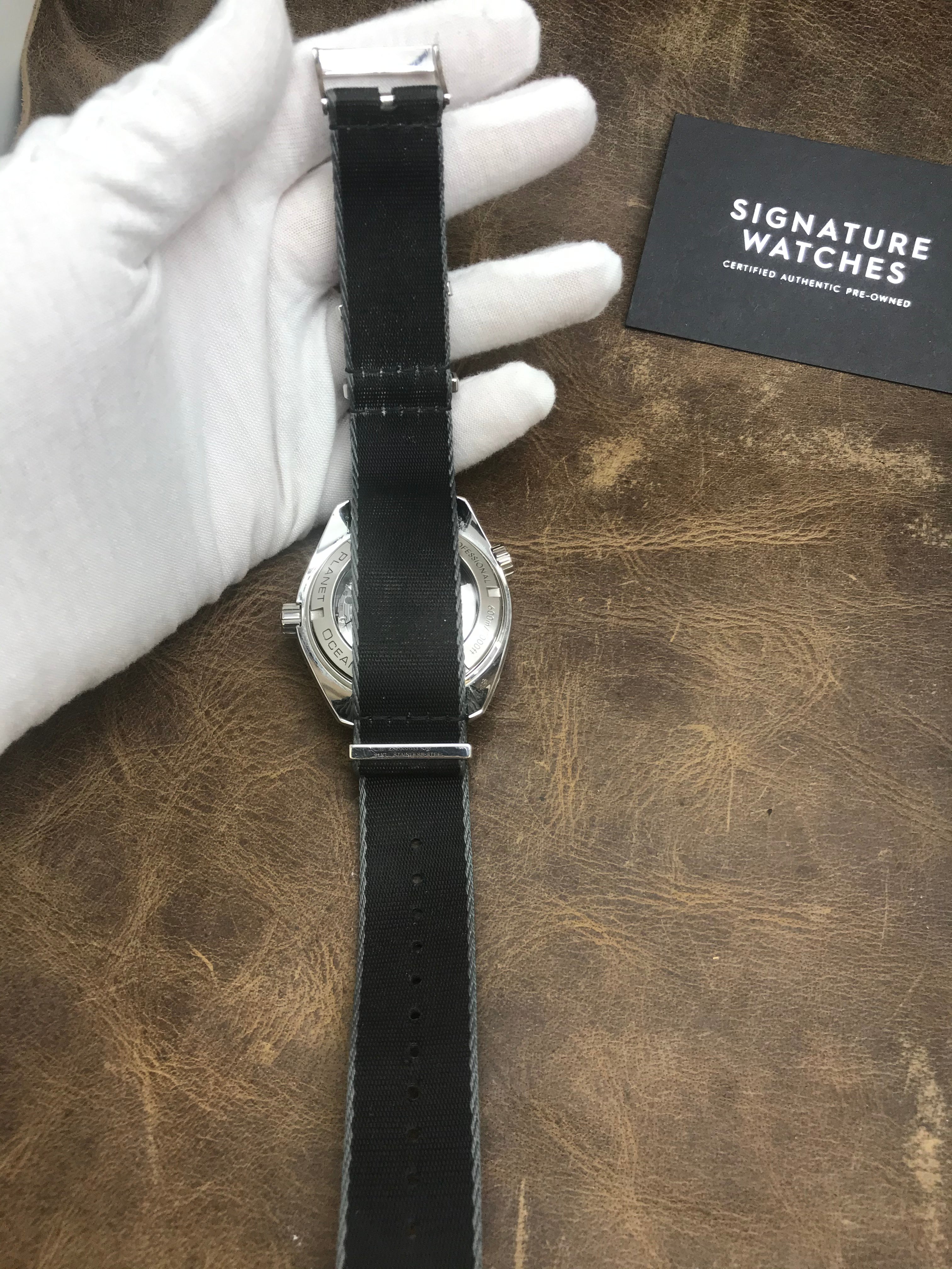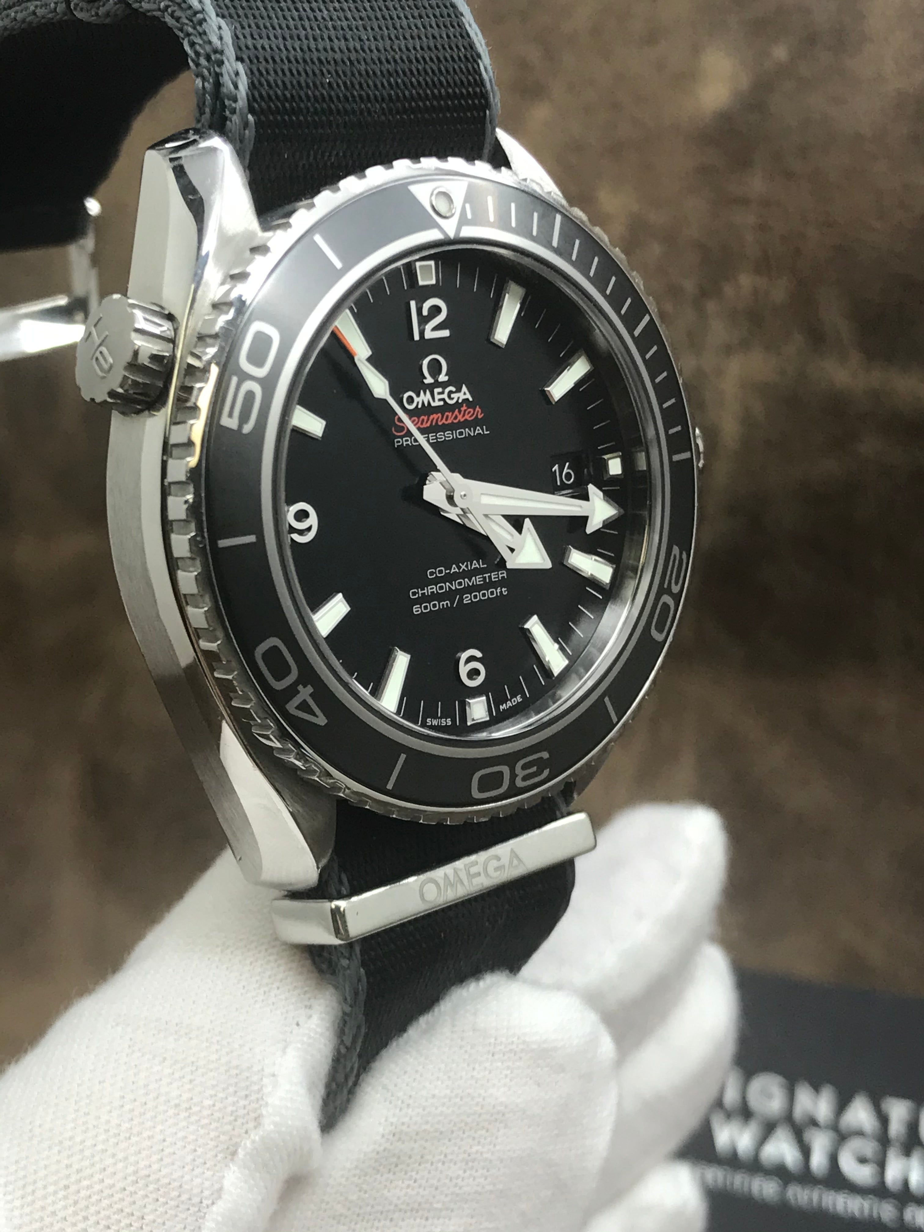 Stainless steel case with a nato nato strap. Uni-directional rotating ceramic bezel. Black dial with silver tone luminous hands and index with 6, 9, 12 Arabic hour markers. Dial type: analog. Omega co-axial calibre 8500 automatic movement with about 60 hours of power reserve. Domed anti‑reflective, scratch‑resistant sapphire crystal crystal. Screw-down crown. Transparent case back. Case size: 42 mm. Case thickness: 15.8 mm. Round case shape. Band width: 20 mm. Buckle clasp. Water resistant at 600m/2000ft. Functions: date, hour, minute, seconds, helium escape valve, chronometer. Omega Seamaster Planet Ocean 232.30.42.21.01.001 Black Dial Automatic Men's Watch.