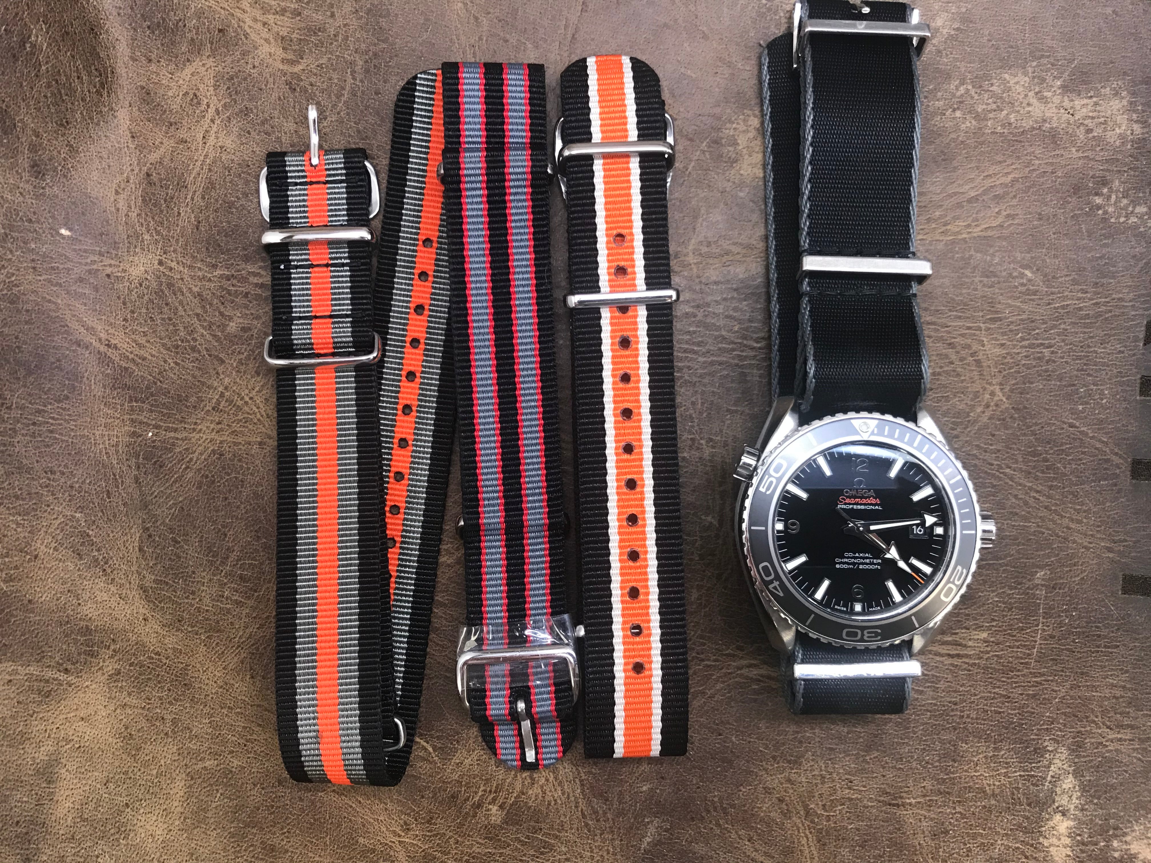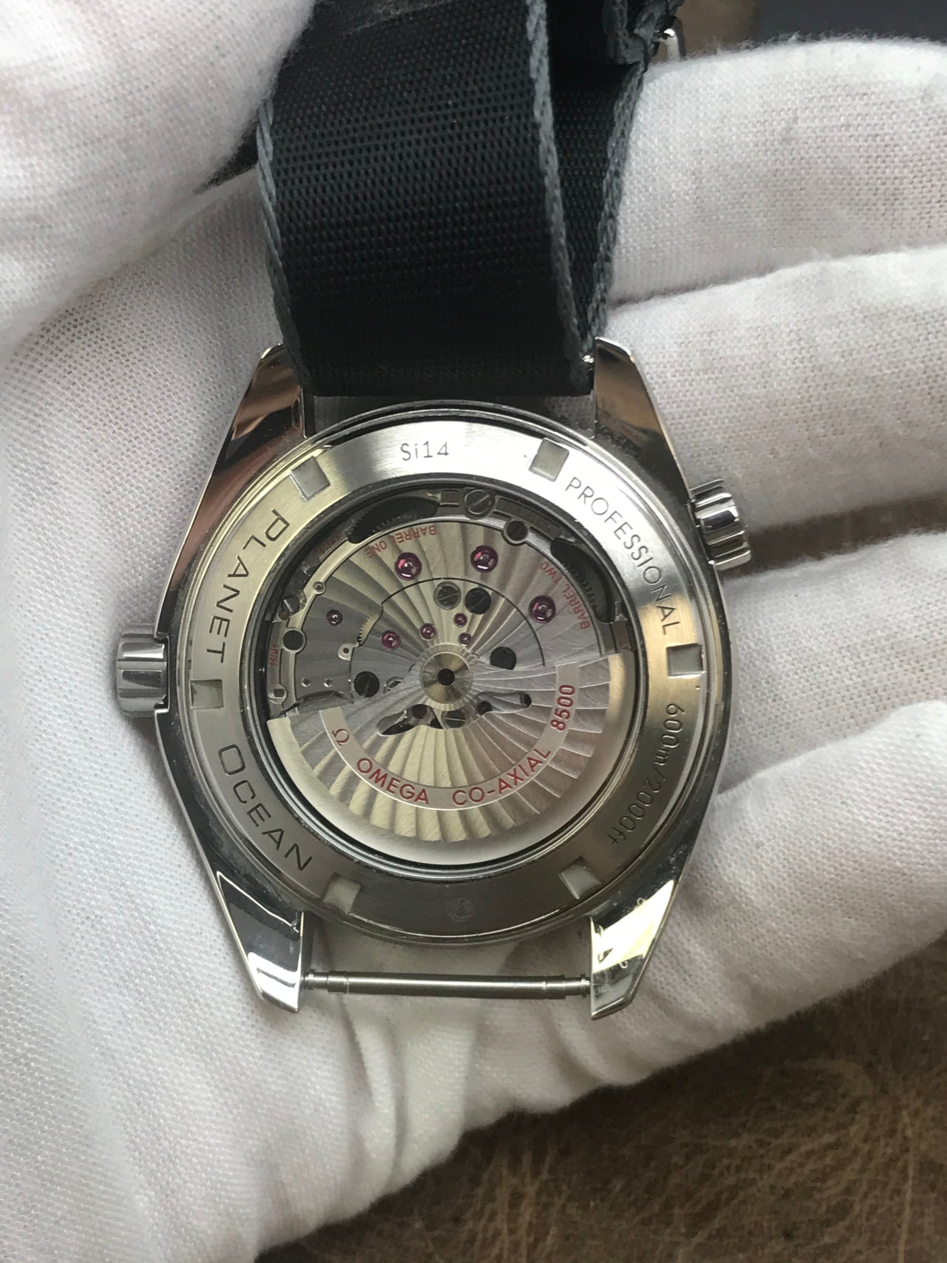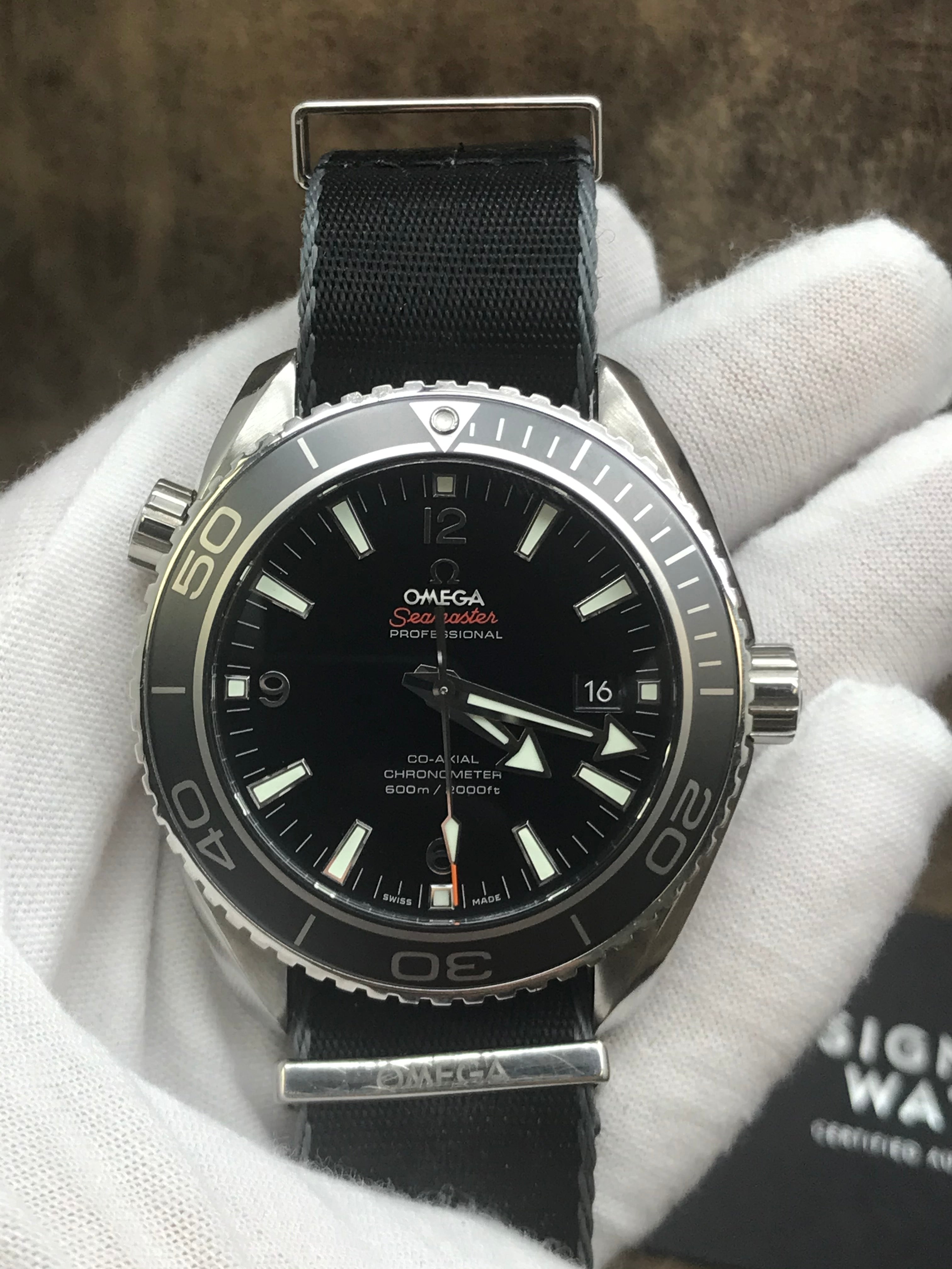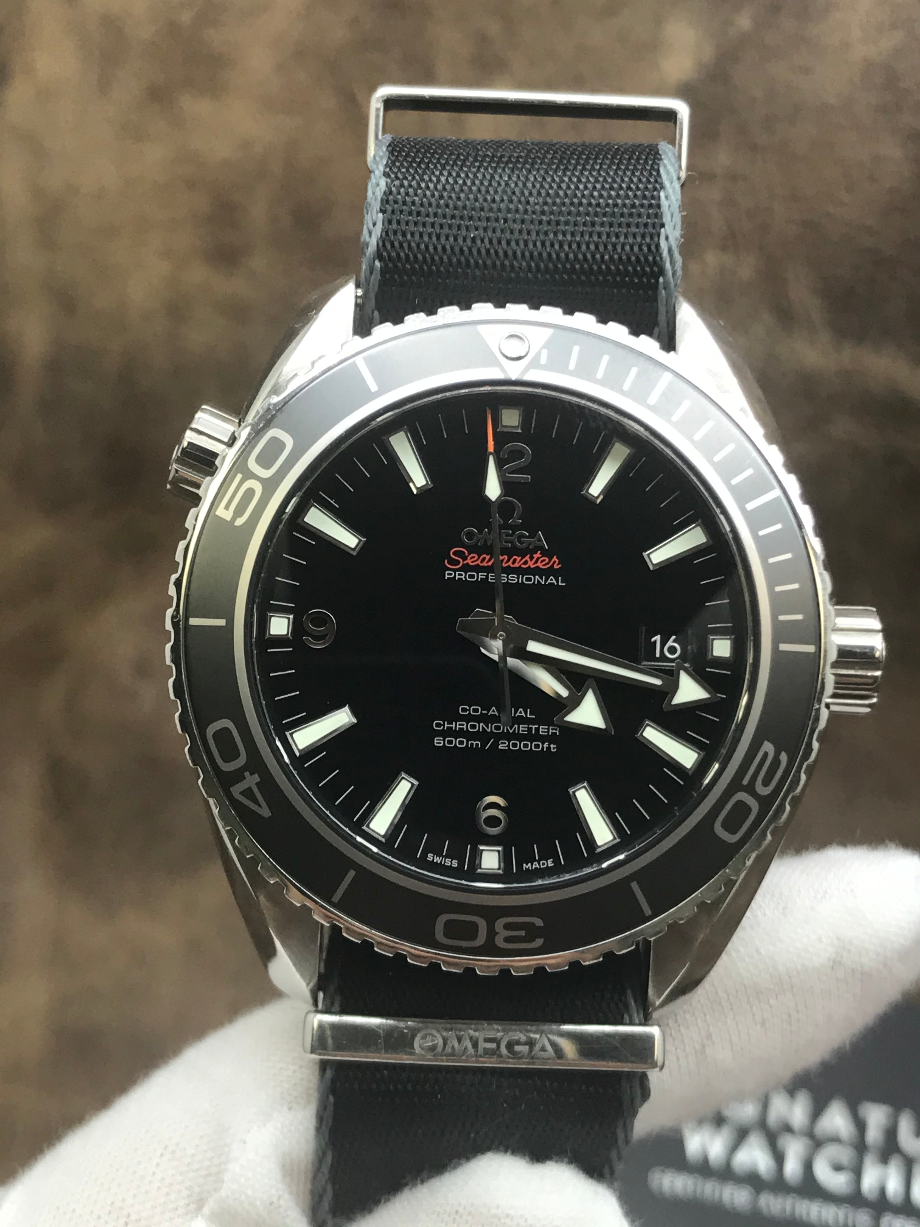 Stainless steel case with a nato nato strap. Uni-directional rotating ceramic bezel. Black dial with silver tone luminous hands and index with 6, 9, 12 Arabic hour markers. Dial type: analog. Omega co-axial calibre 8500 automatic movement with about 60 hours of power reserve. Domed anti‑reflective, scratch‑resistant sapphire crystal crystal. Screw-down crown. Transparent case back. Case size: 42 mm. Case thickness: 15.8 mm. Round case shape. Band width: 20 mm. Buckle clasp. Water resistant at 600m/2000ft. Functions: date, hour, minute, seconds, helium escape valve, chronometer. Omega Seamaster Planet Ocean 232.30.42.21.01.001 Black Dial Automatic Men's Watch.