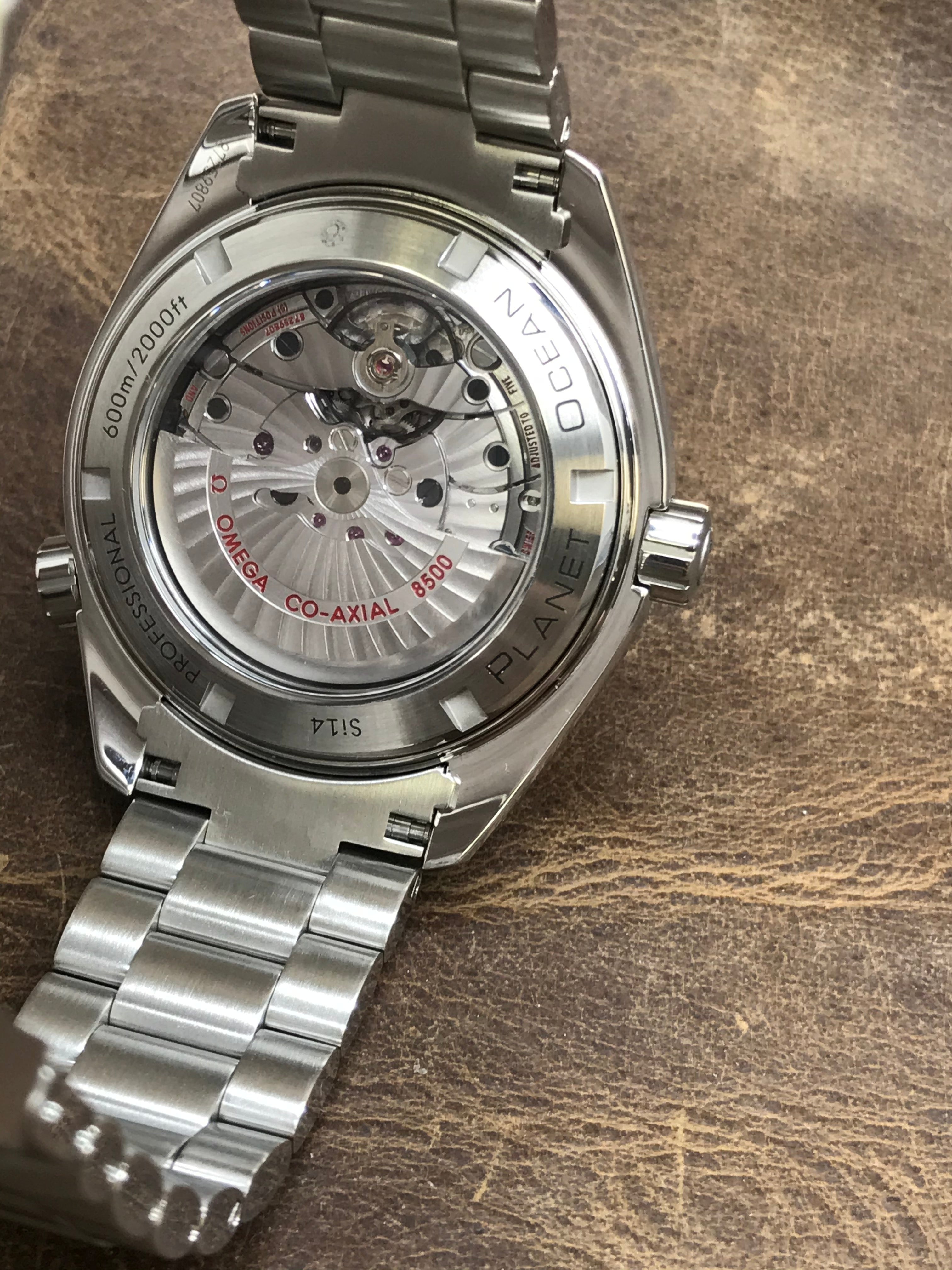 Stainless steel case with a stainless steel bracelet. Uni-directional rotating aluminum bezel. Black dial with silver tone luminous arrow-shaped hands and luminous index hour markers. Dial type: analog. Luminescent hands and markers. Omega calibre 8500 automatic movement with about 60 hours of power reserve. Scratch resistant sapphire crystal. Screw down crown. Skeleton case back. Case size: 45.5 mm. Case thickness: 15 mm. Round case shape. Band width: 22 mm. Deployment w/ push button release clasp. Water resistant at 600 meters / 2000 feet. Functions: date, hour, minute, second, chronometer. Omega Seamaster Planet Ocean 232.30.46.21.01.002 Black Dial Automatic Men's Watch.