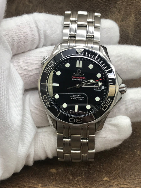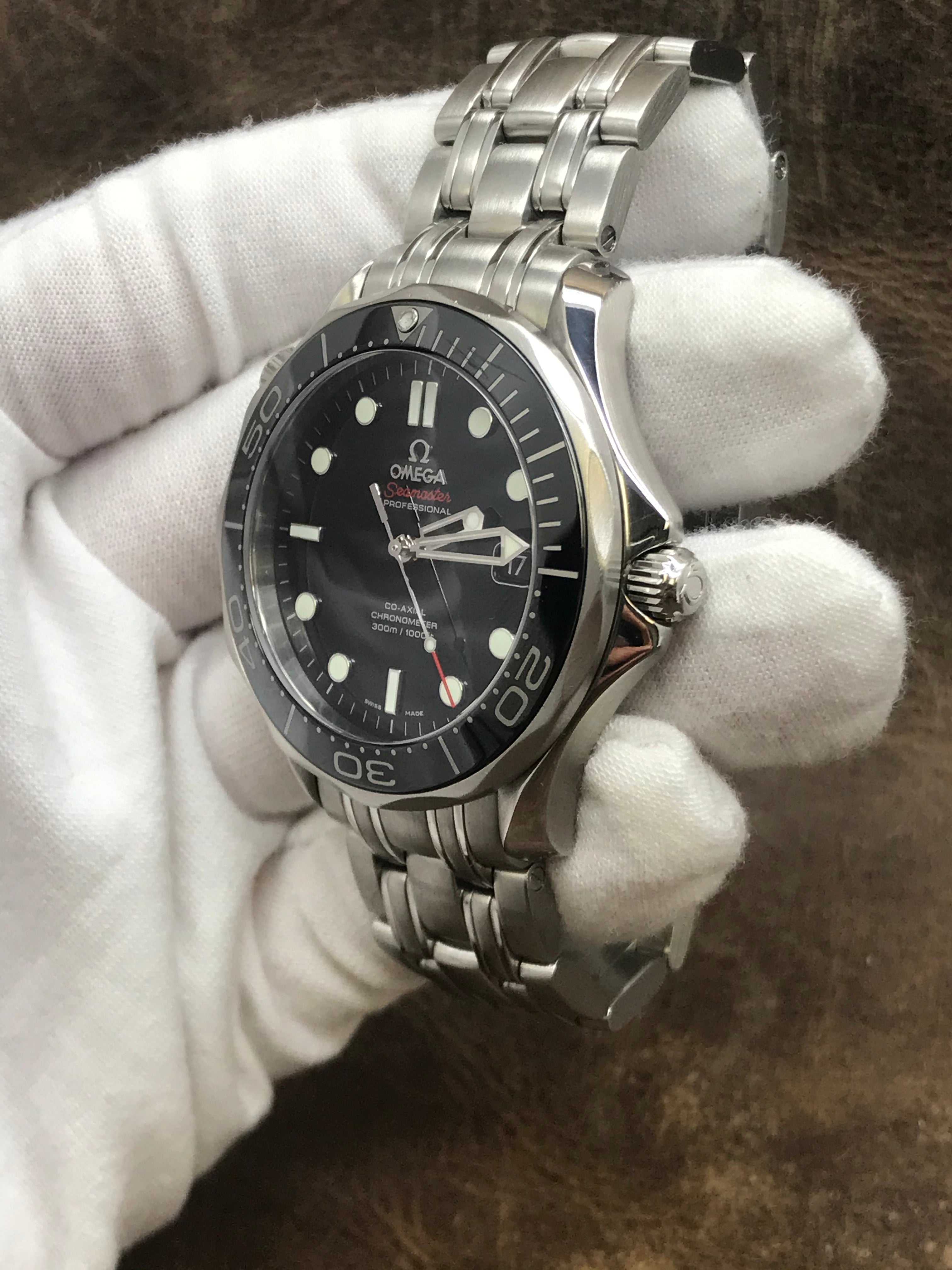 This pre-owned Omega Seamaster 212.30.41.20.01.003 is in very good condition and comes with: original Omega box only. This watch has scratches on the black insert between 12-2 o'clock and a cracked pearl at 12 o'clock. Max wrist size: 7 in.