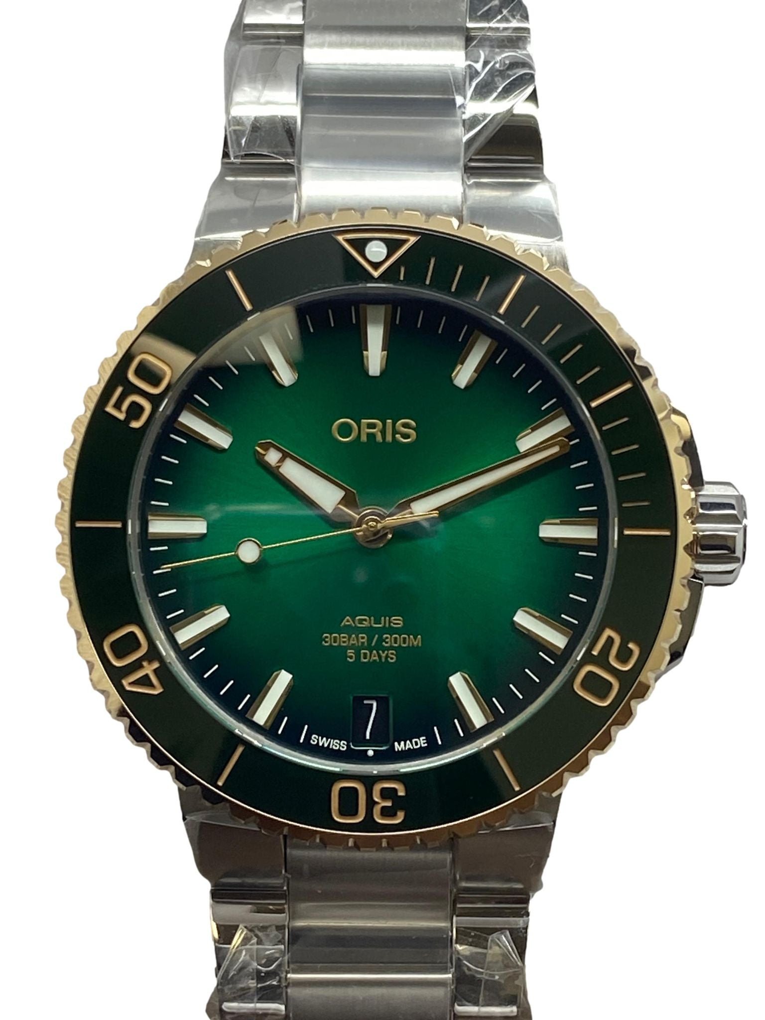 Stainless steel case with a stainless steel bracelet. Uni-directional rotating 18k gold with a ceramic insert bezel. Green dial with luminous silver-tone hands and index hour markers. Dial type: analog. Calibre 400 automatic movement with about 5 days / 120 hours of power reserve. Scratch resistant sapphire crystal. Screw down crown. Transparent case back. Case size: 41 mm. Case thickness: mm. Round case shape. Band width: mm. Fold over with push button release clasp. Water resistant at 300 meters / 1000 feet. Functions: date, hour, minute, seconds. Oris Aquis Date 01 400 7769 6357 Green Dial Automatic Men's Watch.