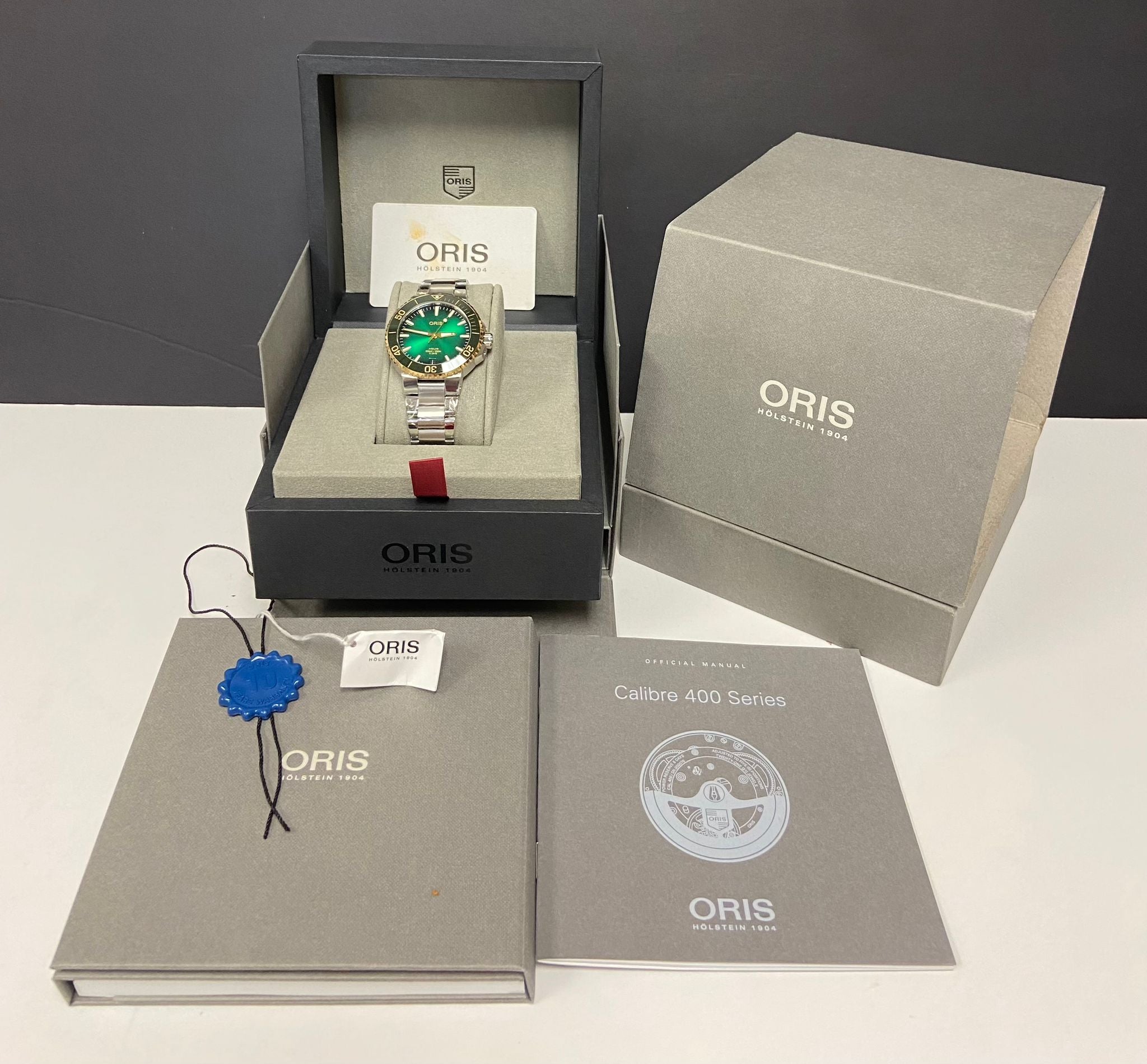 - original Oris double box, booklet, tag and matching warranty paper
