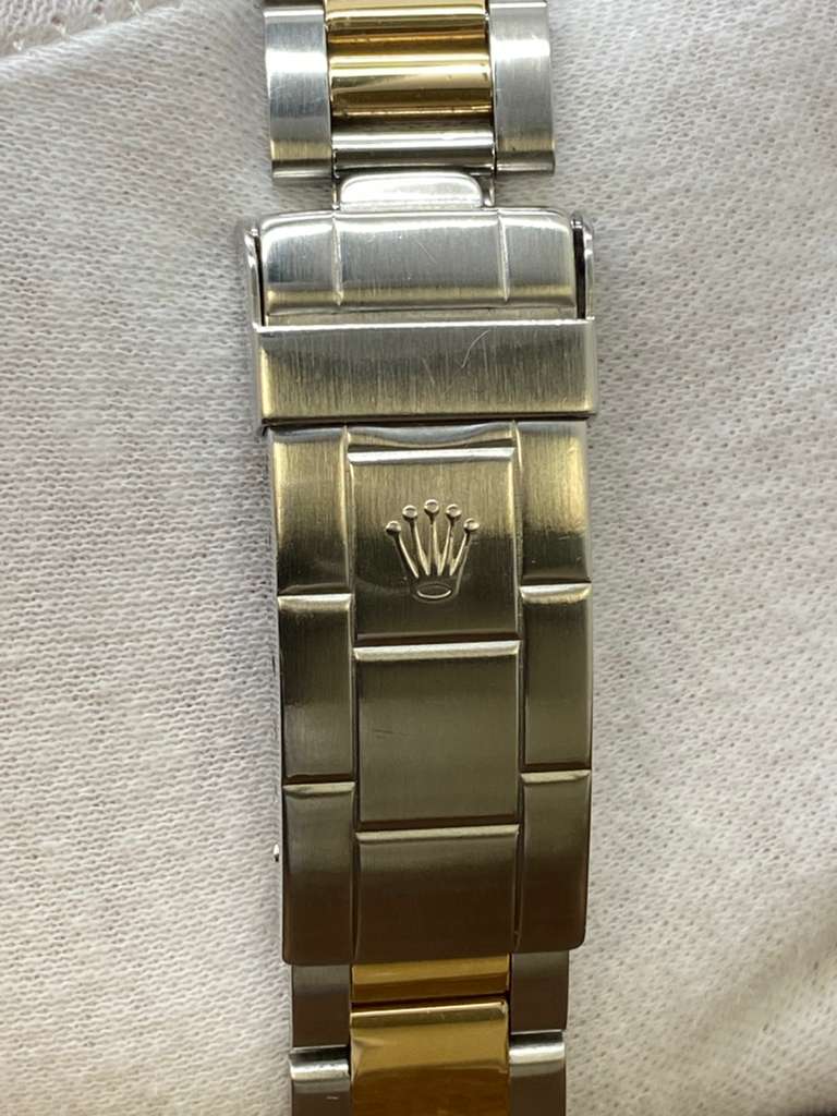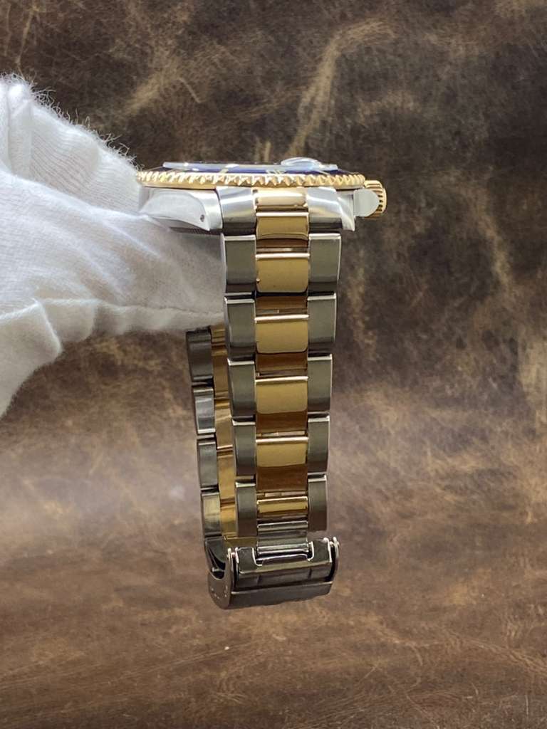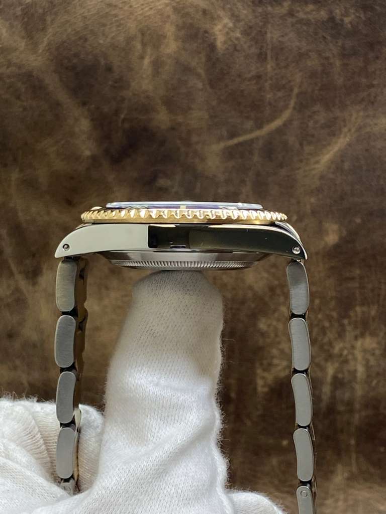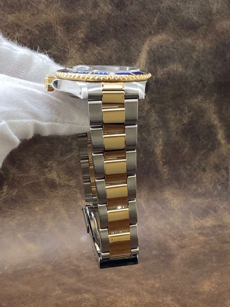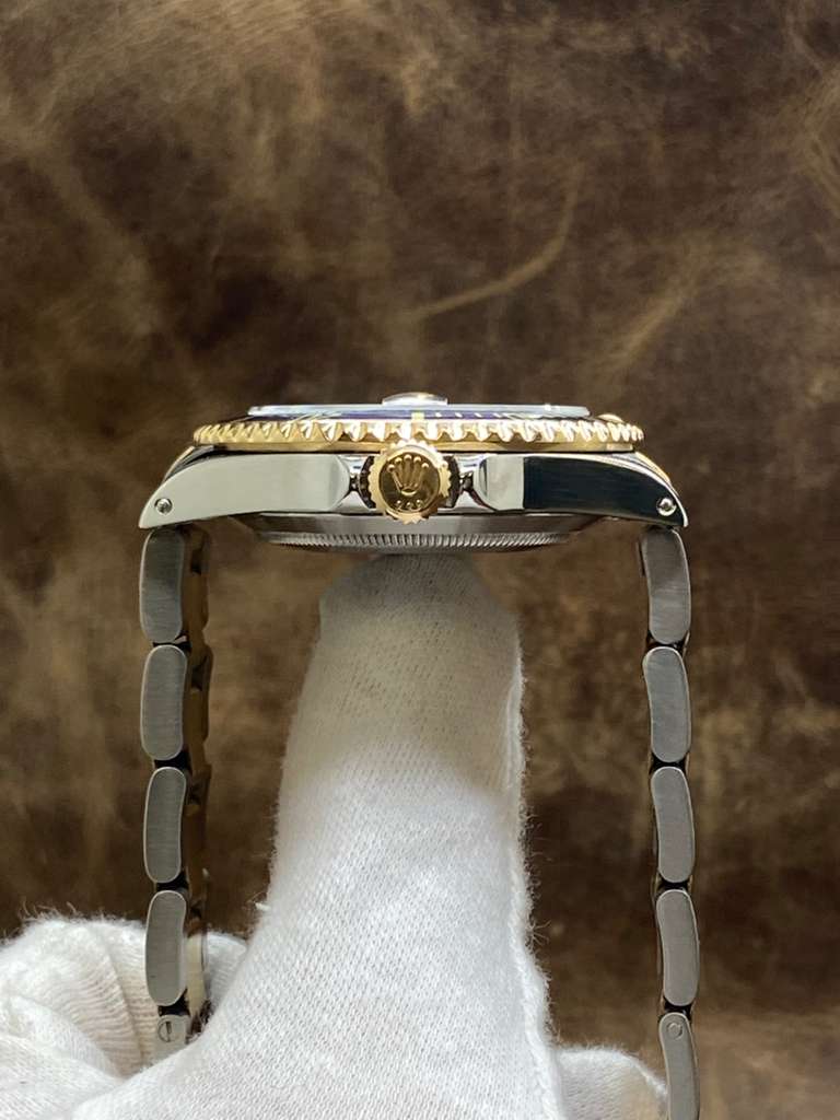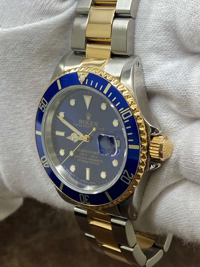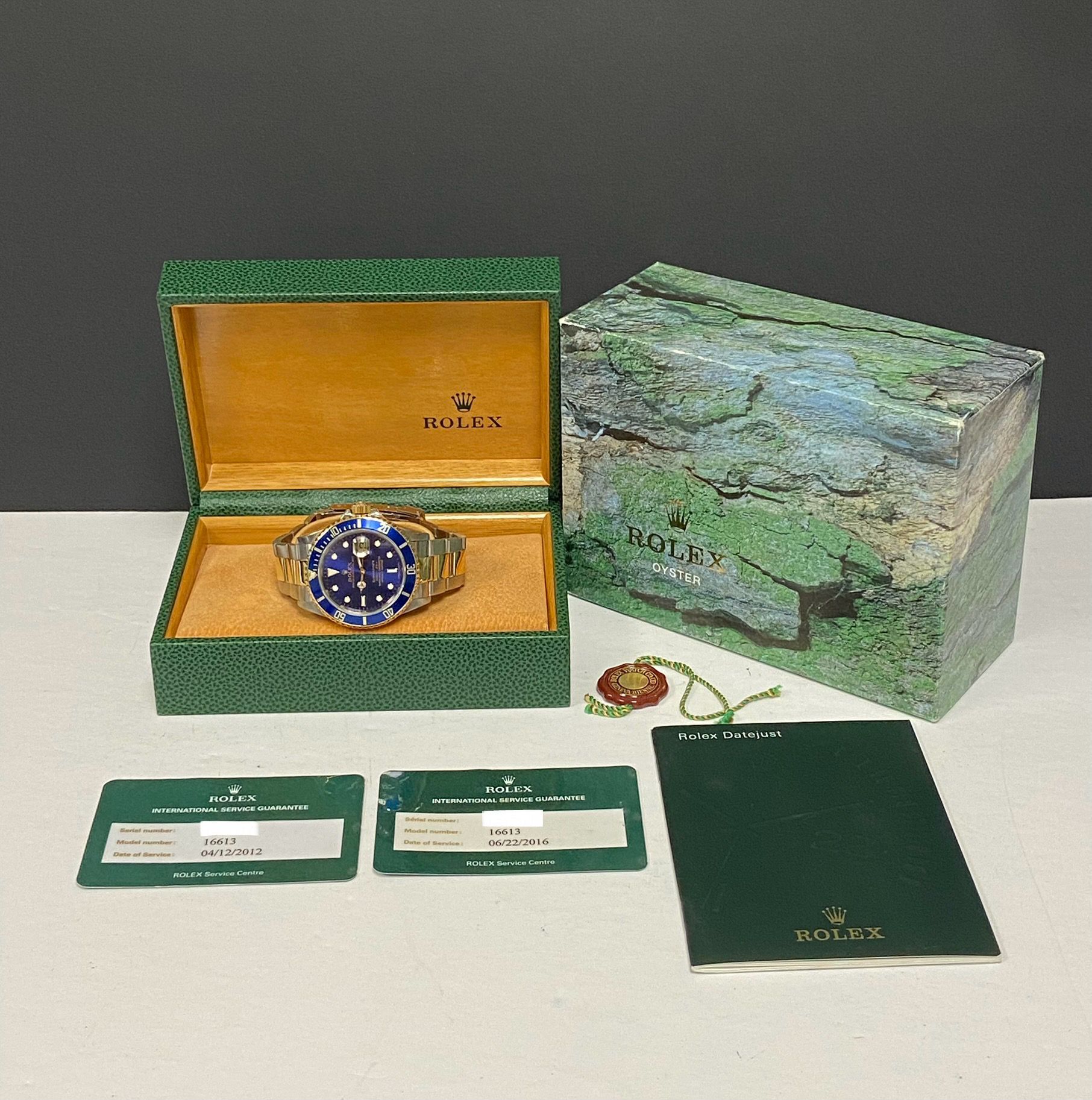 Stainless steel case with a stainless steel & 18k yellow gold oyster bracelet. Uni-directional rotating 18k yellow gold bezel with aluminum insert bezel. Blue dial with gold tone & luminous hands and index hour markers. Dial type: analog. Rolex calibre 3135 automatic movement with about 48 hours of power reserve. Sapphire crystal. Screw down crown. Solid case back. Case size: 40 mm. Case thickness: 12.5 mm. Round case shape. Band width: mm. Fold over with safety release clasp. Water resistant at 300 meters / 1000 feet. Functions: date, hour, minute, second, chronometer. Rolex Submariner Date 16613 Blue Dial Automatic Men's Watch.