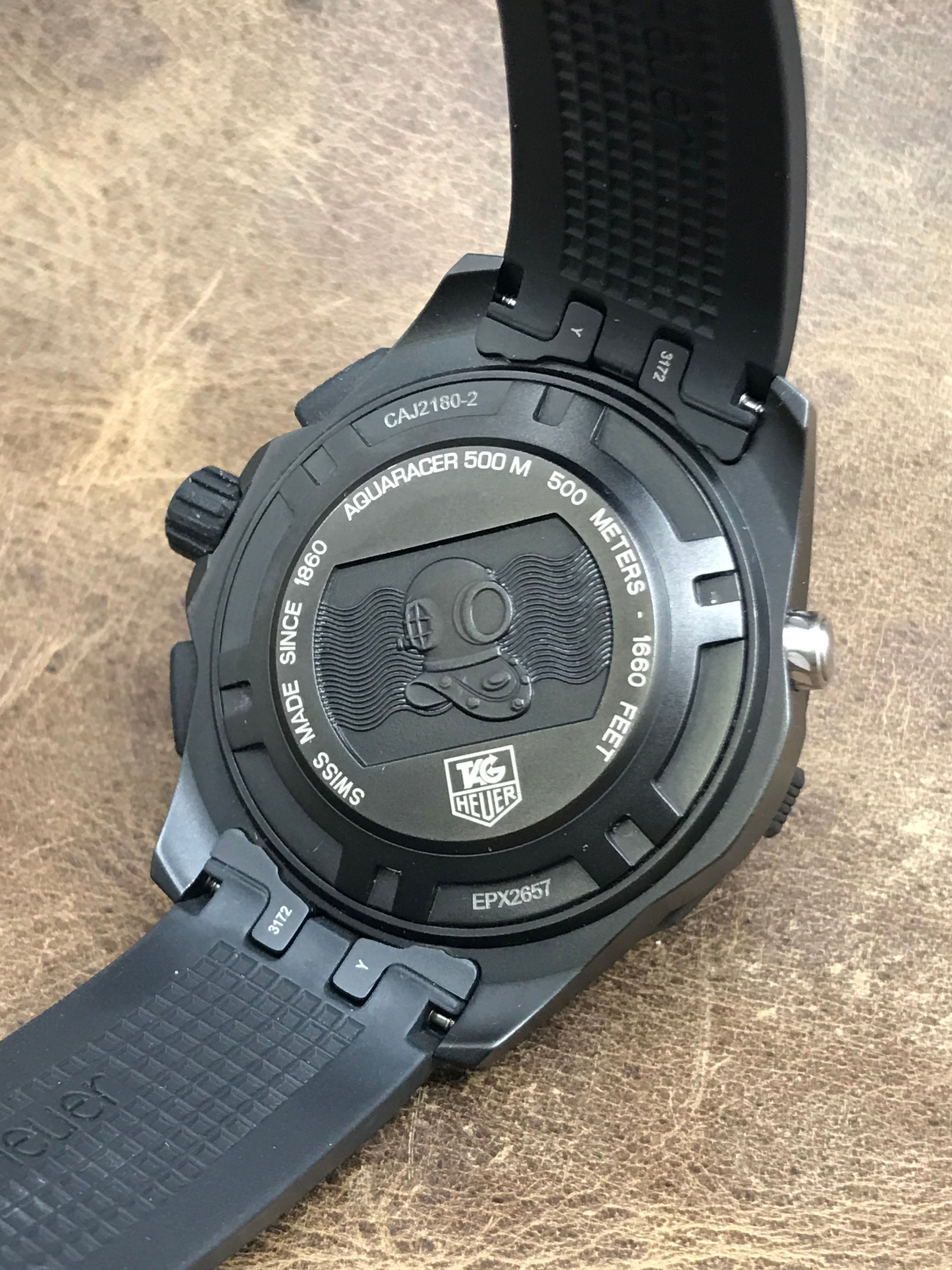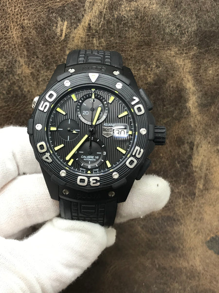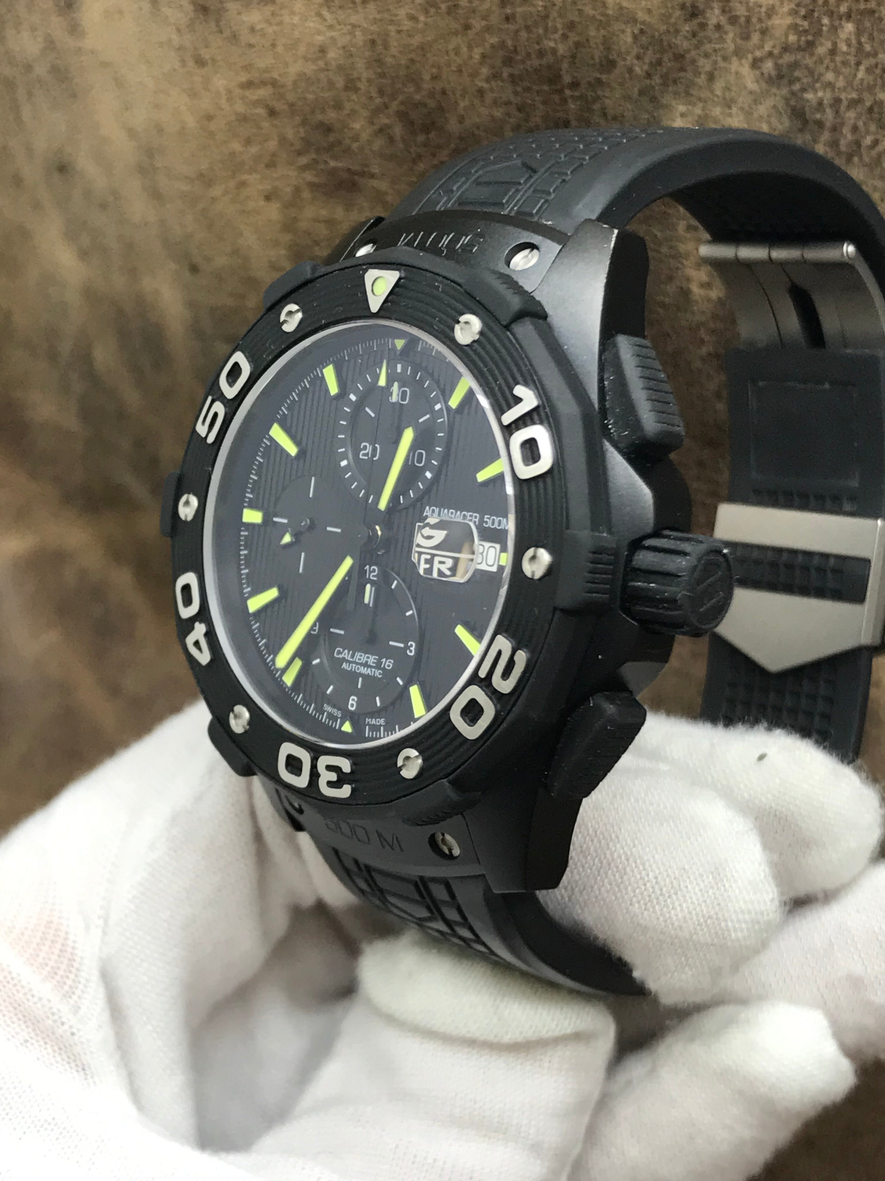 Pvd titanium case with a rubber strap. Uni-directional rotating titanium bezel. Black dial with black, luminescent hands and luminous index hour markers. Dial type: analog. Cal. 16 automatic movement with about 42 hours of power reserve. Scratch resistant sapphire crystal. Screw-down crown. Solid case back. Case size: 44 mm. Case thickness: 16 mm. Round case shape. Band width: 20 mm. Fold over deployant clasp. Water resistant at 500m/1650ft. Functions: hours, minutes, seconds, date, chronograph. TAG Heuer Aquaracer 500M Chronograph CAJ2180 Black Dial Automatic Men's Watch.