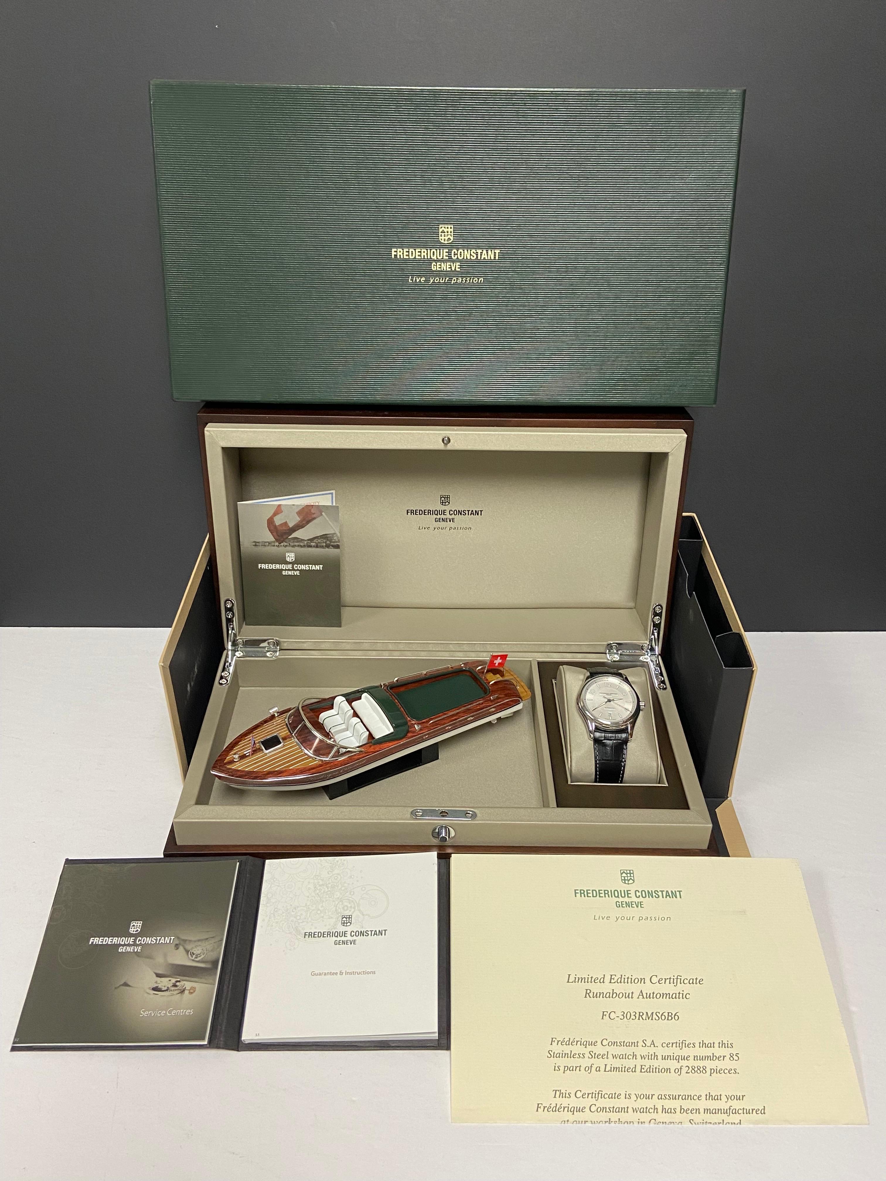 This pre-owned Frederique Constant Runabout Collection L.E 2888pcs FC-303RMS6B6 is in excellent condition and comes with: original Frederique Constant double box, booklets, model boat and matching warranty papers dated 2017. Max wrist size: 8 in.
