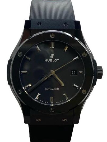 Ceramic case with a rubber strap. Fixed ceramic bezel. Black dial with silver-tone hands and index hour markers. Dial type: analog. Hub1110 automatic movement with about 42 hours of power reserve. Sapphire with anti-reflective treatment crystal. Crown. Transparent case back. Case size: 42 mm. Case thickness: mm. Round case shape. Band width: mm. Fold over with push button release clasp. Water resistant at 50 meters / 165 feet. Functions: date, hour, minute, seconds. Hublot Classic Fusion Black Magic 542.CM.1171.RX Black Dial Automatic Men's Watch.