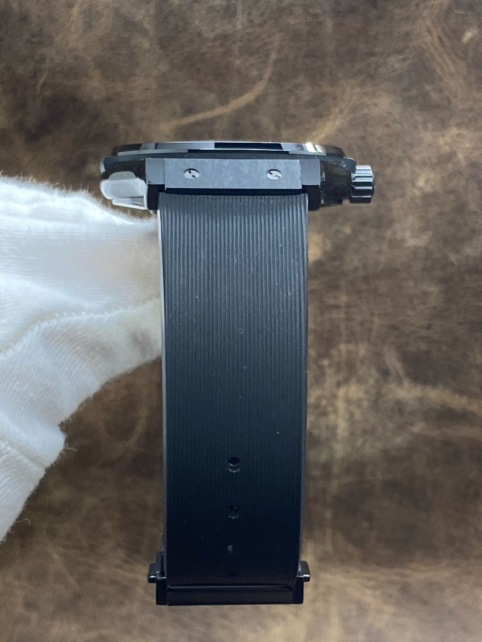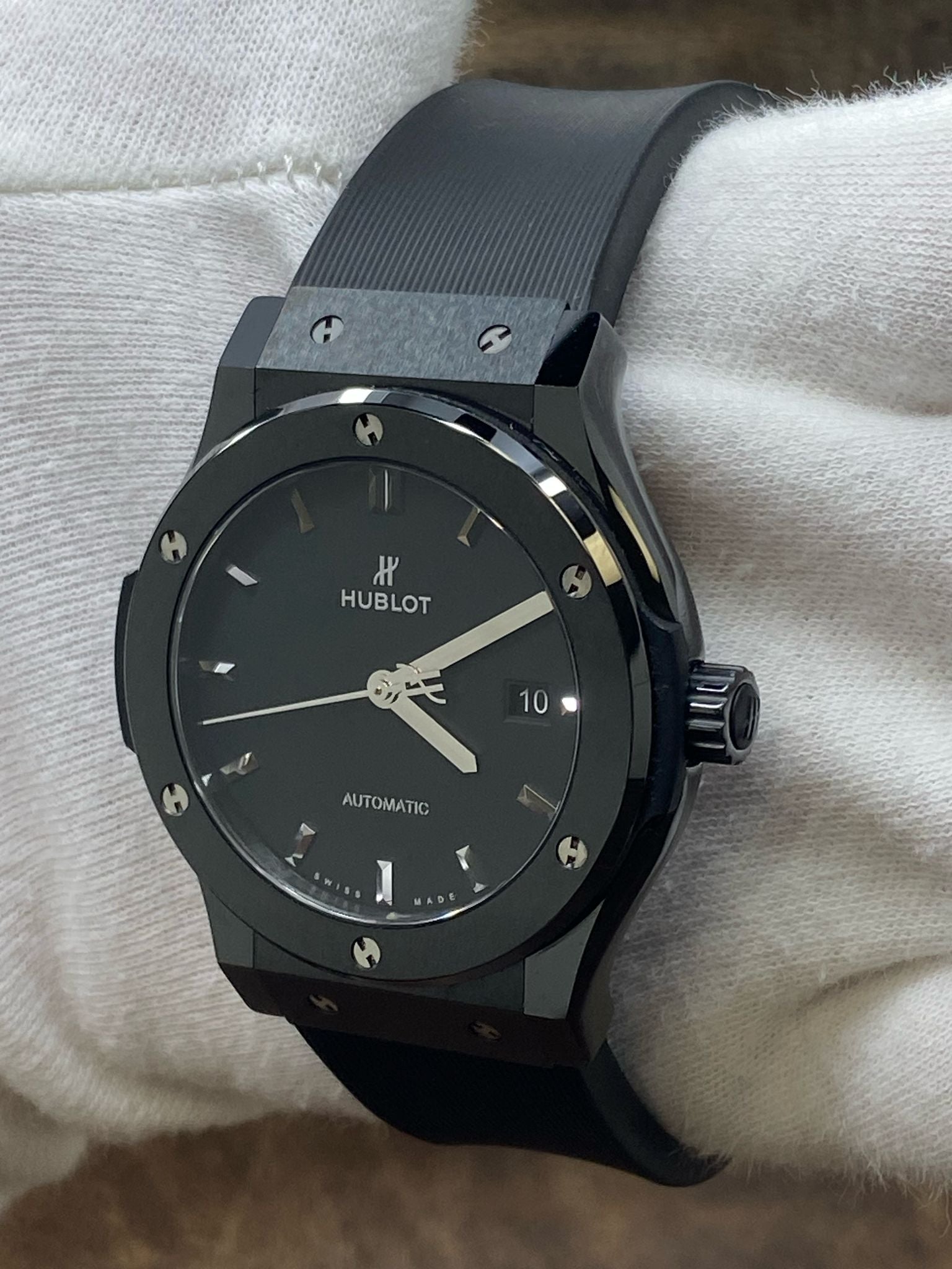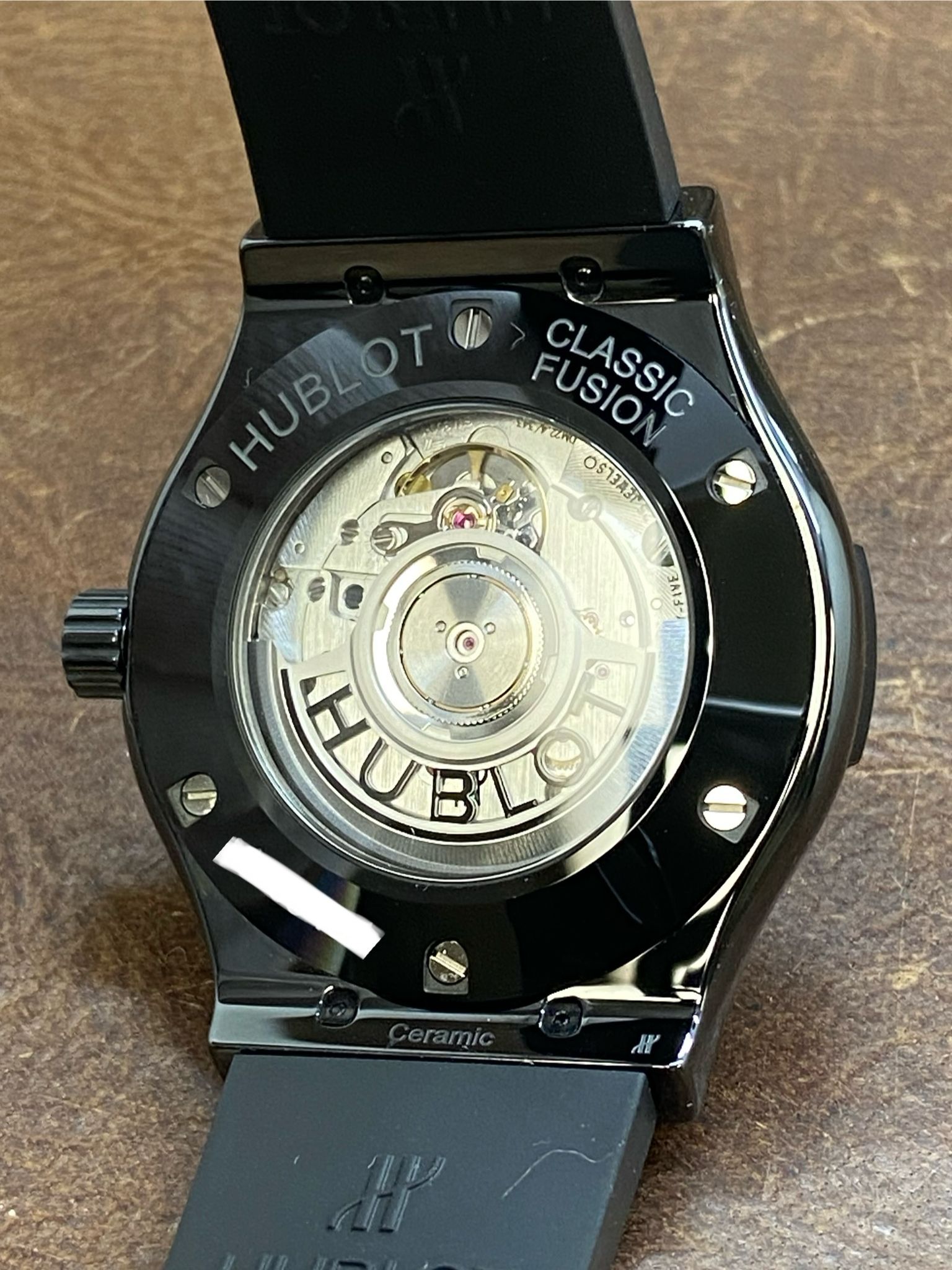 This pre-owned Hublot Classic Fusion Black Magic 542.CM.1171.RX is in excellent condition and comes with: original Hublot double box, tag and factory E-warranty until Oct 2026. The buckle has a few hairlines and the box top part display is missing 2 screws. Max wrist size: 7.75 in.