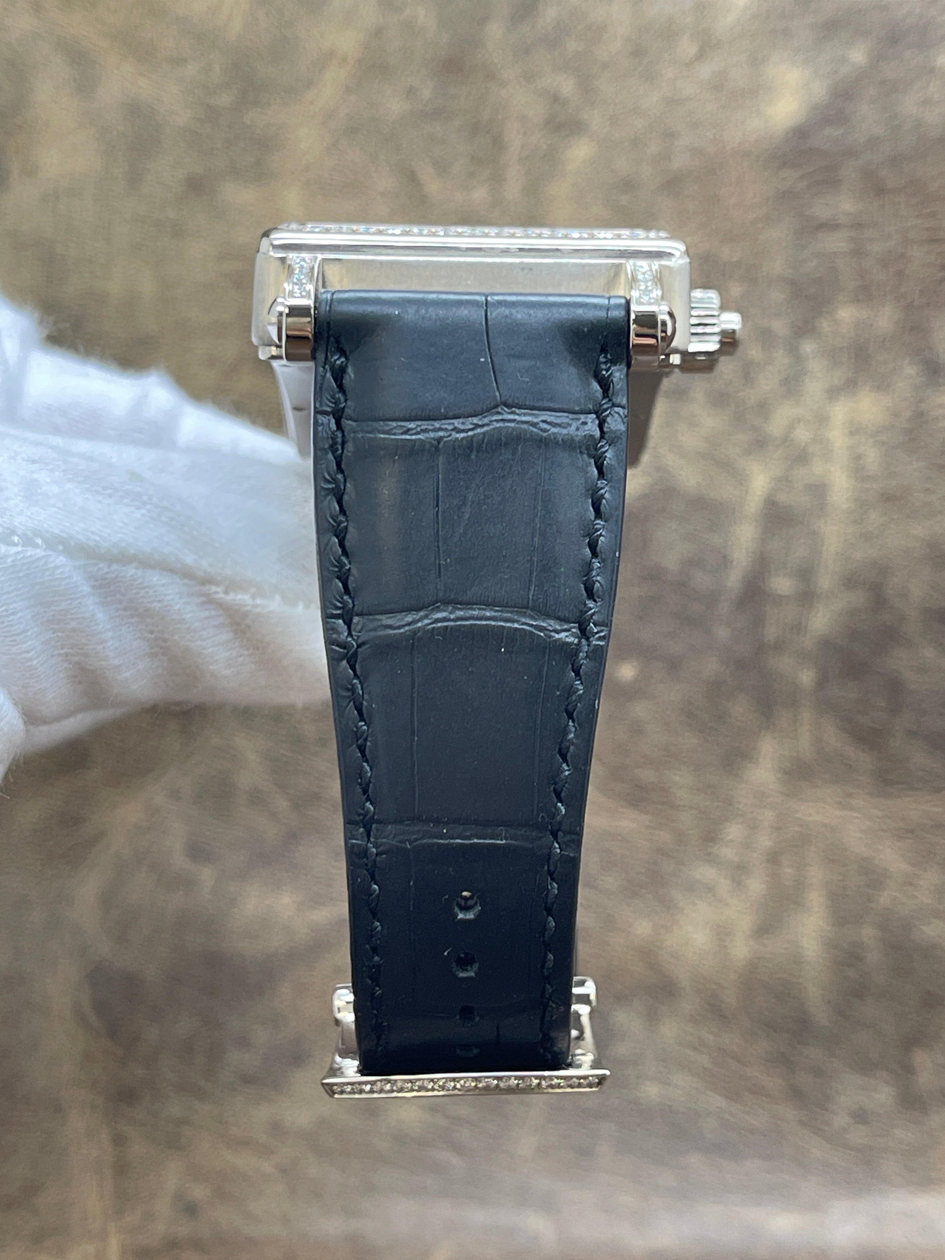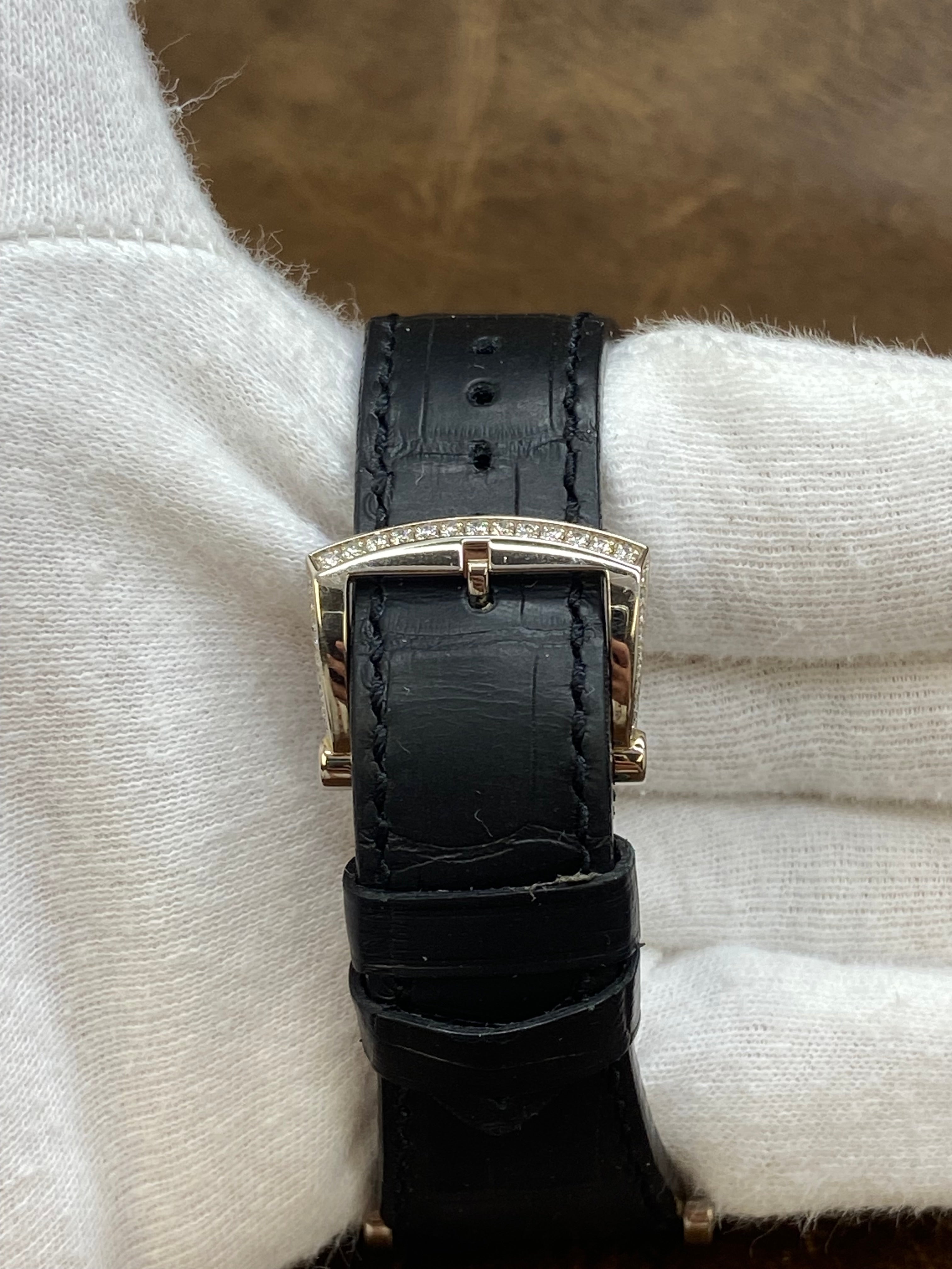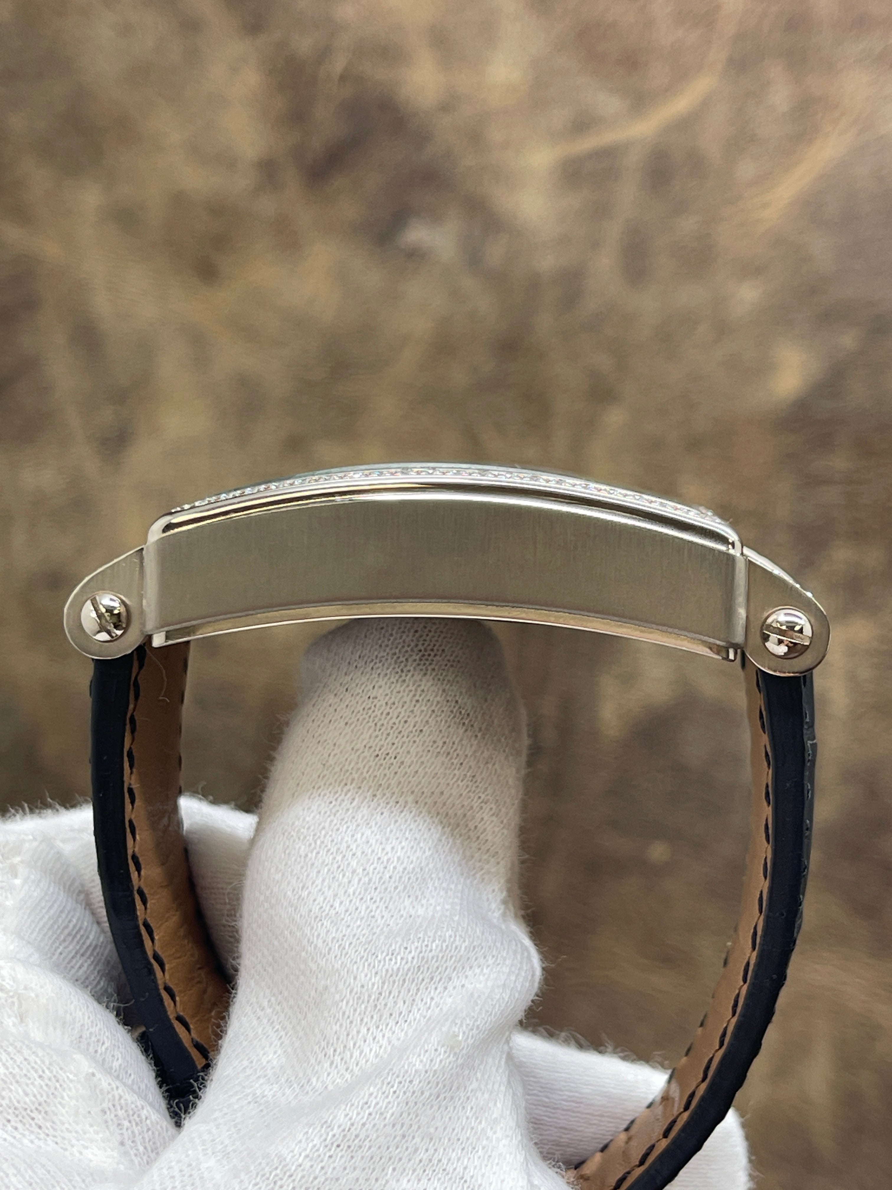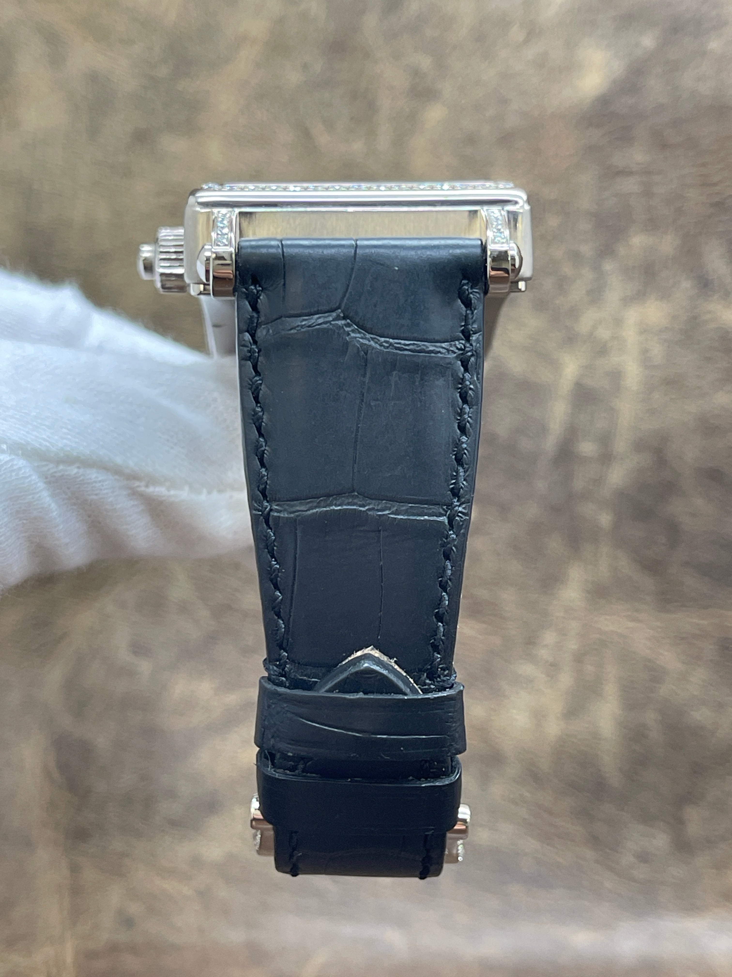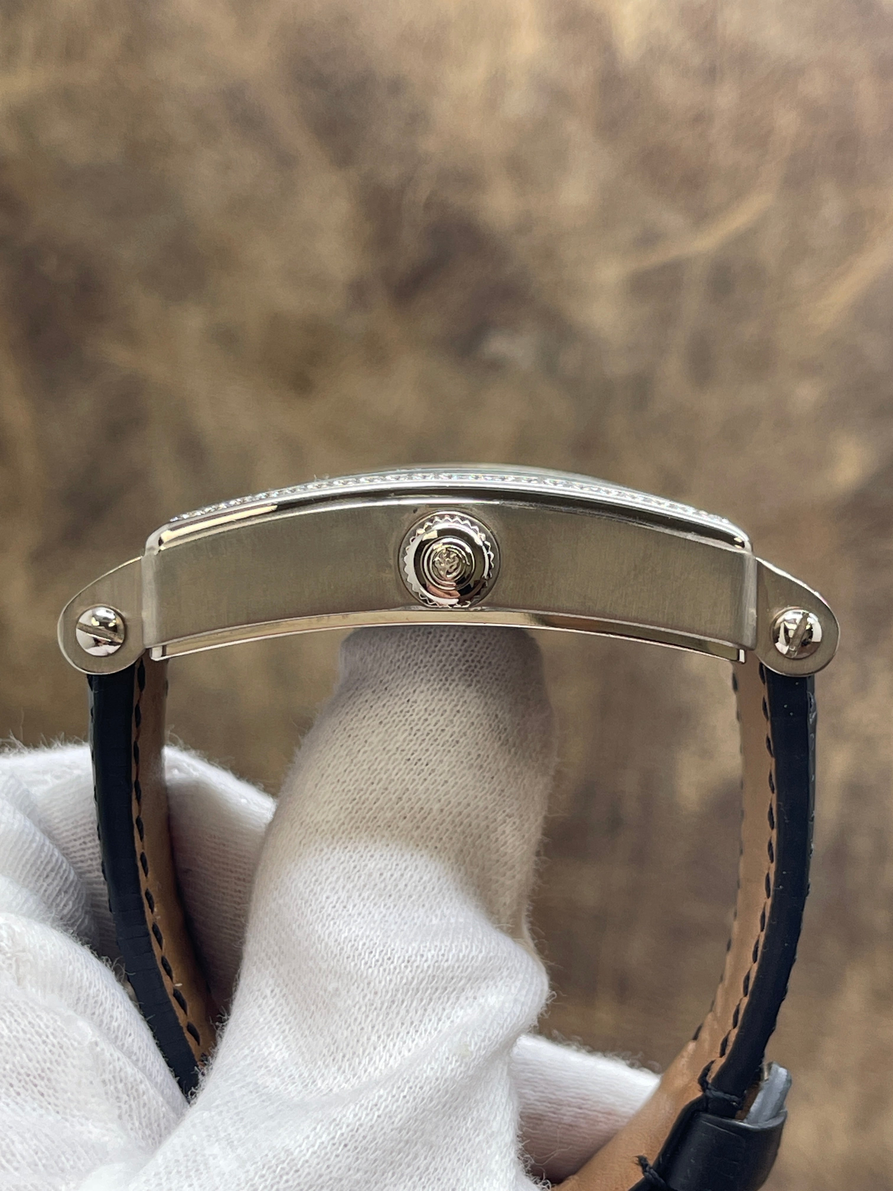 18k white gold case with a leather strap. Fixed 18k white gold bezel. Silver dial with blue dauphine-style hands and Roman hour markers. Dial type: analog. Caliber rd 28 manual wind movement with about 42 hours of power reserve. Sapphire crystal. Pull/push crown. See through case back. Case size: 32 x 44 mm. Case thickness: mm. Rectangular case shape. Band width: mm. 18k yellow gold tang set with diamonds clasp. Water resistant at none. Functions: hour, minute, chronograph. Roger Dubuis Monopusher 18K White Gold Diamonds Rare 28 L.E Much More Silver Dial Manual Wind Watch.