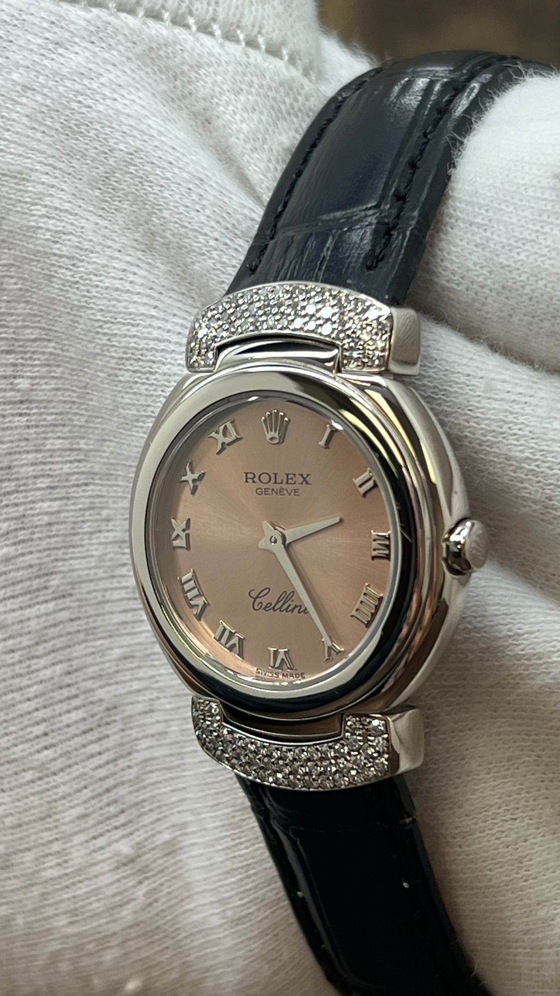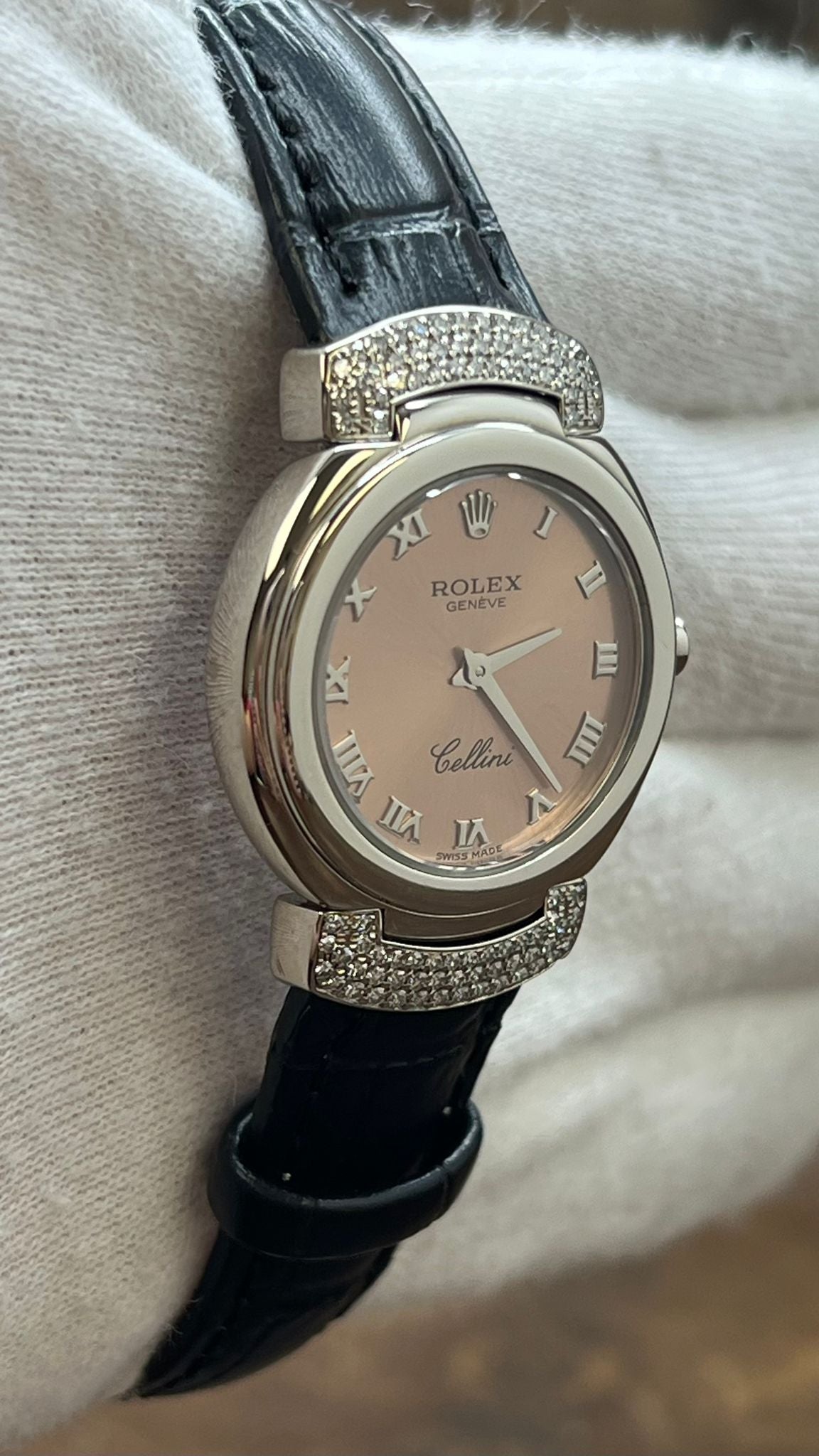 Rolex Cellini Cellissima Diamond Lugs 18K White Gold 6672 Salmon Roman Dial Quartz Women's Watch