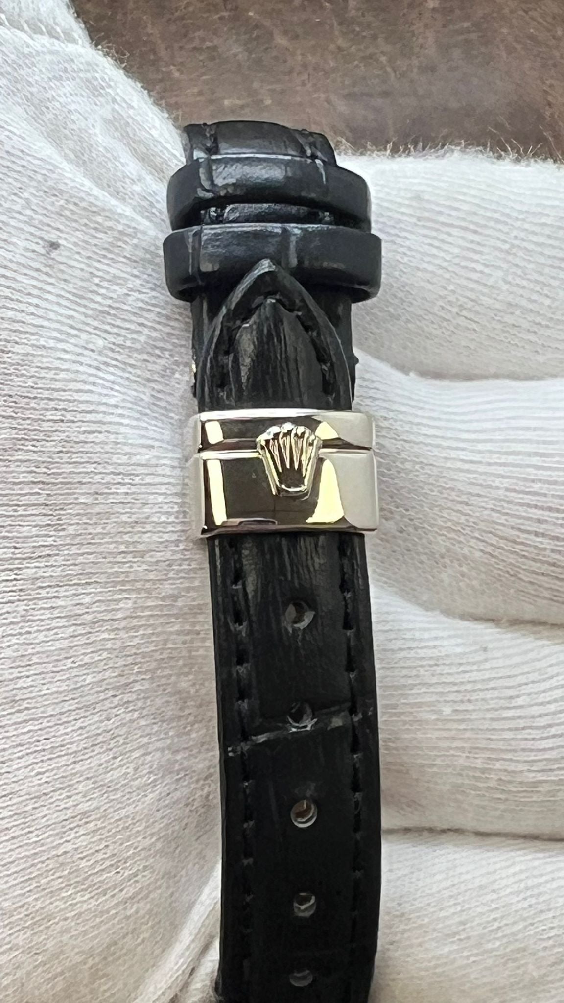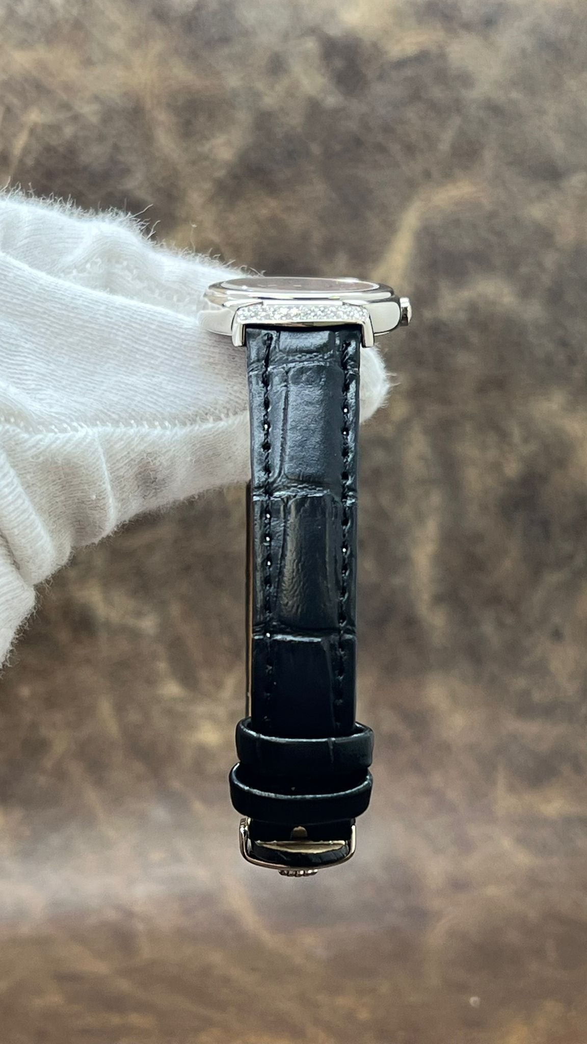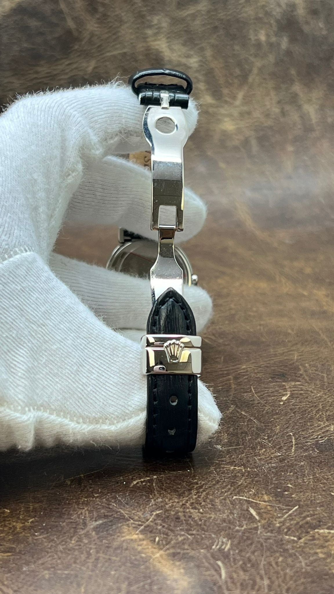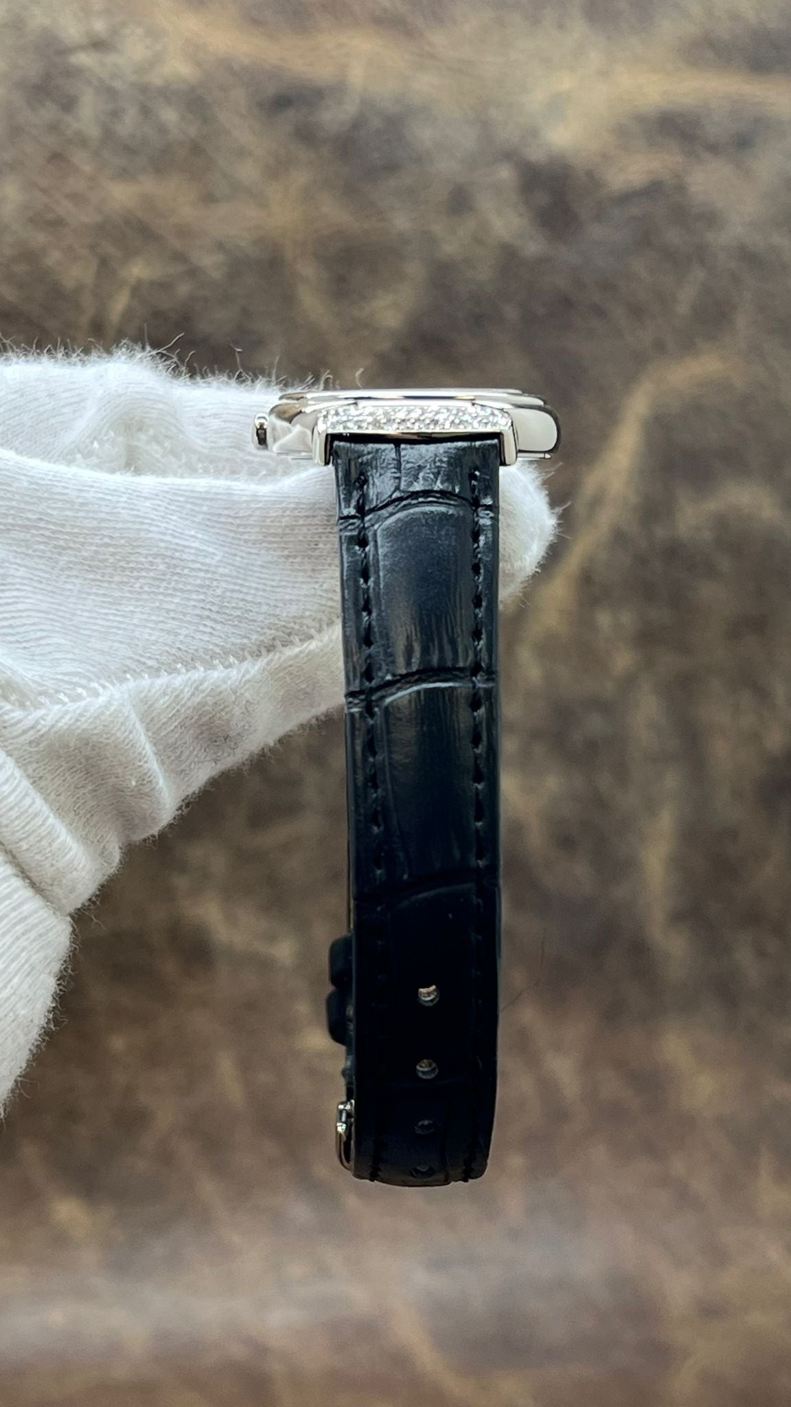 This pre-owned Rolex Cellini Cellissima Diamond Lugs 18K White Gold 6672 is in excellent condition and comes with: NO box or papers. The watch comes with a custom black leather strap on original 18K white gold deployment buckle. Max wrist size: 6.75 in.