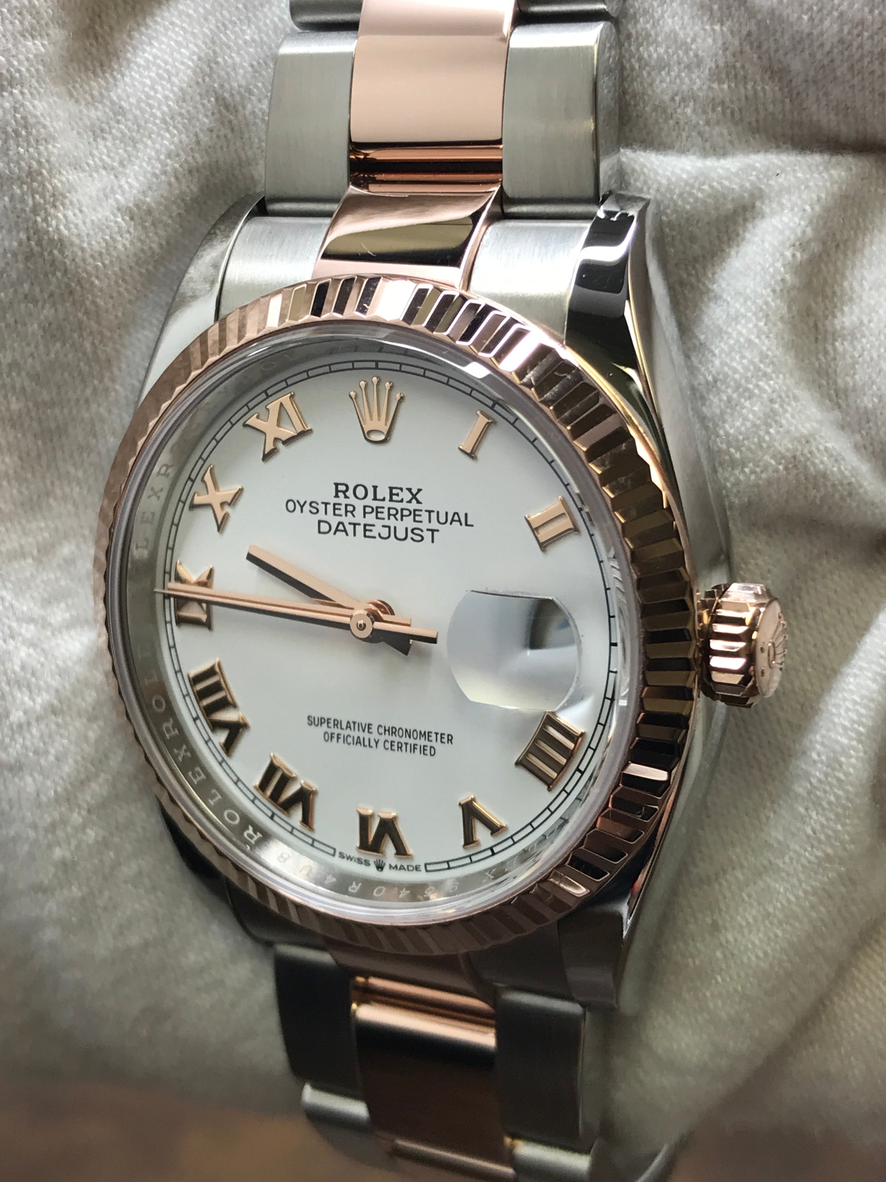 Stainless steel case with a steel & 18k gold oyster bracelet. Fixed 18k rose gold bezel. White dial with rose gold-tone hands and Roman numerals hour markers. Dial type: analog. Rolex calibre 3235 automatic movement with about 70 hours of power reserve. Scratch resistant sapphire crystal. Screw down crown. Solid case back. Case size: 36 mm. Case thickness: 12 mm. Round case shape. Band width: mm. Oysterlock clasp. Water resistant at 100 meters / 330 feet. Functions: hours, minutes, seconds, date. Rolex Datejust 36 126231 White Dial Automatic Watch.