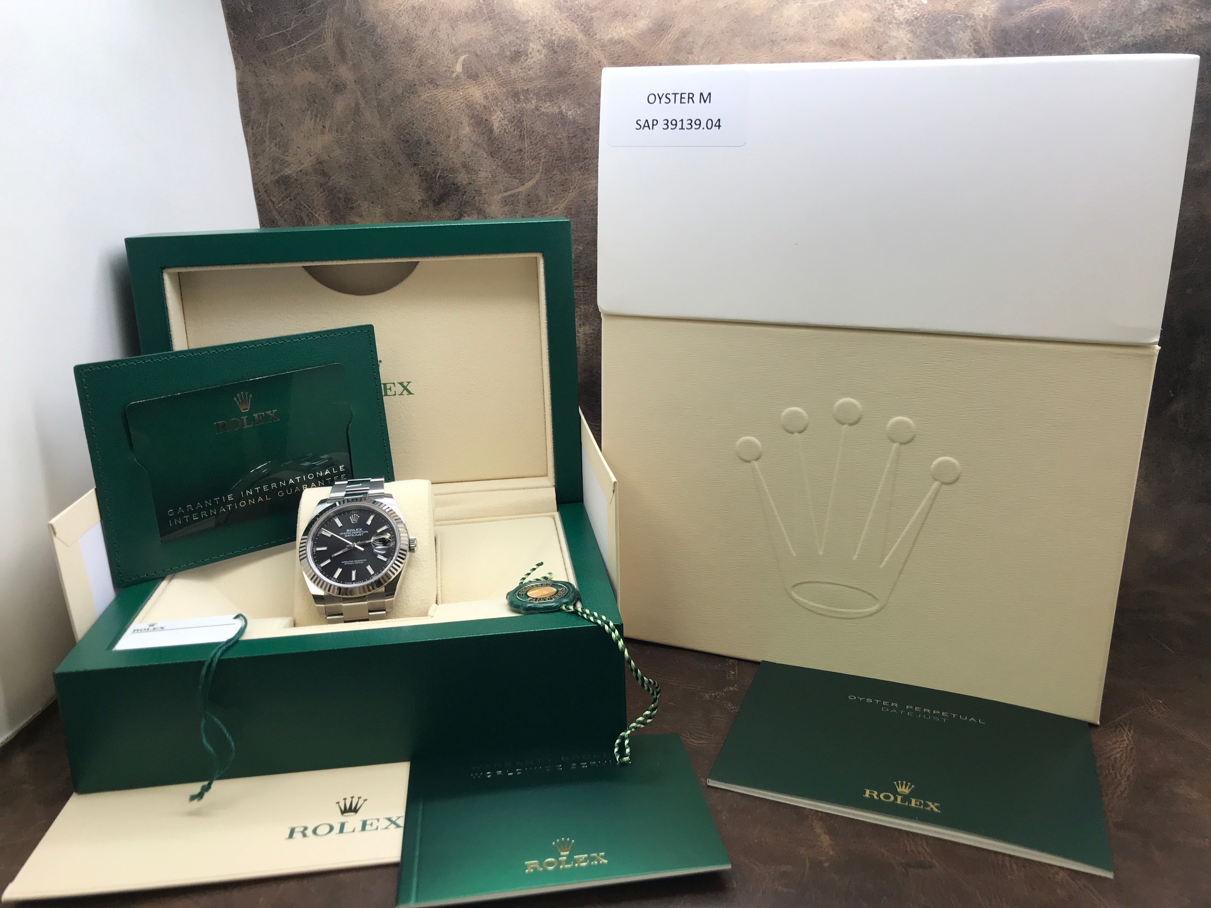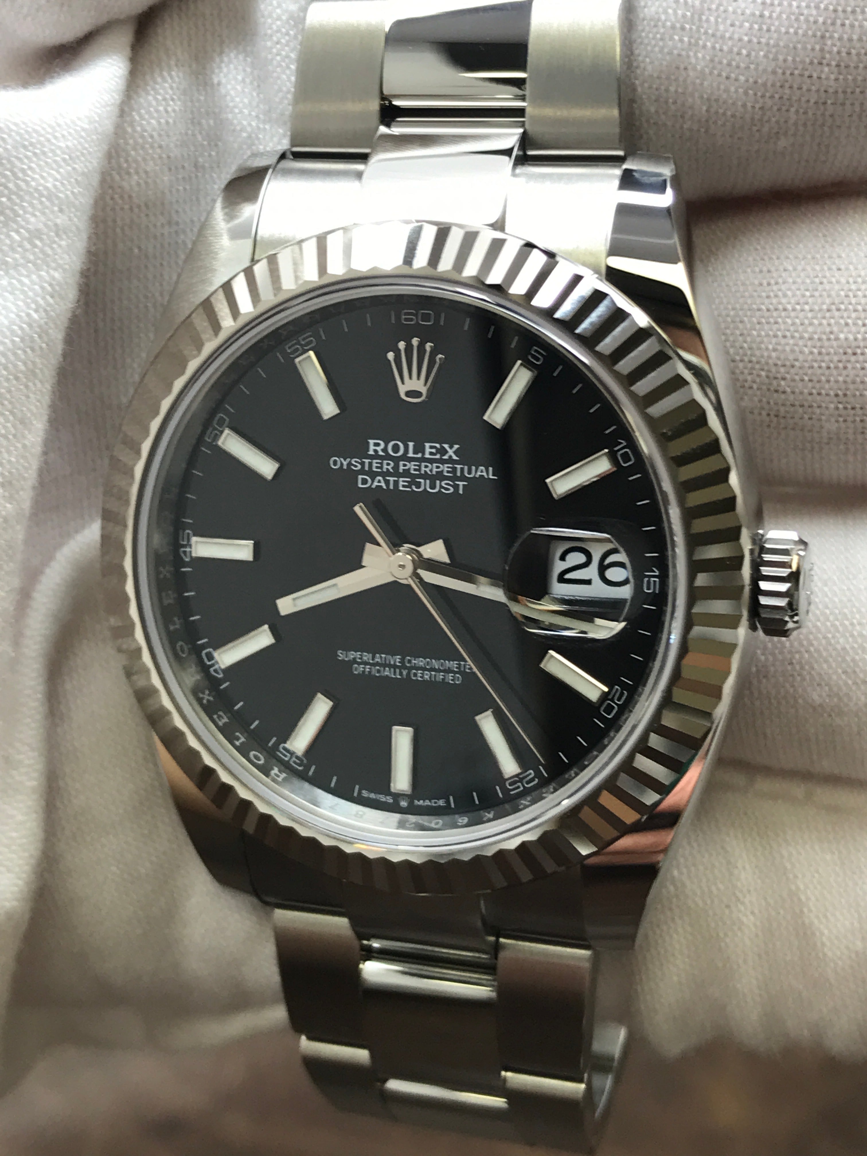 Stainless steel case with a stainless steel oyster bracelet. Fixed fluted 18k white gold bezel. Black dial with luminous silver-tone hands and index hour markers. Dial type: analog. Rolex cal. 3235 automatic movement with about 70 hours of power reserve. Scratch resistant sapphire crystal. Screw down crown. Solid case back. Case size: 41 mm. Case thickness: 12 mm. Round case shape. Band width: mm. Oysterlock clasp. Water resistant at 100m/330ft. Functions: hours, minutes, seconds, date. Rolex Datejust 41 126334 Black Dial Automatic Men's Watch.