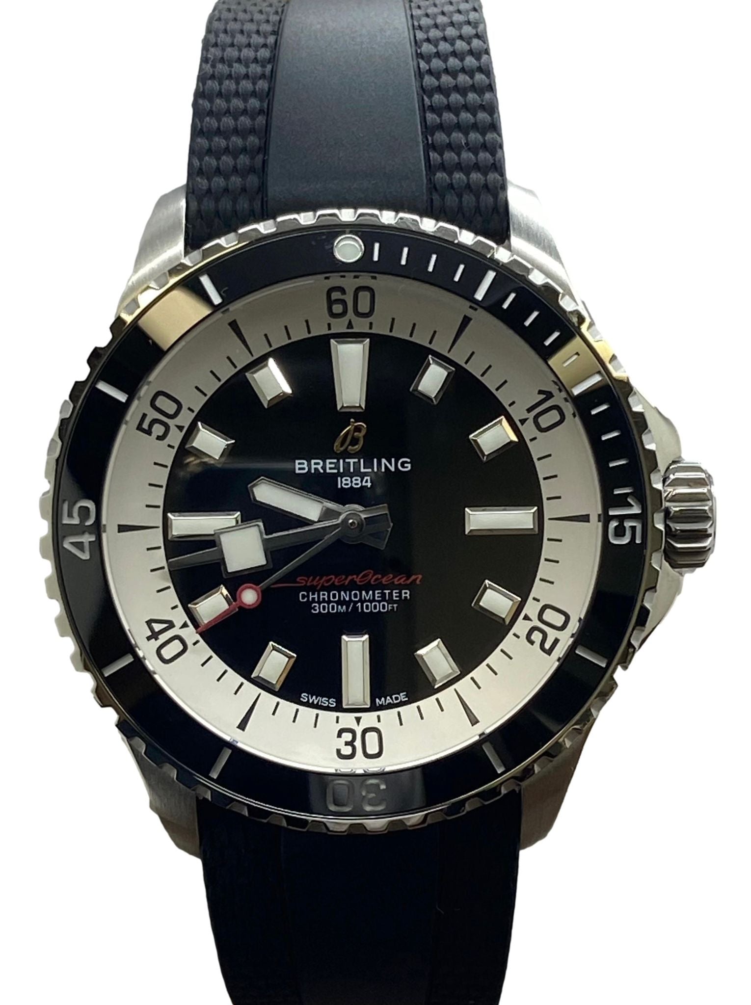 Stainless steel case with a rubber strap. Uni-directional rotating stainless steel with a ceramic top ring bezel. Black dial with luminous silver-tone hands and index hour markers. Dial type: analog. Breitling 17 automatic movement with about 38 hours of power reserve. Cambered sapphire, glareproofed both sides crystal. Screw-locked, two gaskets crown. Solid case back. Case size: 42 mm. Case thickness: 12.5 mm. Round case shape. Band width: mm. Fold over with push button release clasp. Water resistant at 300 meters / 1000 feet. Functions: hour, minute, seconds, chronometer. Breitling Superocean 42mm A17375 Black Dial Automatic Men's Watch.