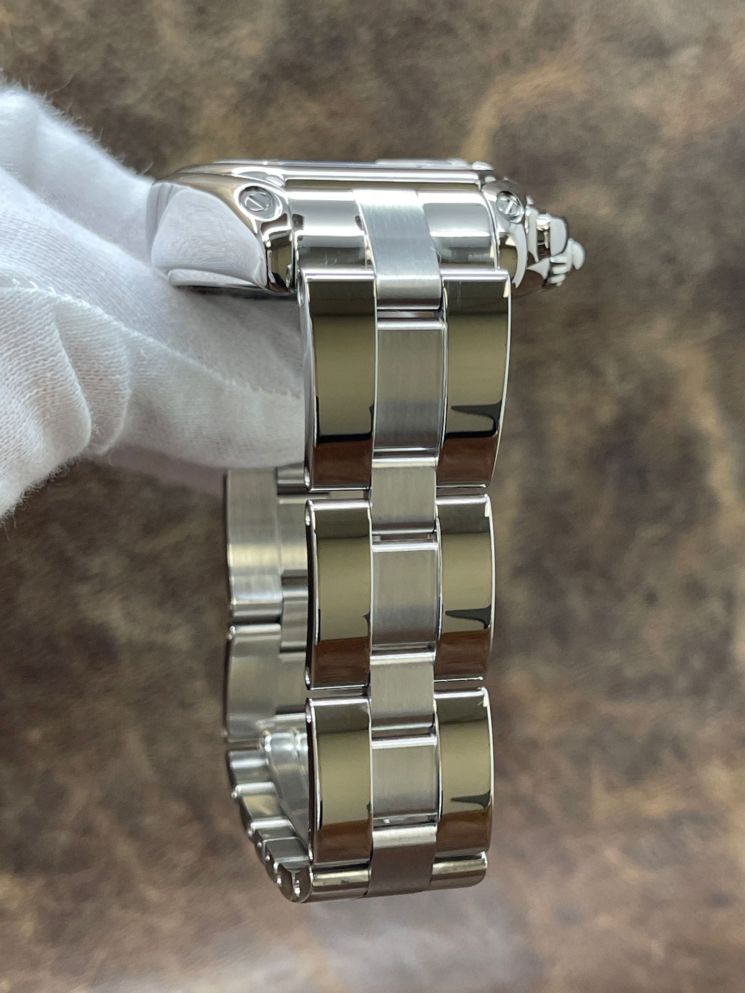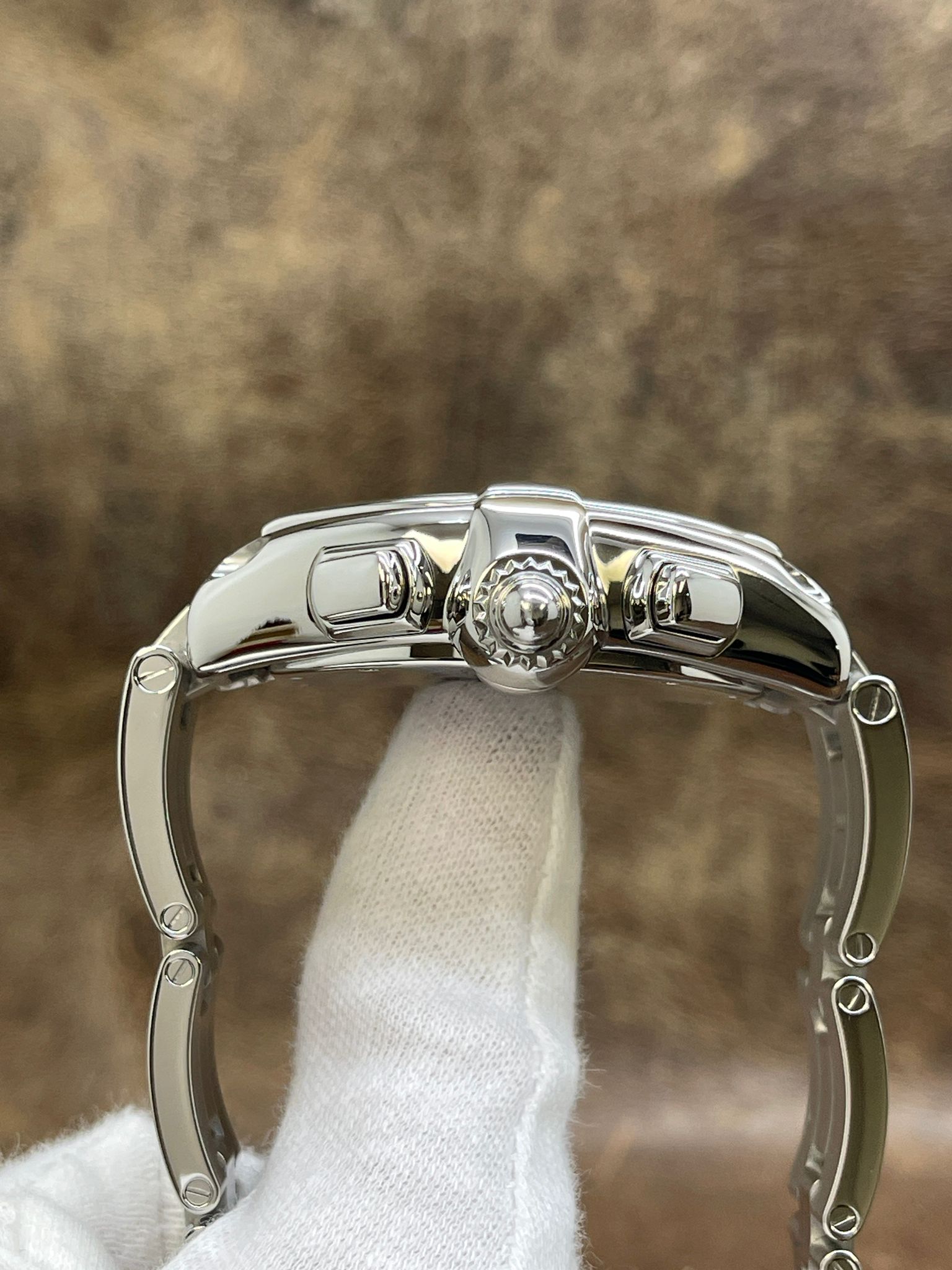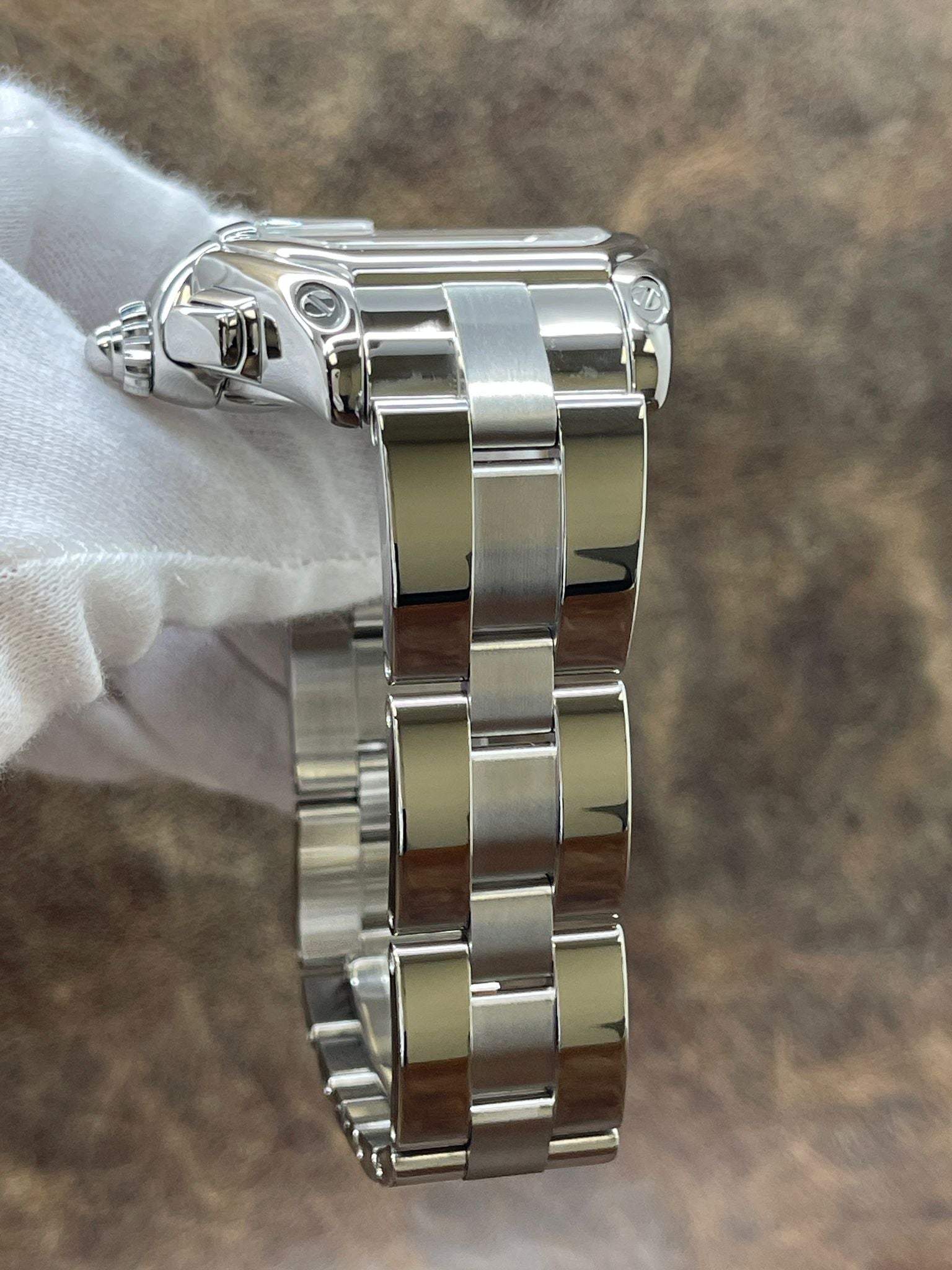 This pre-owned Cartier Roadster Chronograph XL 2618 is in excellent condition and comes with: original Cartier box & booklets. The watch is NOT waterproof. Max wrist size: 7.75 in.
