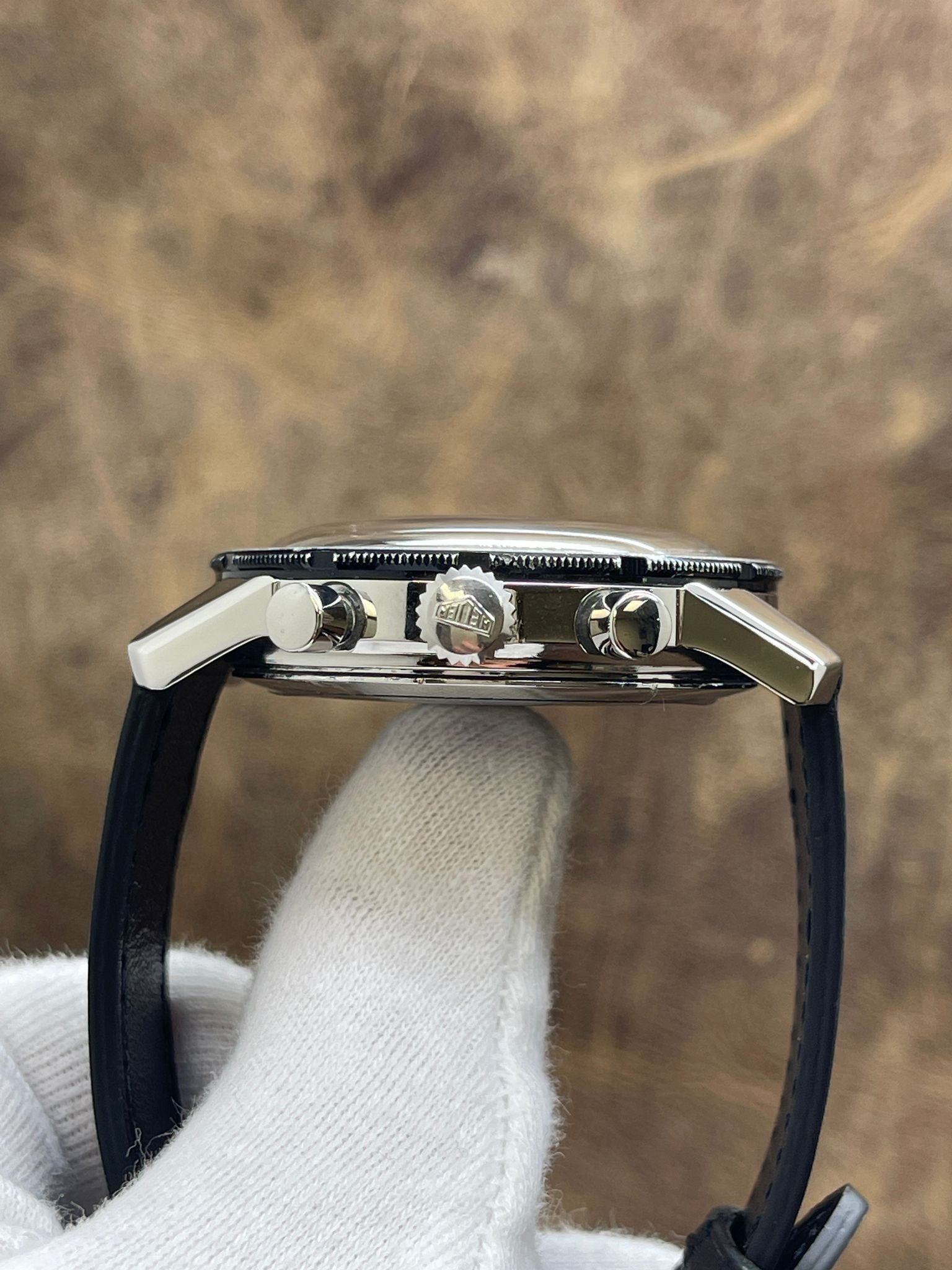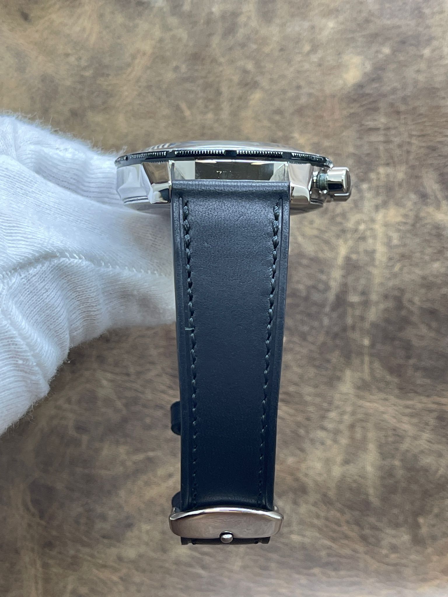 Stainless steel case with a custom leather strap custom leather. Bi-directional rotating with gmt markings stainless steel bezel. Black panda dial with luminous silver-tone hands and index hour markers. Dial type: analog. Heuer signed valjoux caliber 7730 hand wind movement with about of power reserve. Plexiglass crystal. Crown. Solid case back. Case size: 40 mm. Case thickness: 12.5 mm. Round case shape. Band width: mm. Custom steel tang clasp. Functions: chronograph, hour, minute, seconds. Heuer Autavia 7763 Black Panda Dial Hand Wind Men's Watch.