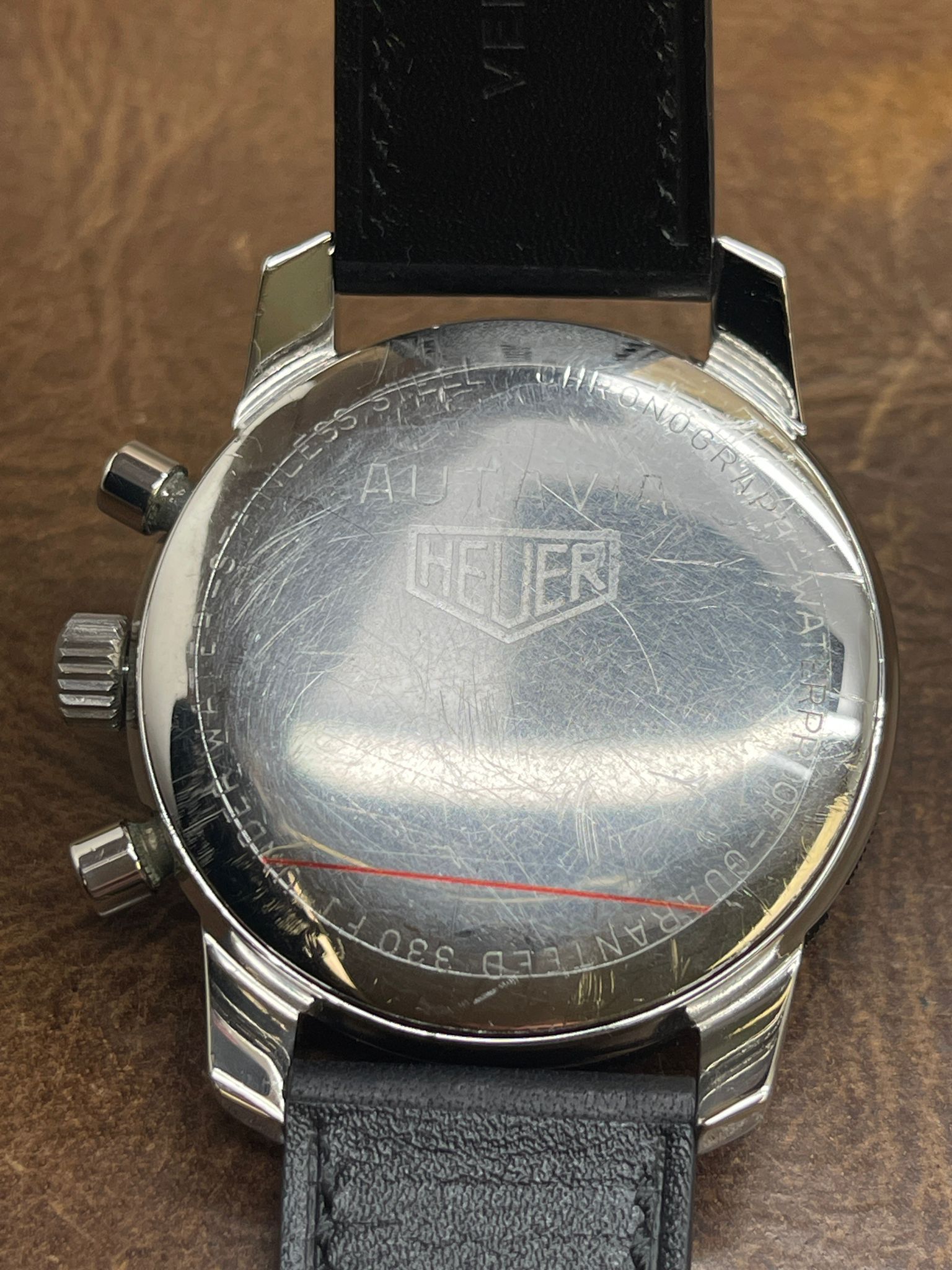 This pre-owned Heuer Autavia 7763 is in excellent condition and comes with: NO box or papers. The dial has signs of wear all over it - most significant are located between 5-8 & between 10-12 o'clock. The plexiglass crystal was replaced and it comes with a custom leather strap and steel tang buckle. The caseback is full of scratches as seen in the pictures, however, the original engravings are still visible. Max wrist size: 7.5 in.