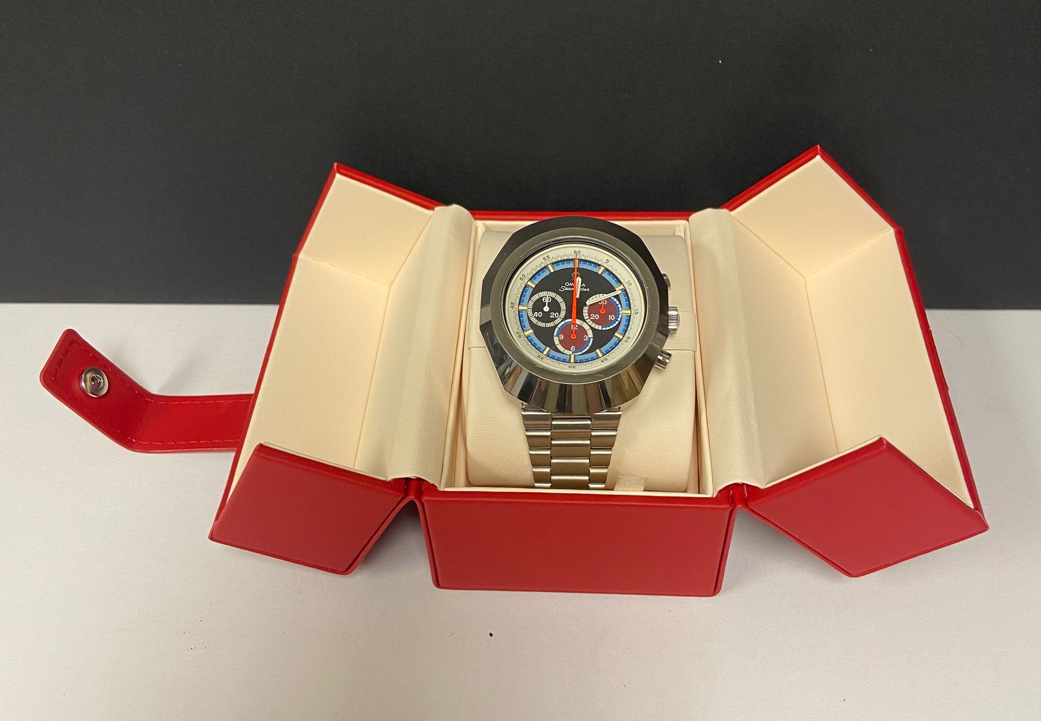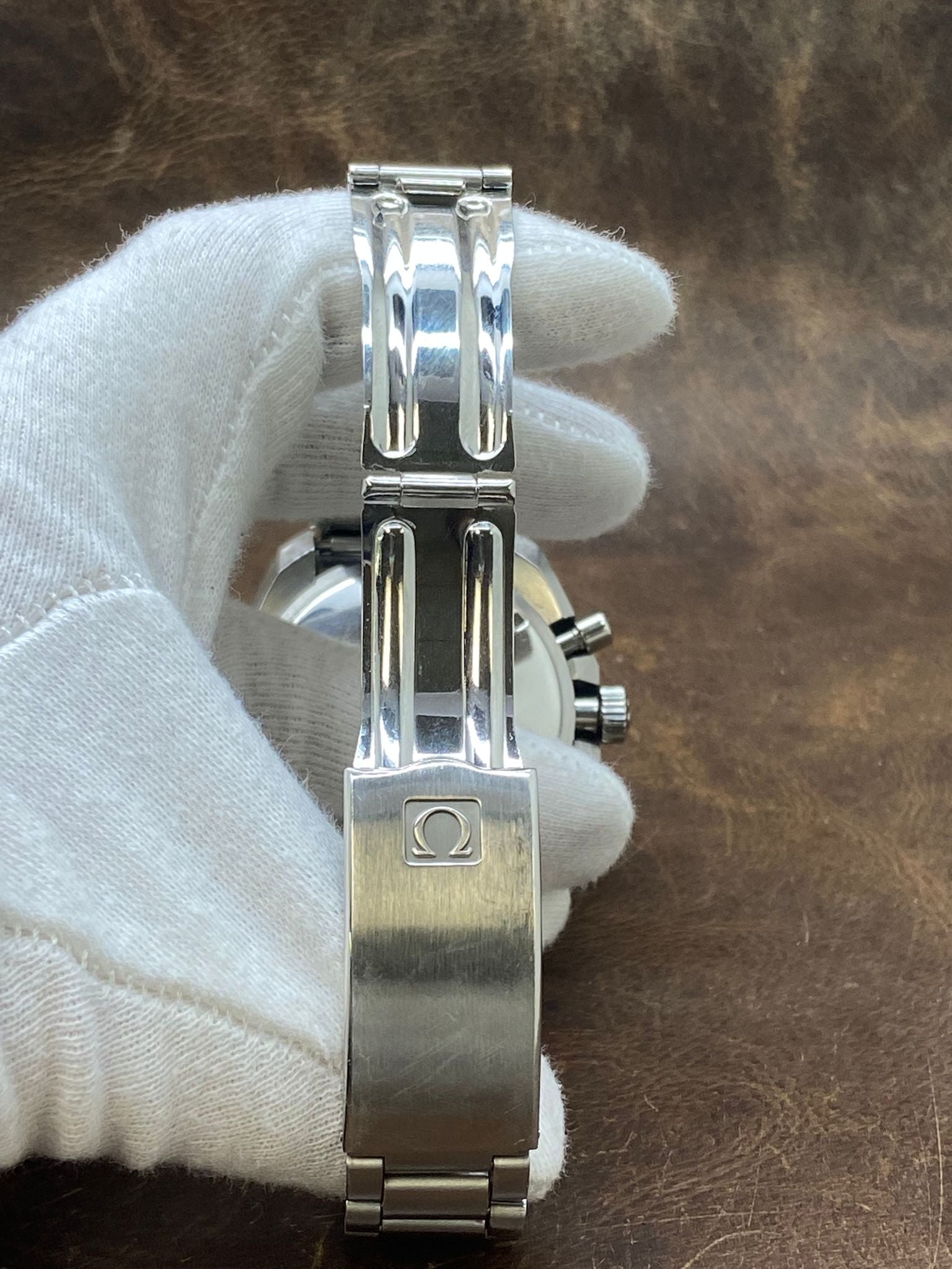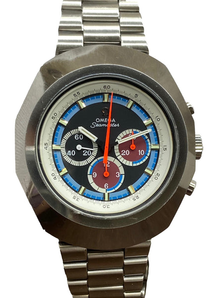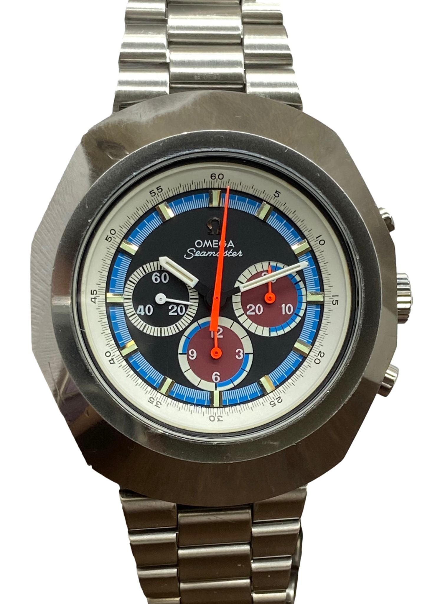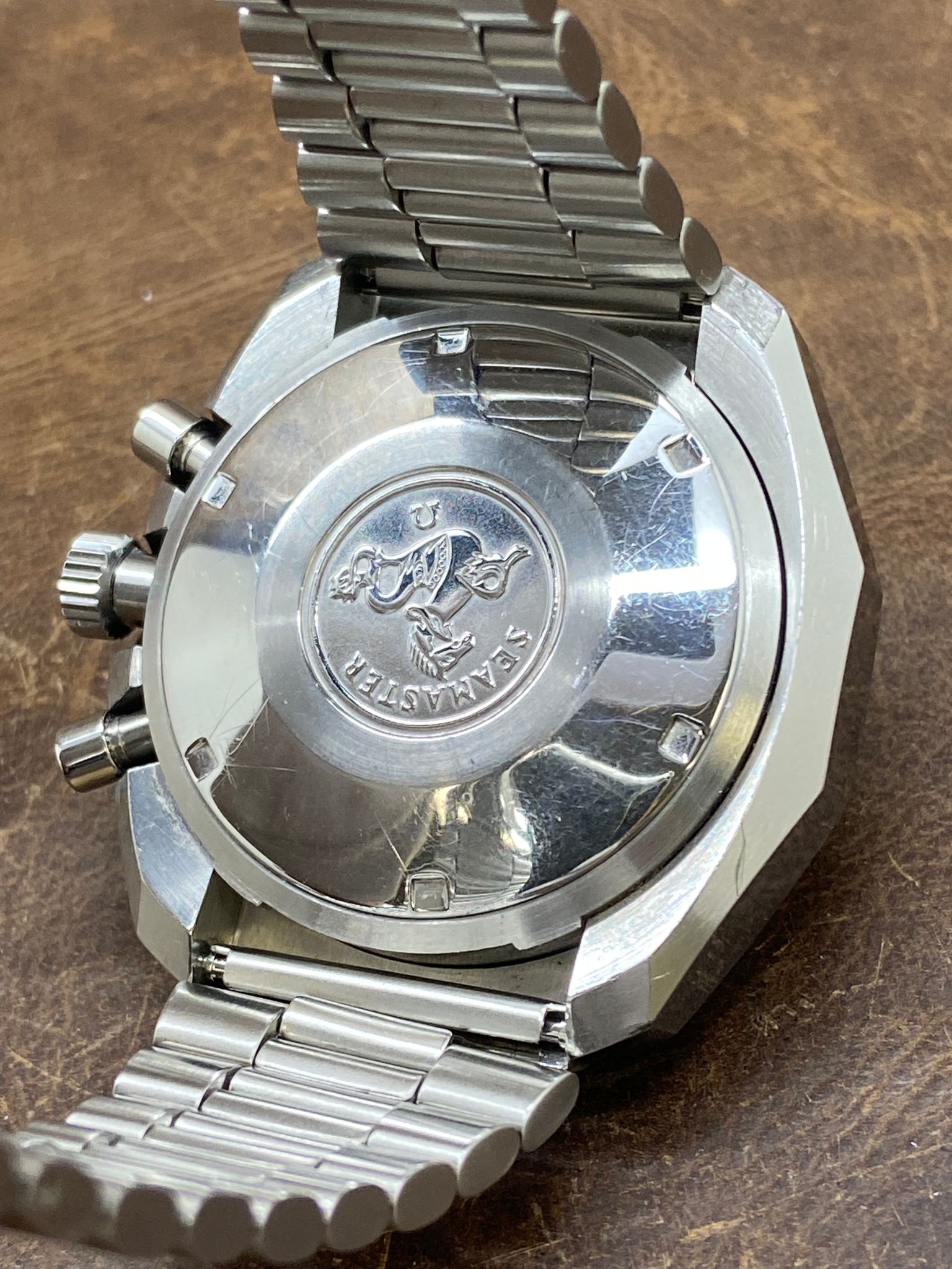 Tungsten-chrome case with a stainless steel bracelet. Fixed stainless steel bezel. Black dial with luminous white hands and index hour markers. Dial type: analog. Caliber 861 manual wind movement with about 48 hours of power reserve. Mineral glass crystal. Crown. Solid case back. Case size: 44 x 51 mm. Case thickness: 14.5 mm. Octagonal case shape. Band width: mm. Fold over clasp. Functions: chronograph, hour, minute, seconds. Omega Seamaster Anakin Skywalker 145.023 Black Dial Manual wind Men's Watch.