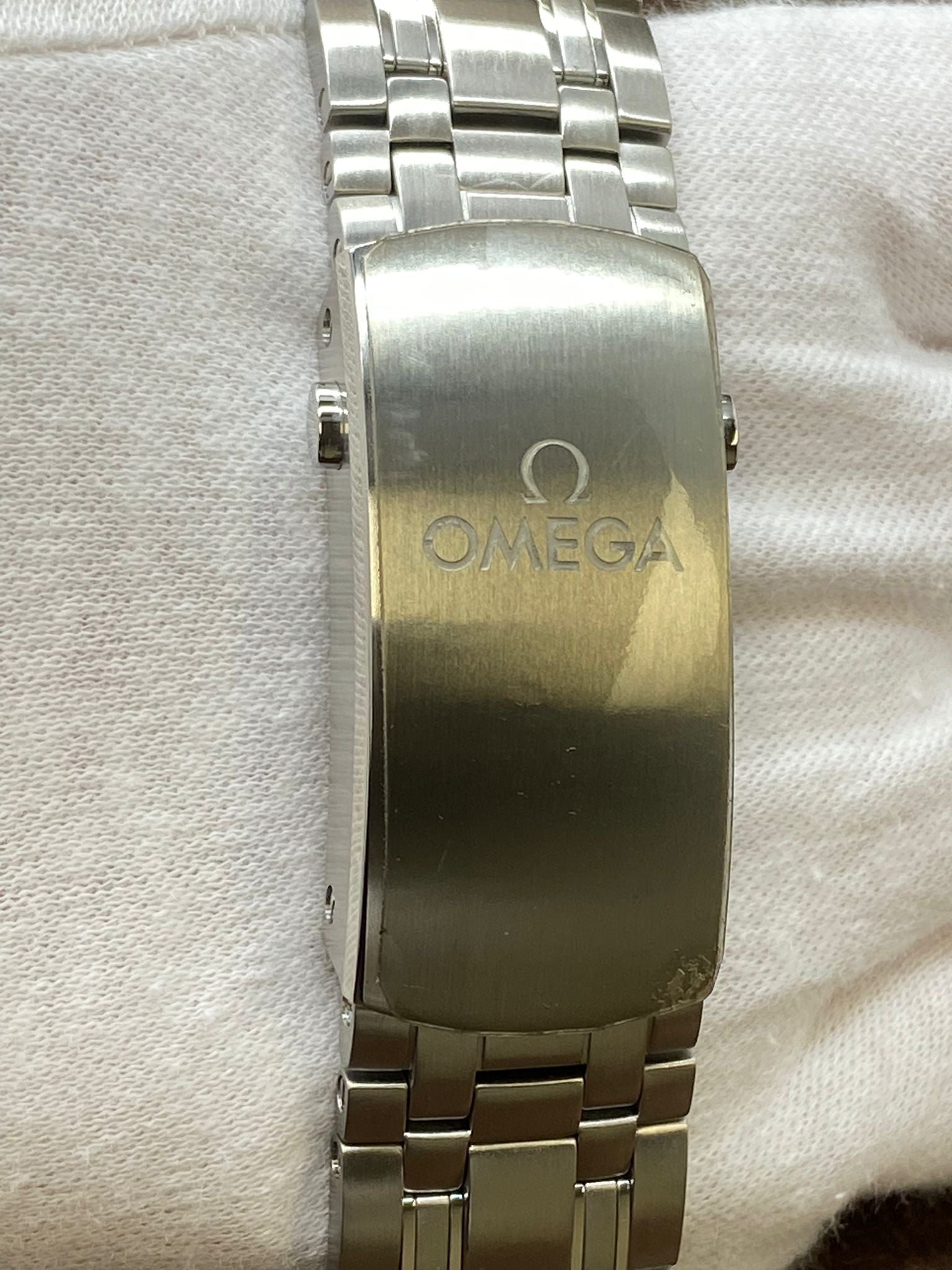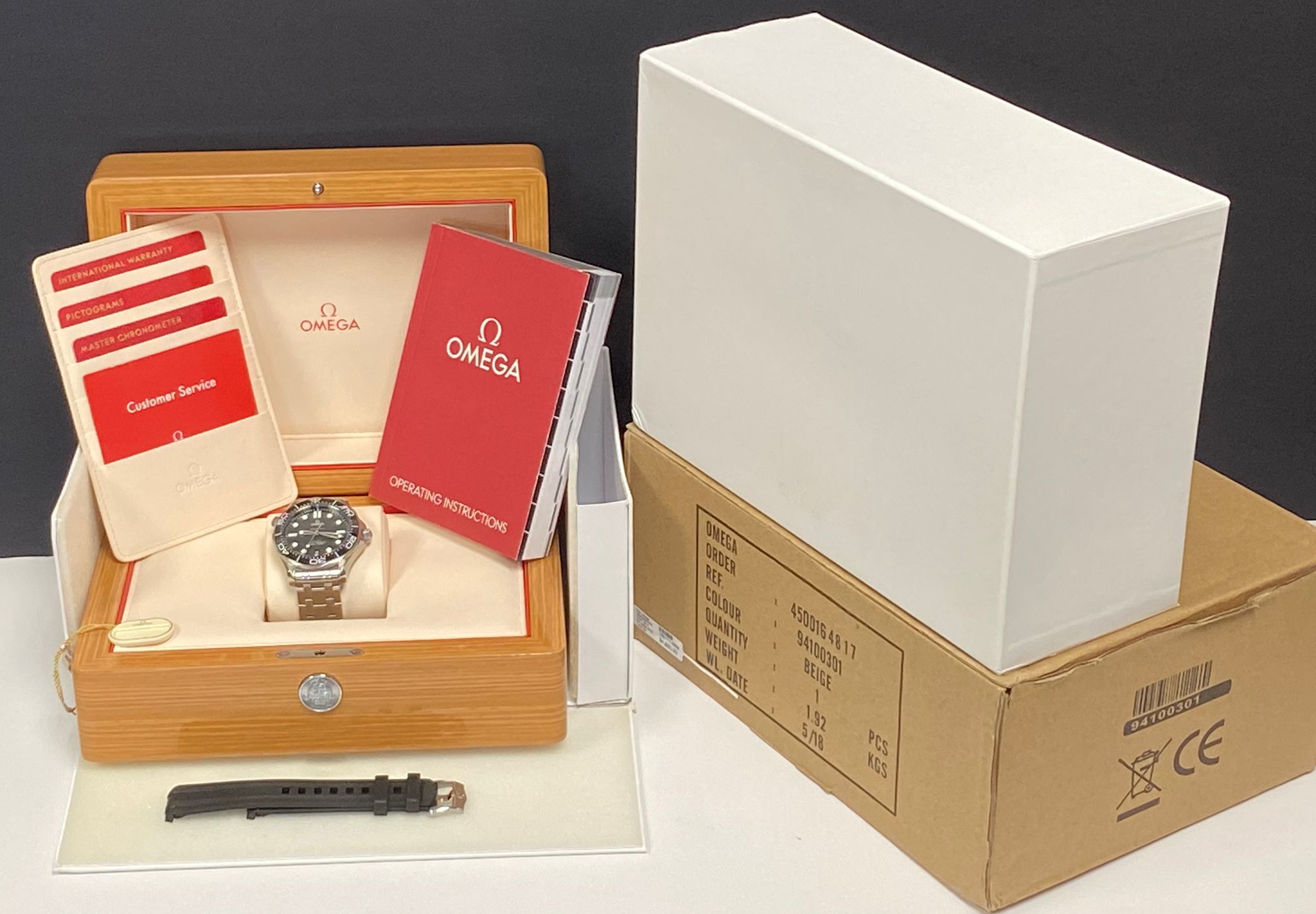 - original Omega double box, tags, booklets, extra rubber strap with tang buckle & matching pictograms, chronometer and warranty cards