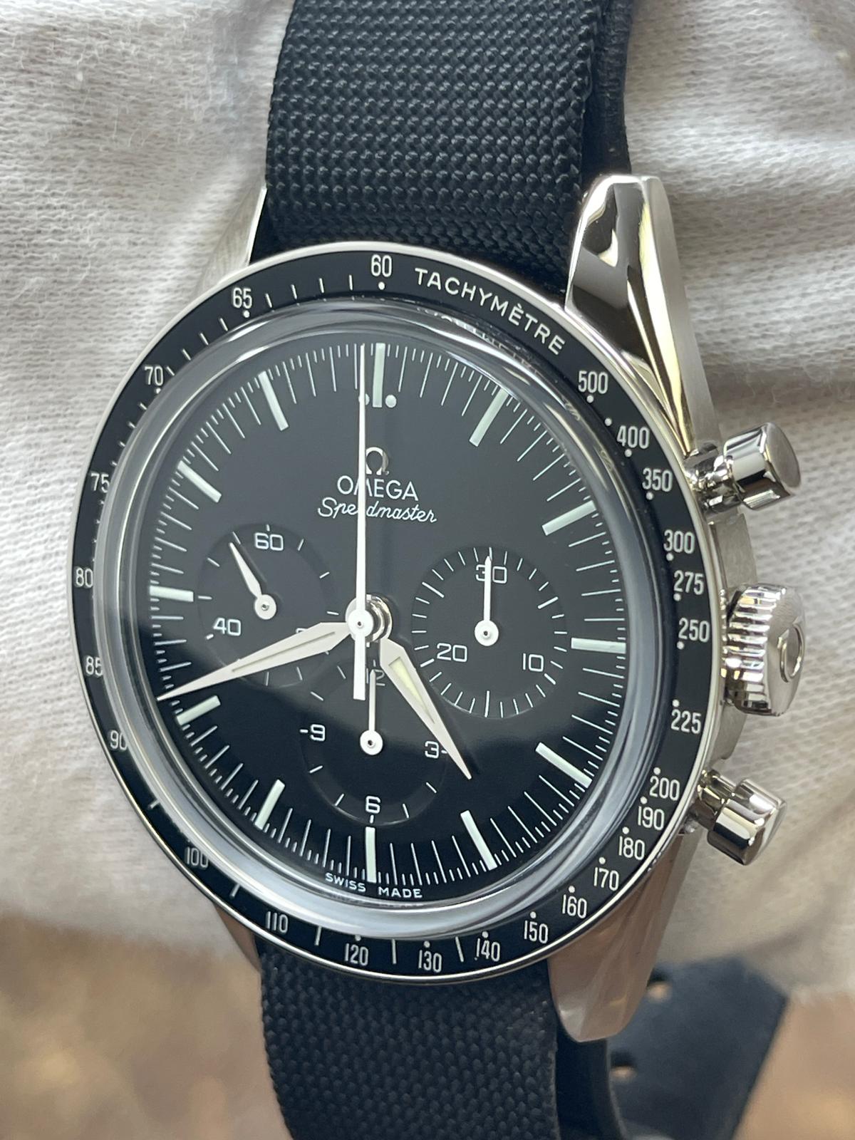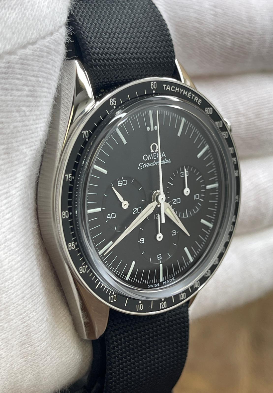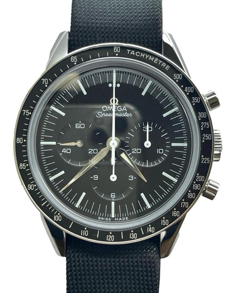 Stainless steel case with a grey polyester strap strap. Fixed tachymeter scale stainless steel bezel. Black dial with luminous silver-tone hands and index hour markers. Dial type: analog. Omega calibre 1861 manual wind movement with about 48 of power reserve. Scratch‑resistant sapphire crystal with anti‑reflective treatment inside crystal. Screw down crown. Solid case back. Case size: 39.7 mm. Case thickness: 14 mm. Round case shape. Band width: mm. Tang buckle clasp. Water resistant at not waterproof. Functions: chronograph, hour, minute, second, tachymeter. Omega Speedmaster Moonwatch FOIS 311.32.40.30.01.001 Black Dial Manual Wind Men's Watch.