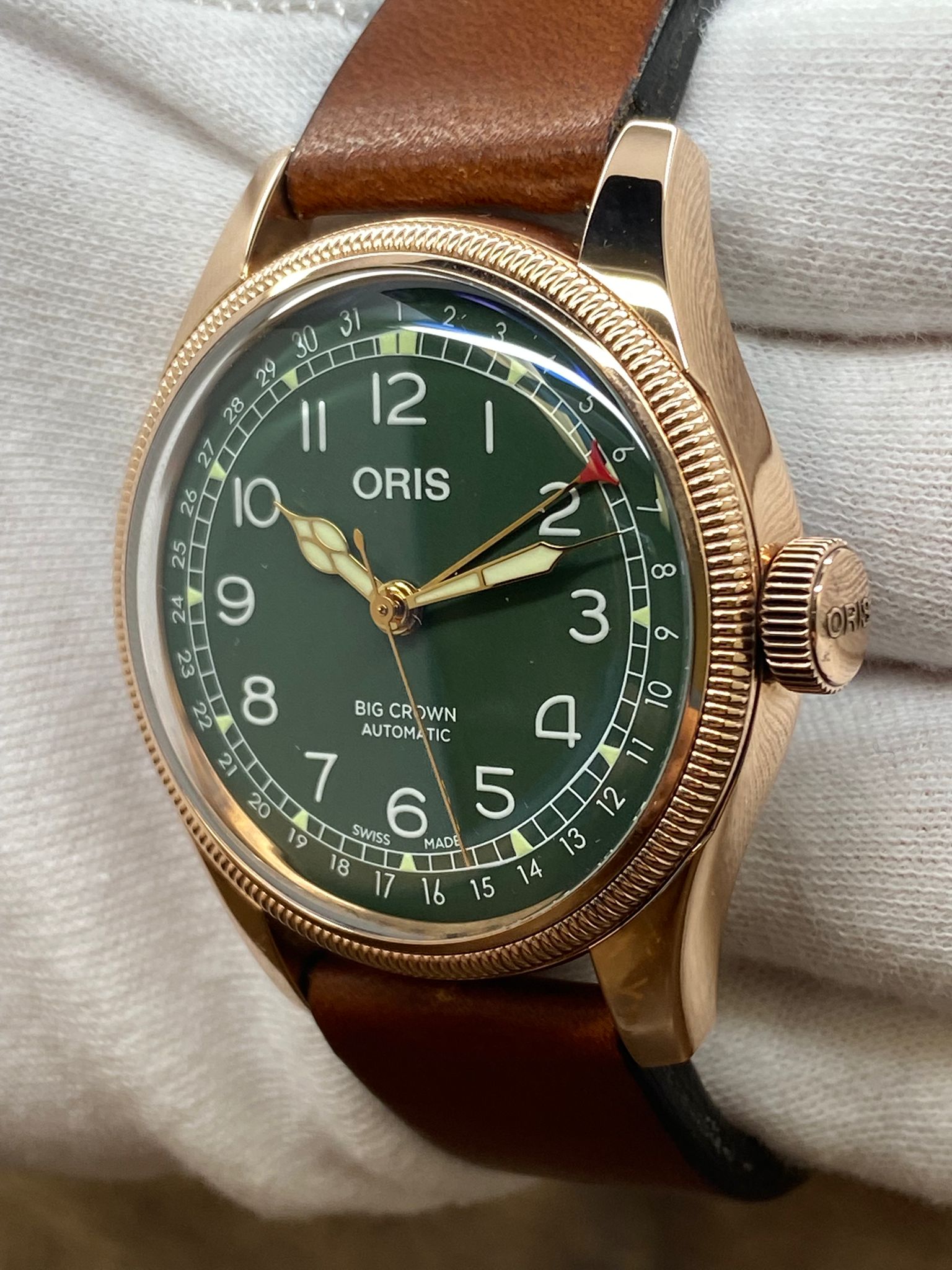 This pre-owned Oris Big Crown Pointer Date 80th Ann. Bronze 01 754 7741 3167 is in mint condition and comes with: original Oris double box, tag, booklets and matching warranty card.