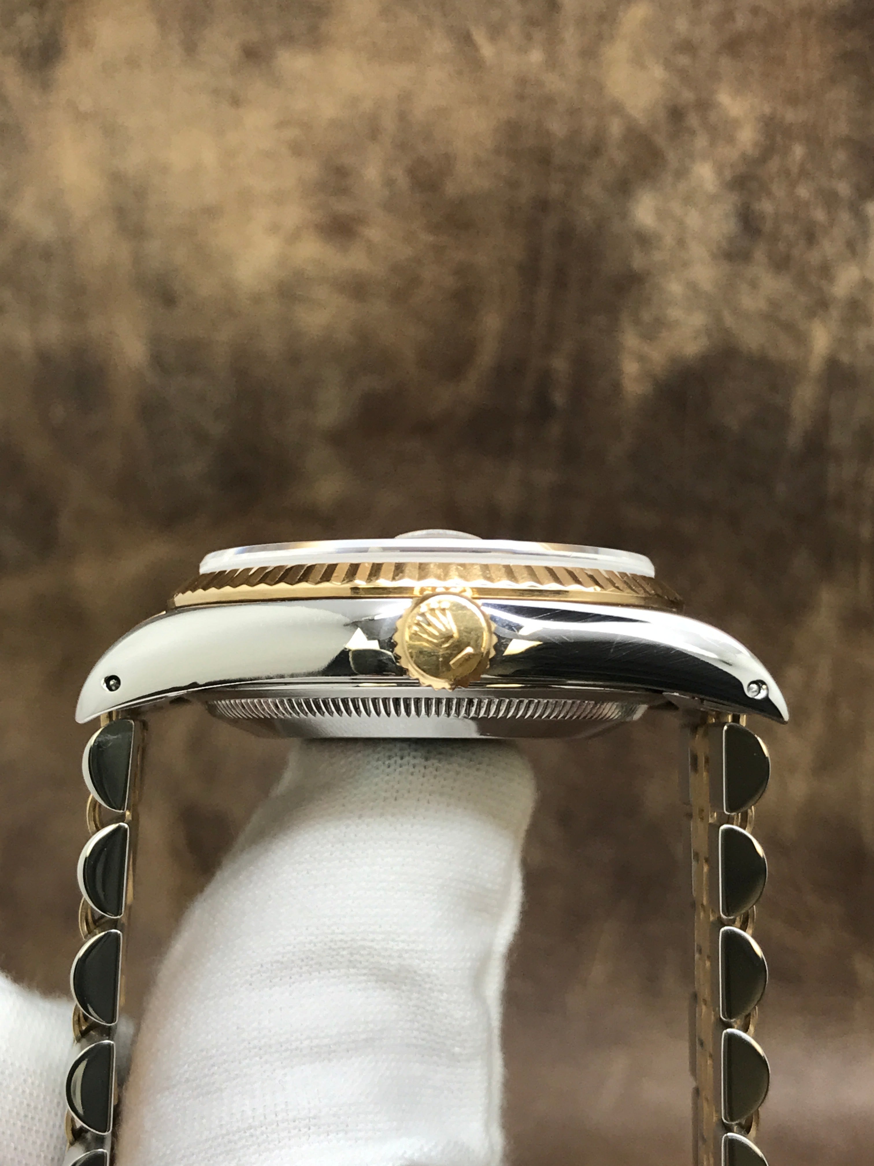 Stainless steel case with a stainless steel & 18k yellow gold jubilee bracelet. Fixed fluted 18k yellow gold bezel. Silver dial with luminous gold-tone hands and index hour markers. Dial type: analog. Luminescent hands and markers. Rolex calibre 3135 automatic movement with about 48 hours of power reserve. Sapphire crystal. Screw down crown. Solid case back. Case size: 36 mm. Case thickness: 12 mm. Round case shape. Band width: mm. Fold over w/ safety release clasp. Water resistant at 100 meters / 330 feet. Functions: date, hour, minute, second. Rolex Datejust 36mm 16233 Silver Dial Automatic Watch.