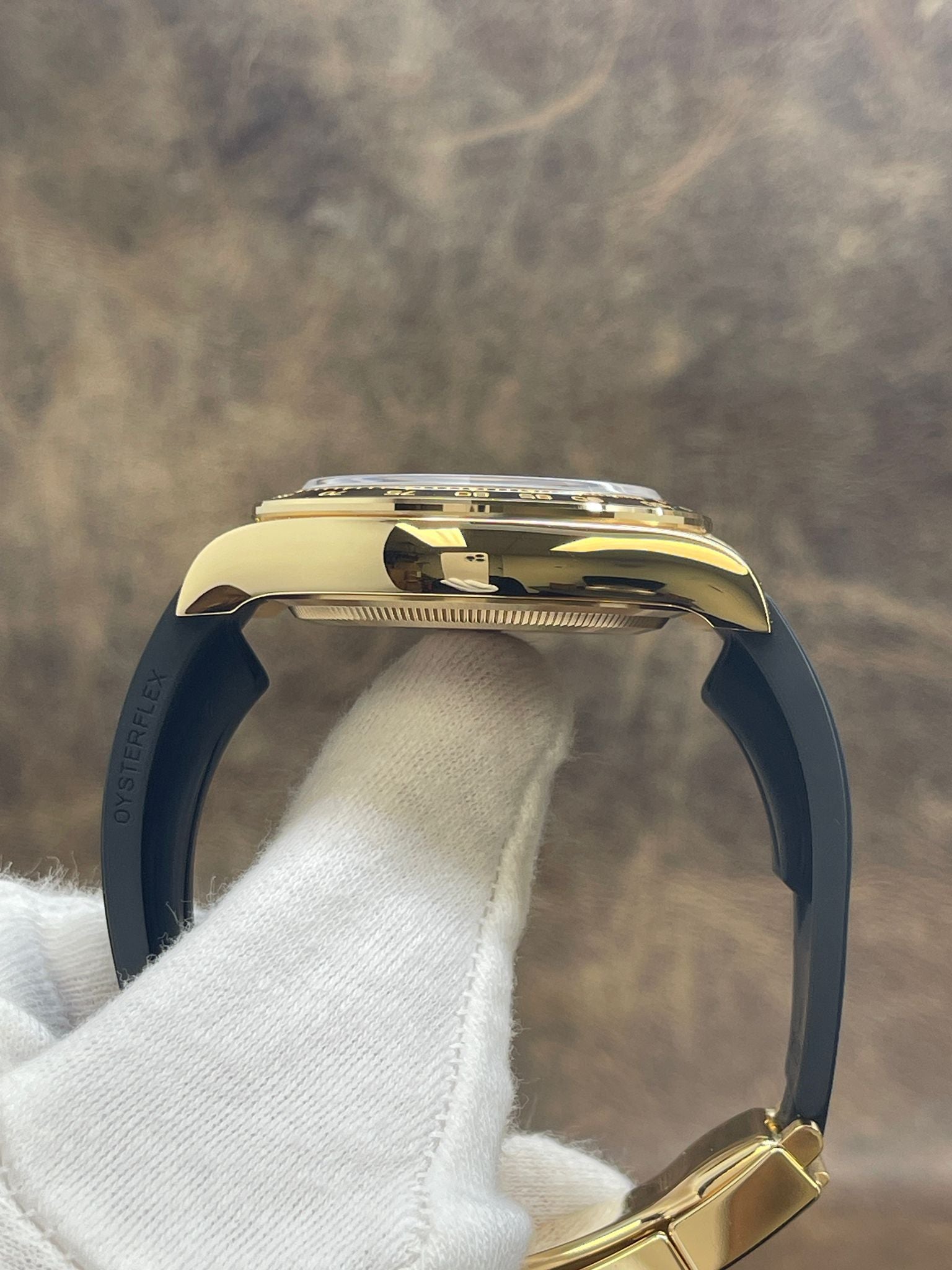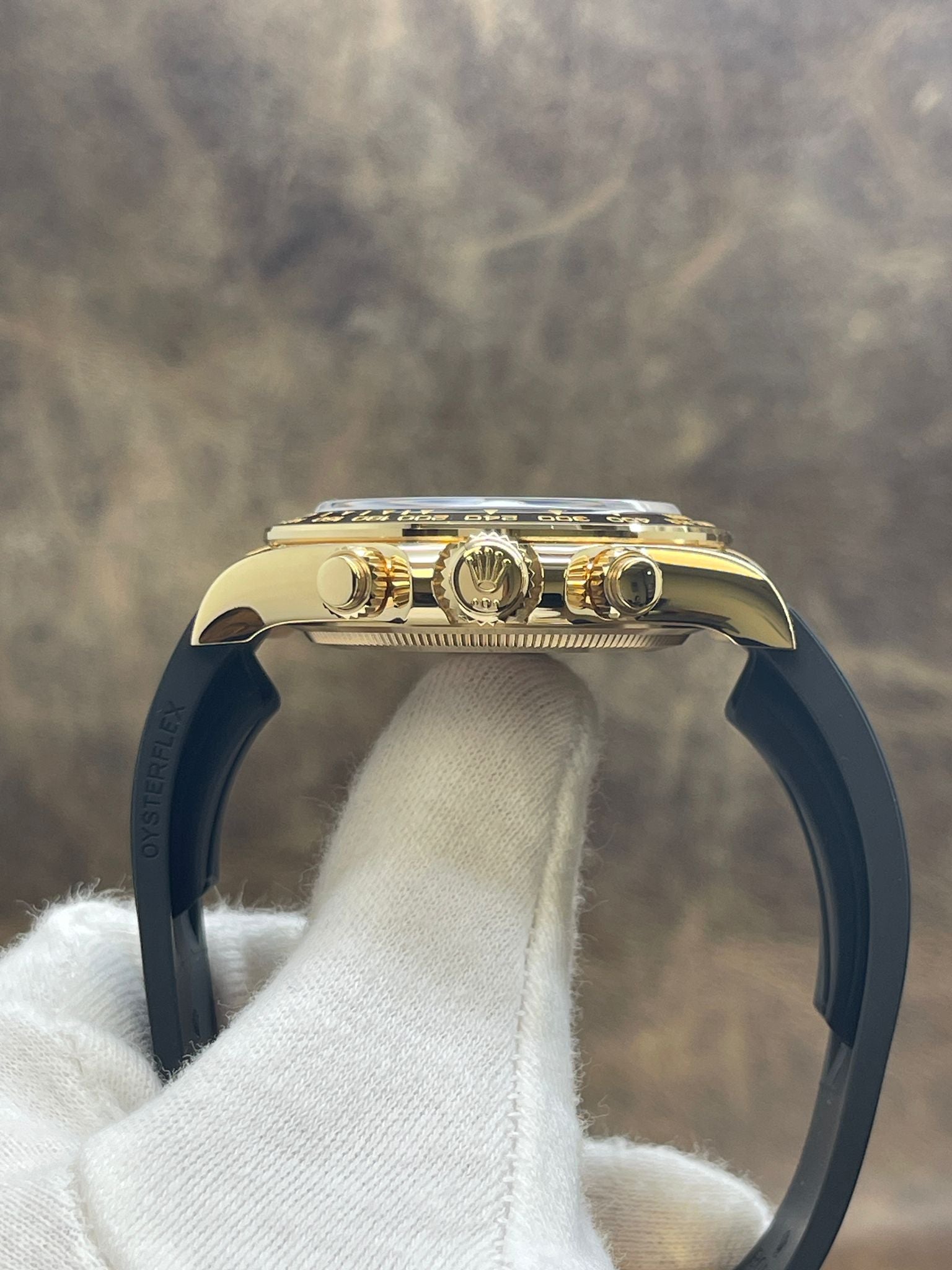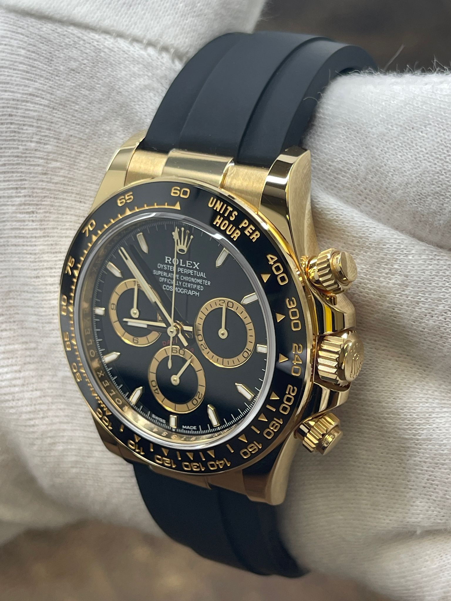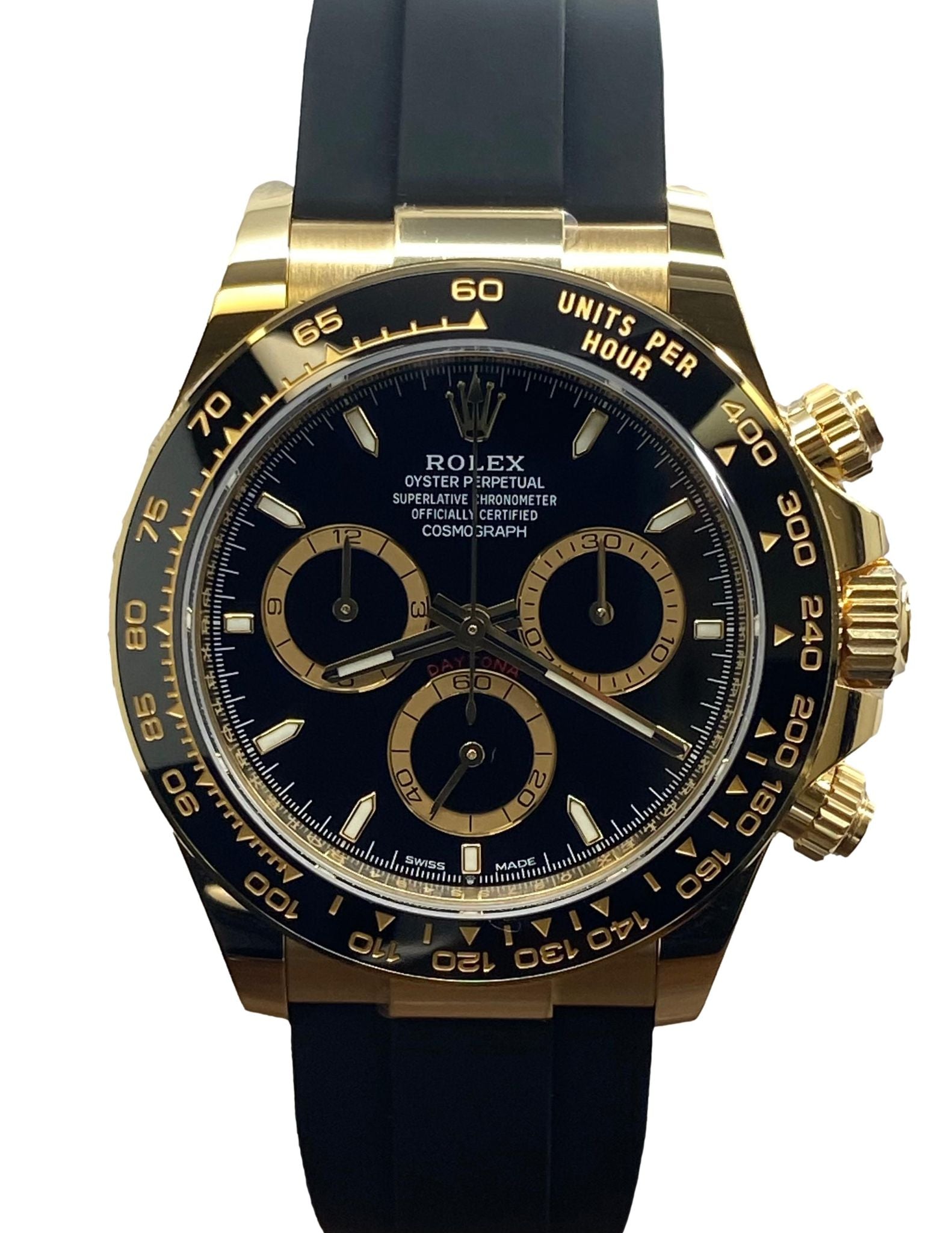 18k yellow gold case with a rubber rubber oysterflex. Cerachrom cerachrom bezel. Black dial with gold & luminous hands and index hour markers. Dial type: analog. Rolex calibre 4131 automatic movement with about 72 hours of power reserve. Sapphire crystal. Screw down crown. Solid case back. Case size: 40 mm. Case thickness: mm. Round case shape. Band width: mm. 18k yellow gold deployment clasp. Water resistant at 100 meters / 330 feet. Functions: chronograph, hours, minutes, seconds. Rolex Daytona OysterFlex Unworn 126518LN Black Dial Automatic Men's Watch.