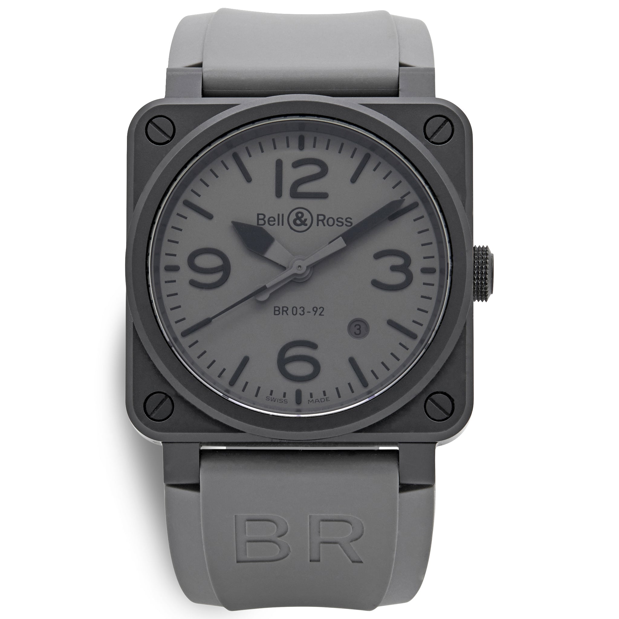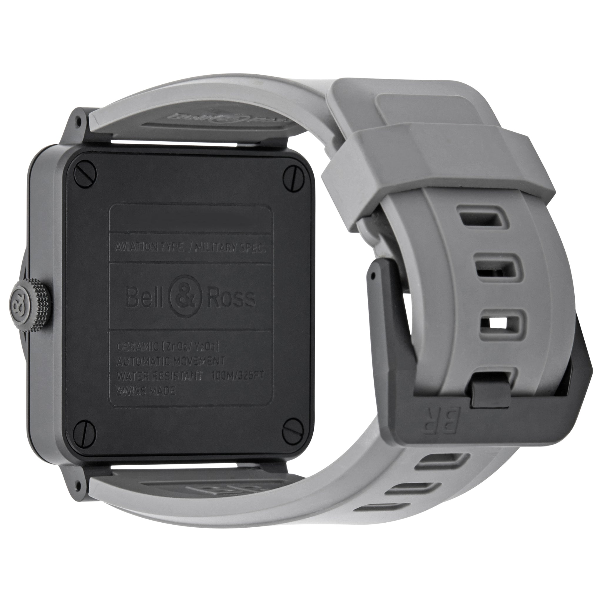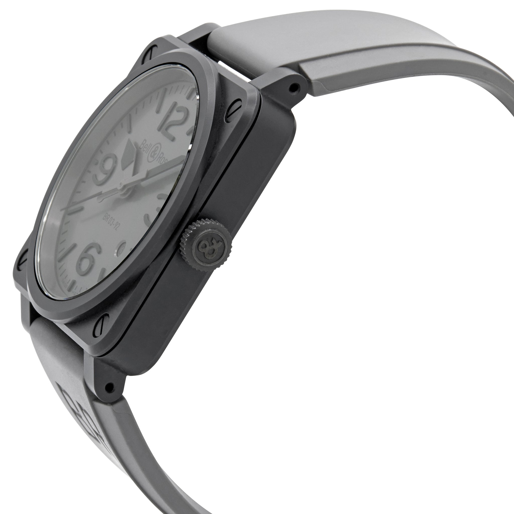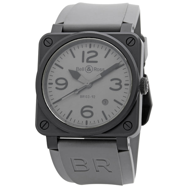 Stainless steel case with a rubber strap. Fixed ceramic bezel. Grey dial with black hands and index hour markers. Dial type: analog. Luminescent hands. Br-cal.302 automatic movement with about 40 hours of power reserve. Scratch resistant sapphire crystal. Pull/push crown. Solid case back. Case size: 42 mm. Case thickness: 9 mm. Square case shape. Band width: mm. Tang clasp. Water resistant at 100 meters / 330 feet. Functions: date, hour, minute, seconds. Bell & Ross BR-03 GOLDEN HERITAGE BR03-92 Grey Dial Automatic Men's Watch.