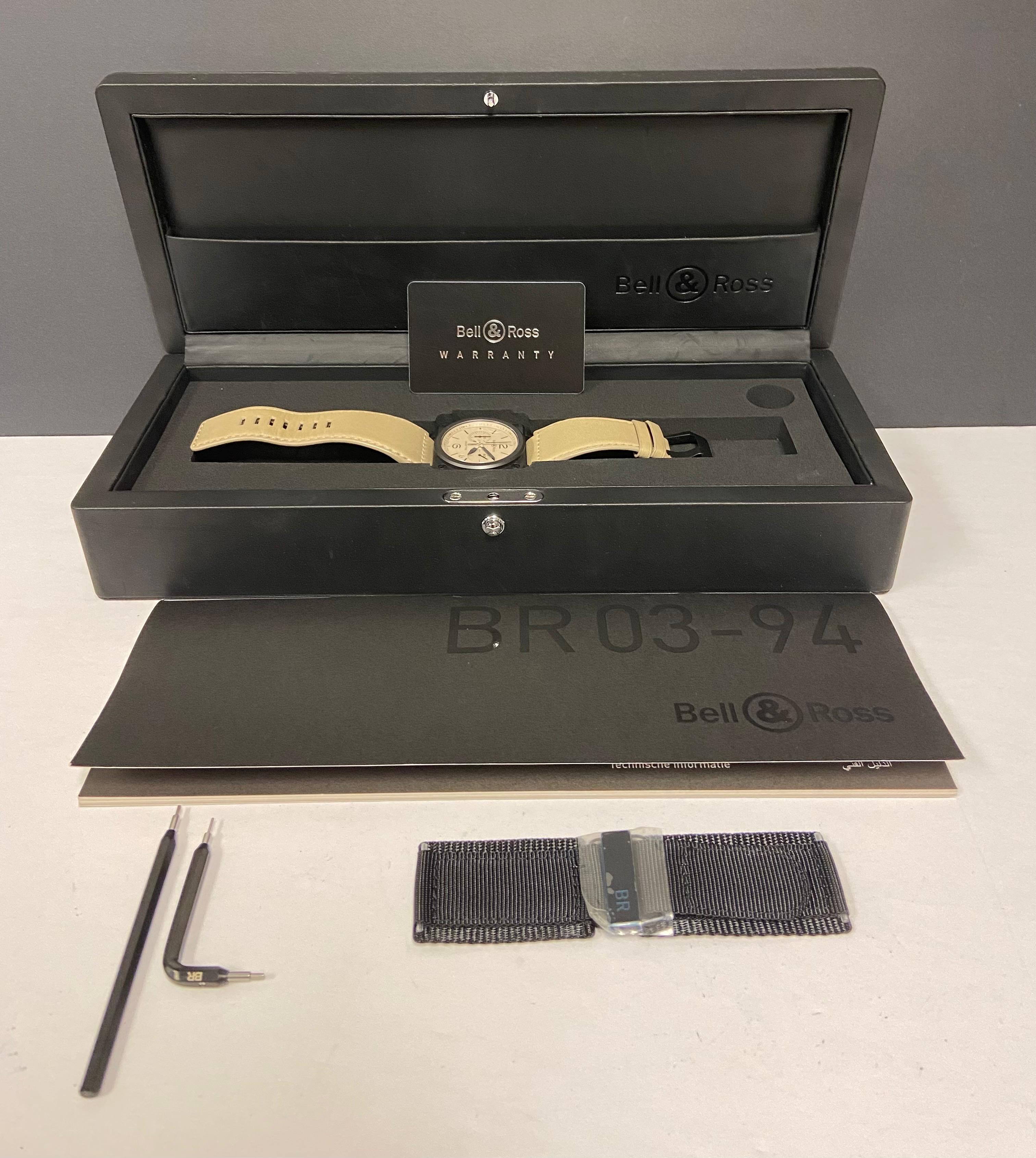 This pre-owned Bell & Ross Desert Type BR03-94-CBL is in excellent condition and comes with: original Bell & Ross double box, extra strap, tools and warranty card. Max wrist size: 8 in.