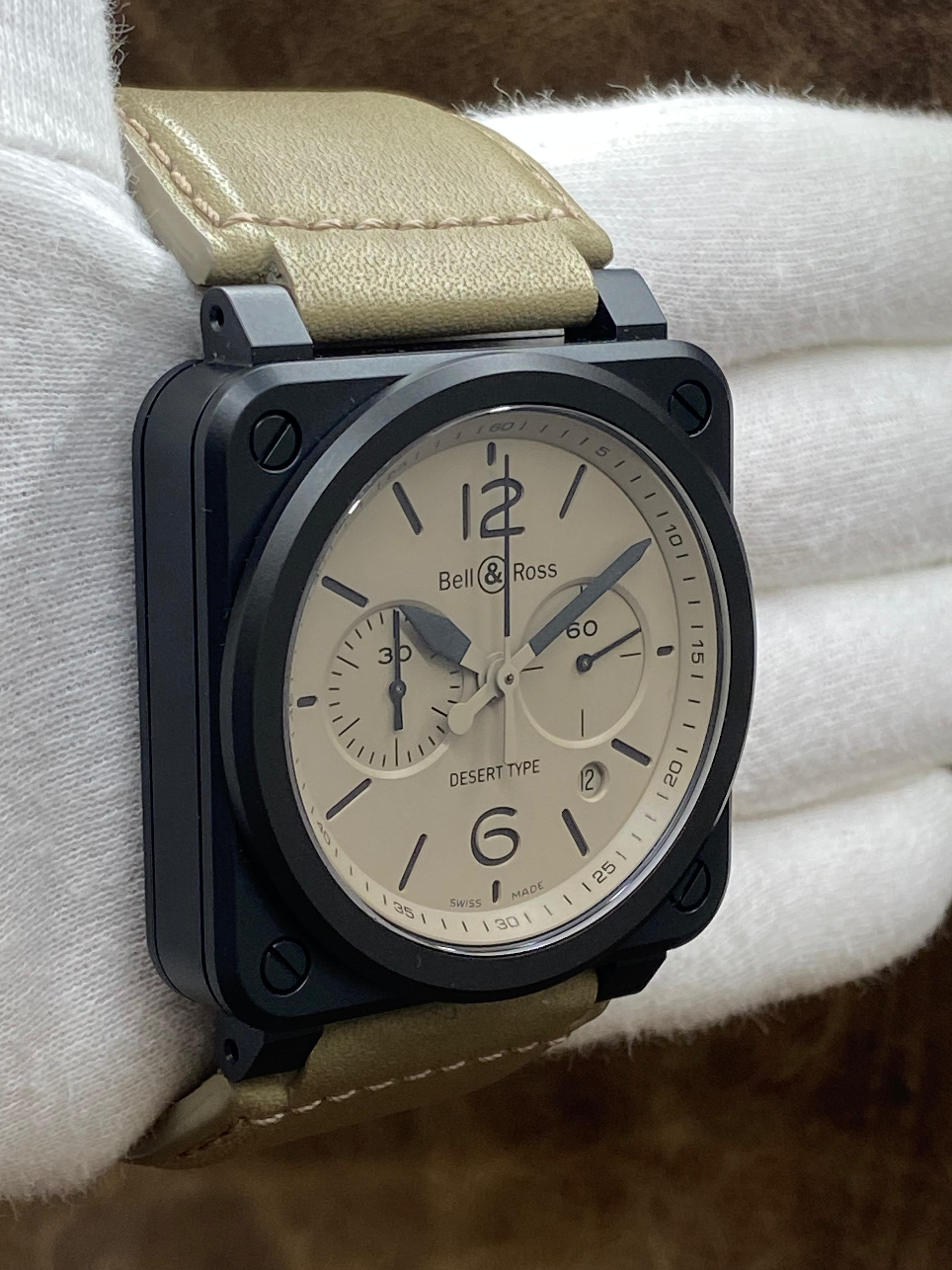 Black ceramic case with a leather strap. Fixed ceramic bezel. Beige dial with luminous black hands and index & 6, 12 Arabic numeral hour markers. Dial type: analog. Br-cal.301 automatic movement with about 42 hours of power reserve. Anti-reflective coated sapphire crystal. Pull/push crown. Solid case back. Case size: 42 mm. Case thickness: 13 mm. Square case shape. Band width: mm. Tang buckle clasp. Water resistant at 100 meters / 330 feet. Functions: chronograph, date, hour, minute, seconds. Bell & Ross Desert Type BR03-94-CBL Beige Dial Automatic Men's Watch.