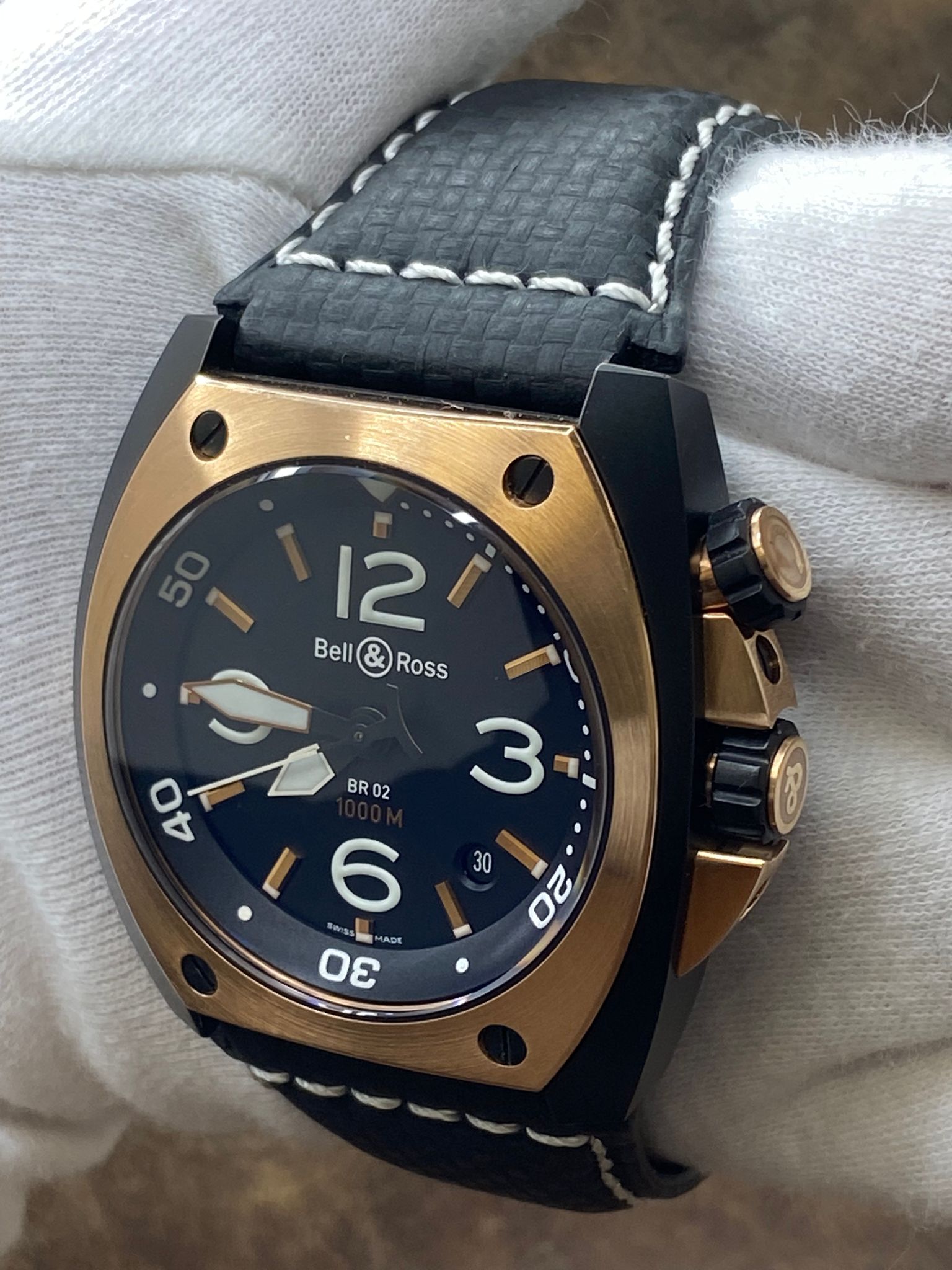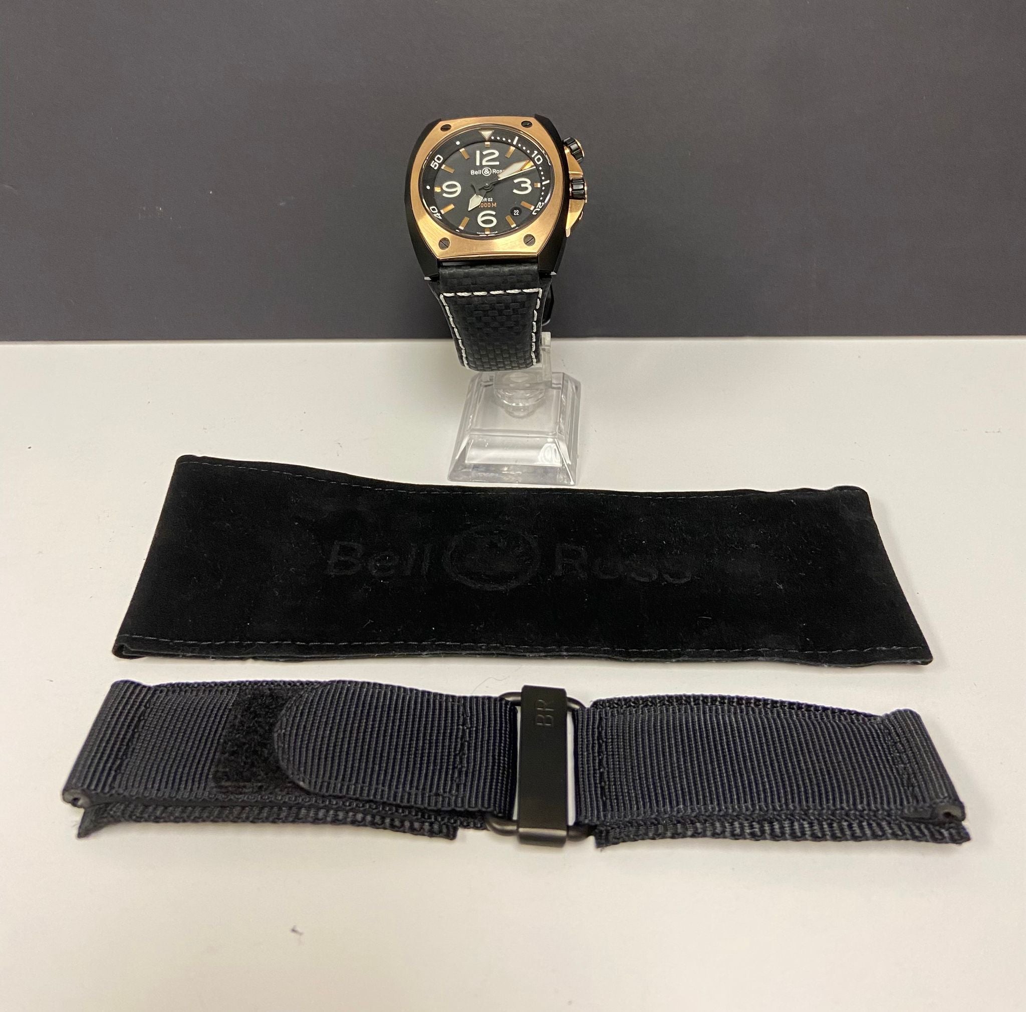 This pre-owned Bell & Ross Marine BR02-20 18K Gold Bezel is in excellent condition and comes with: NO box or papers. The watch has some signs of normal wear on the gold bezel & pushers. The watch comes with a custom leather strap with original pvd tang buckle and an extra original fabric strap with buckle. Max wrist size: 8.25 in.