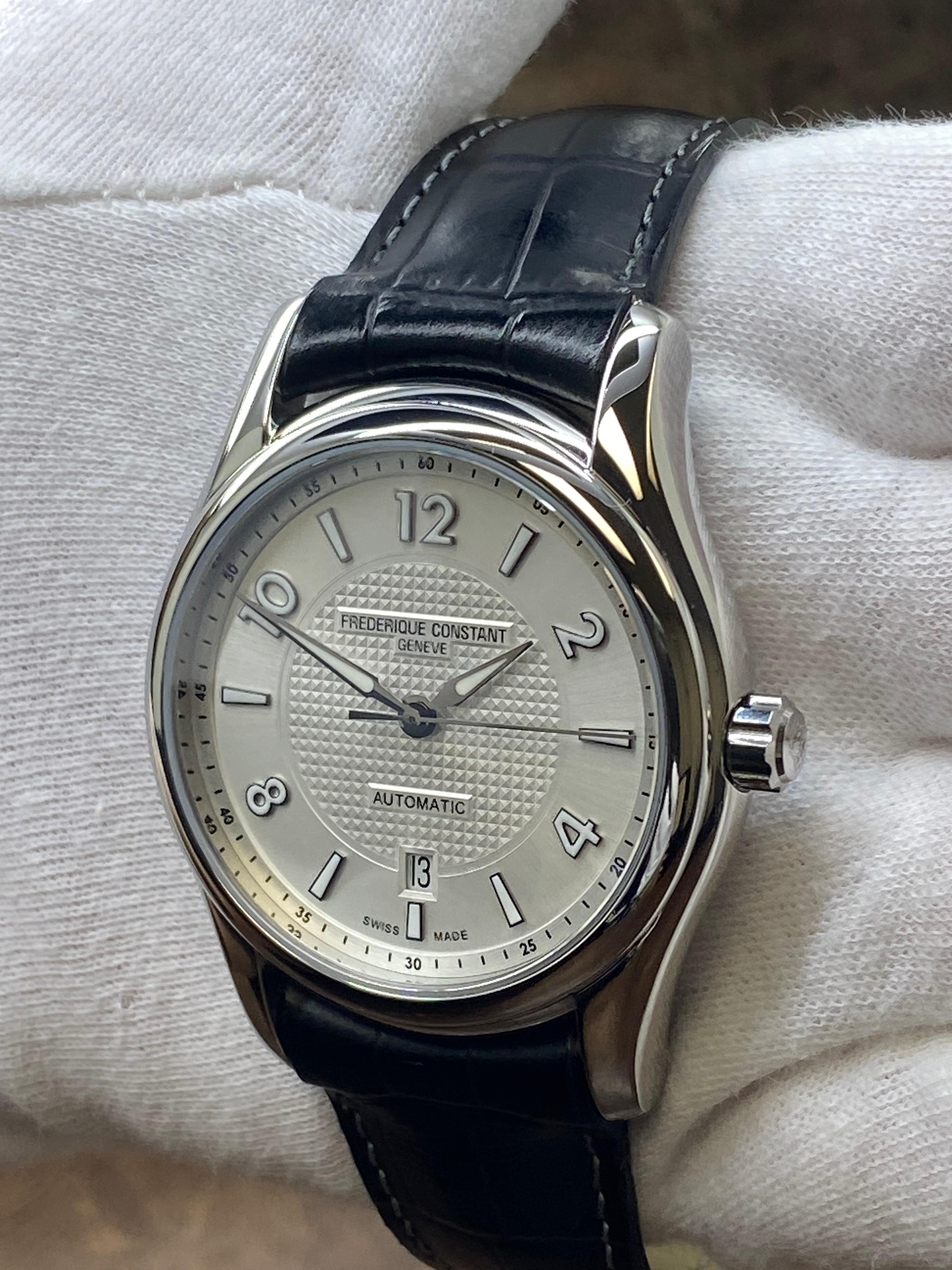 Stainless steel case with a leather strap. Fixed stainless steel bezel. Silver dial with luminous silver-tone hands and index & 2, 4, 6, 8, 10, 12 Arabic hour markers. Dial type: analog. Frederique Constant calibre fc-303 automatic movement with about 38 hours of power reserve. Scratch resistant sapphire crystal. Screw down crown. Solid with exhibition sapphire case back case back. Case size: 43 mm. Case thickness: 11 mm. Round case shape. Band width: mm. Fold over with push button release clasp. Water resistant at 50 meters / 165 feet. Functions: date, hour, minute, seconds. Frederique Constant Runabout Collection L.E 2888pcs FC-303RMS6B6 Silver Dial Automatic Men's Watch.