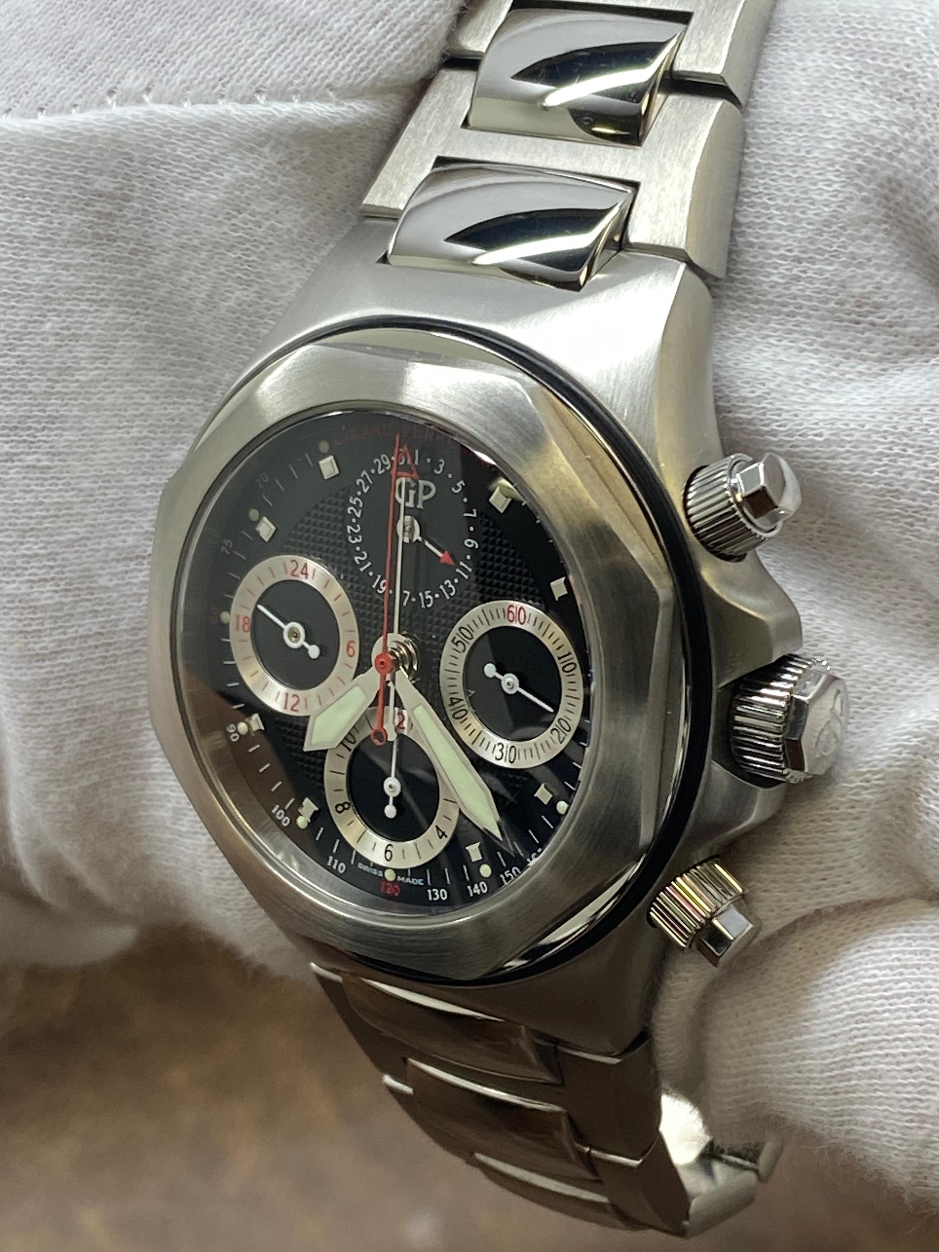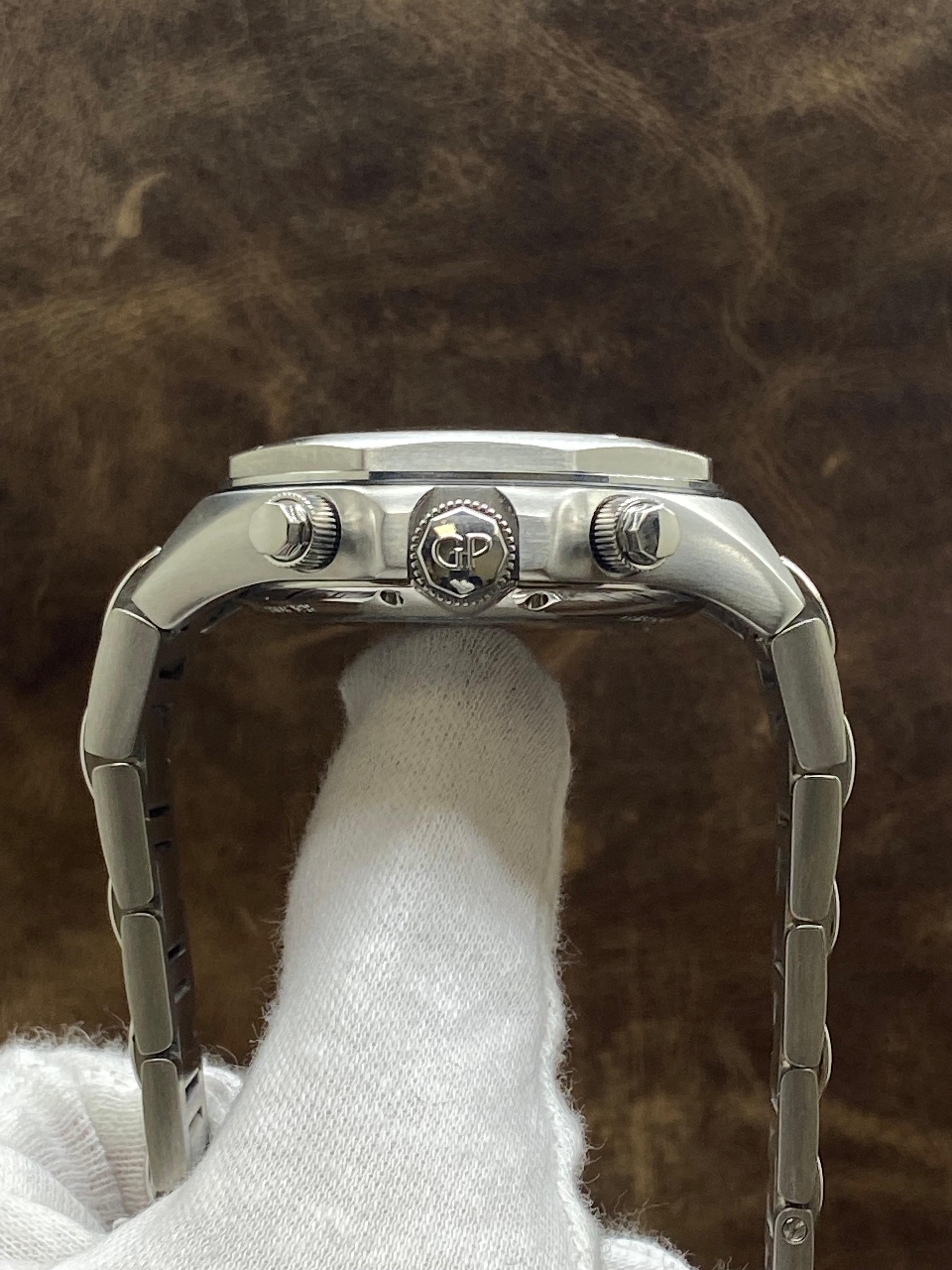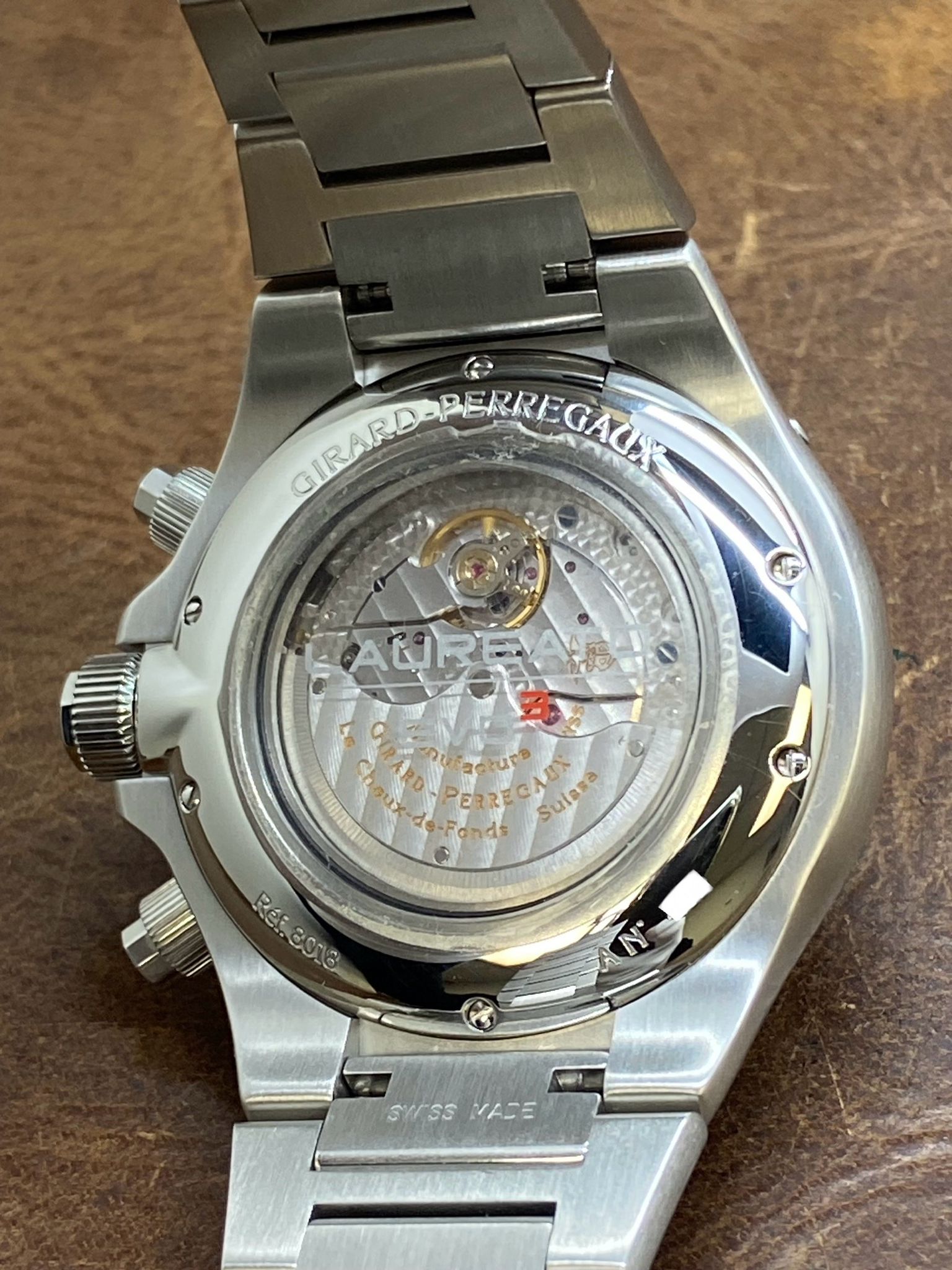 This pre-owned Girard Perregaux Laureato Evo3 Chronograph 80180.1.11.6516 is in mint condition and comes with: original Girard Perregaux double box, tag, booklets and matching warranty card. Max wrist size: 7.75 in.