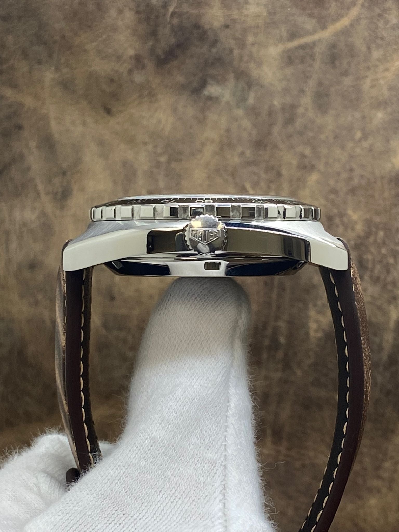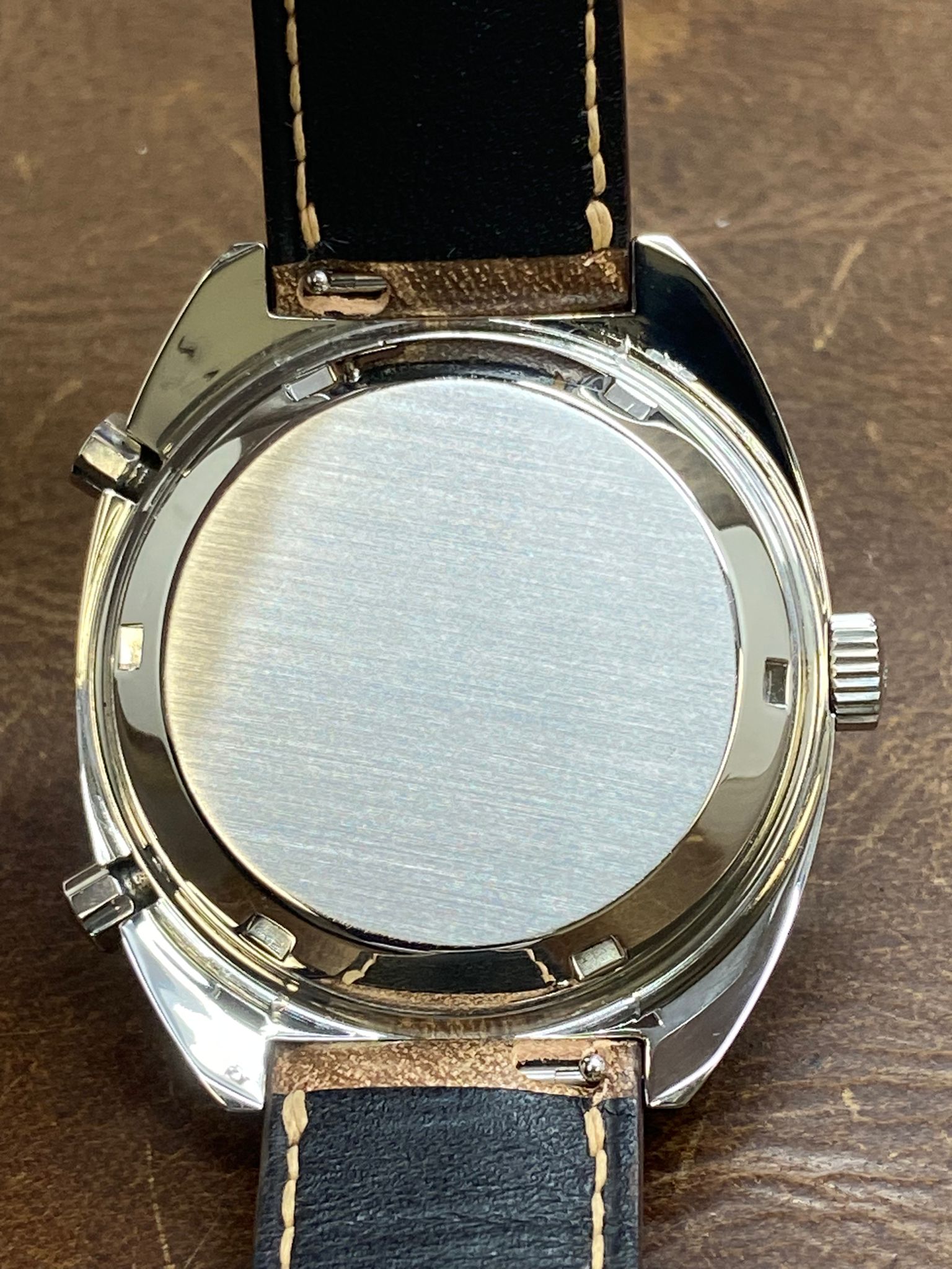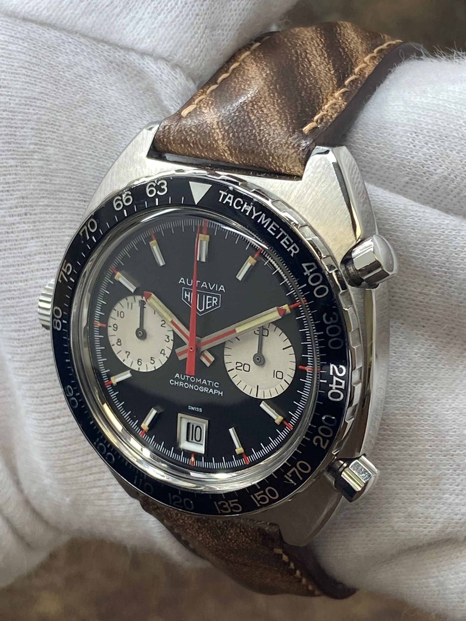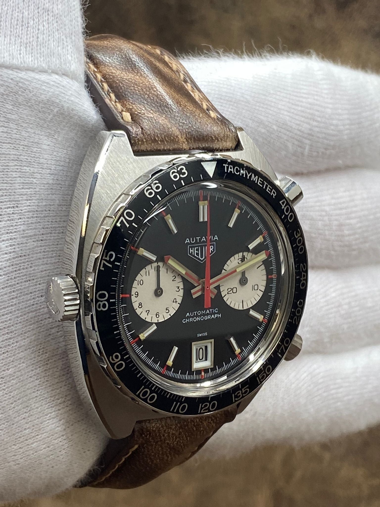 This pre-owned Heuer Autavia Viceroy 1163 is in very good condition and comes with: NO box or papers. The black insert on the bezel has several signs of wear - mainly between 10-2 o'clock. The top right lug has a minor dent on the underside corner. The watch is NOT waterproof. Max wrist size: 7.25 in.