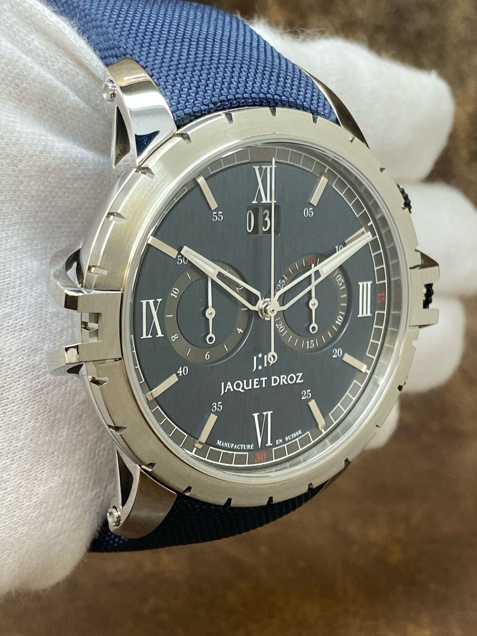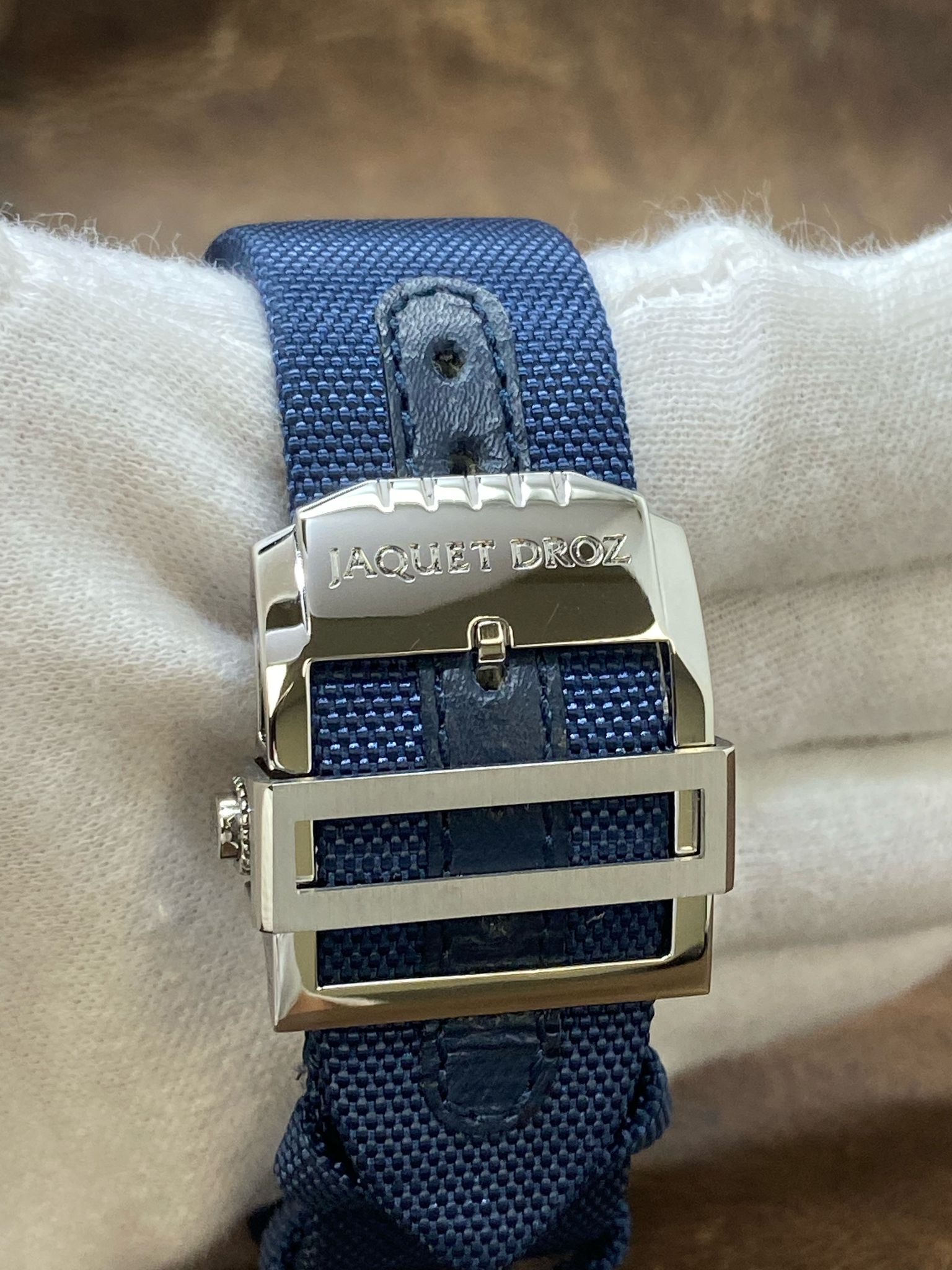 Stainless steel case with a textile strap. Fixed stainless steel bezel. Blue dial with luminous silver-tone hands and index & 3, 6, 9, 12 Roman numeral hour markers. Dial type: analog. Jaquet droz 6885.Si-s automatic movement with about 40 hours of power reserve. Scratch resistant sapphire crystal. Crown. Transparent case back. Case size: 45 mm. Case thickness: mm. Round case shape. Band width: mm. Double fold-over clasp. Water resistant at 50 meters / 165 feet. Functions: chronograph, date, hour, minute, seconds. Jaquet-Droz Grande Seconde SW 45mm J029530540 Blue Dial Automatic Men's Watch.