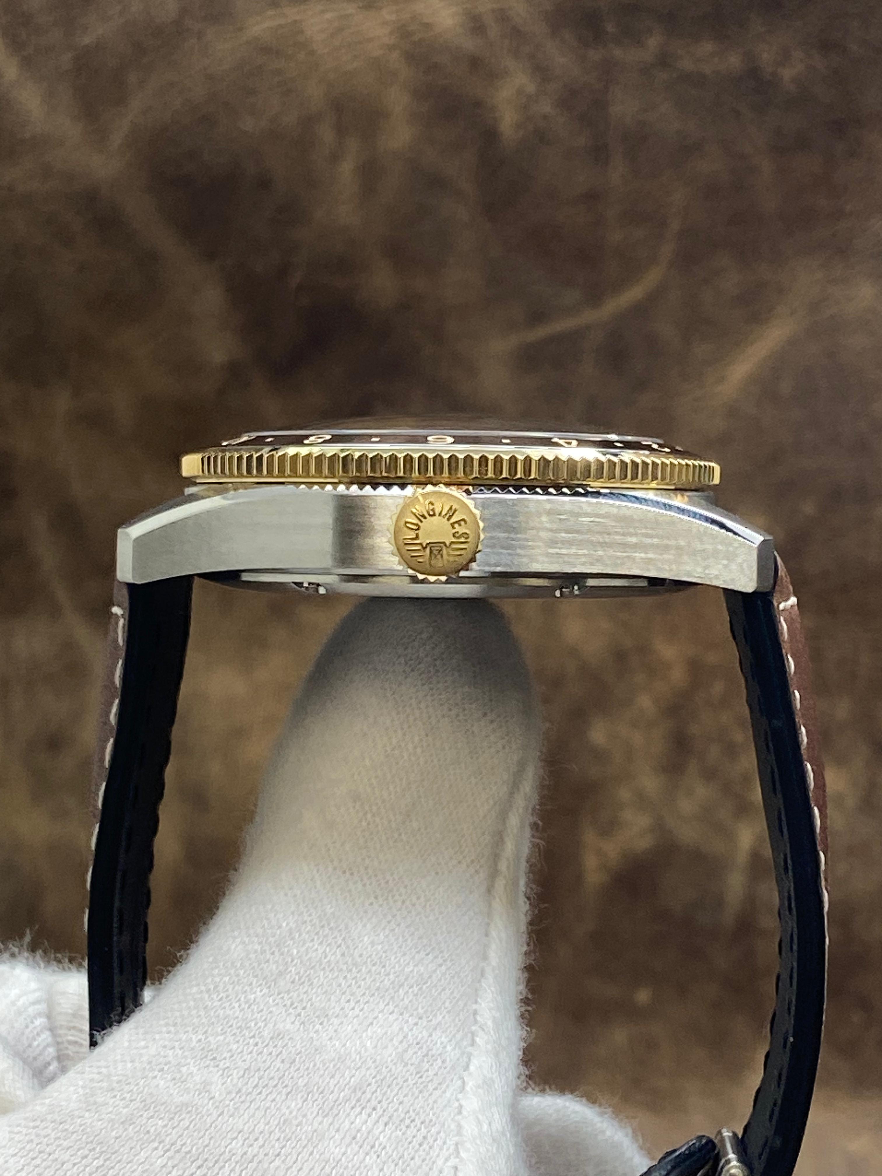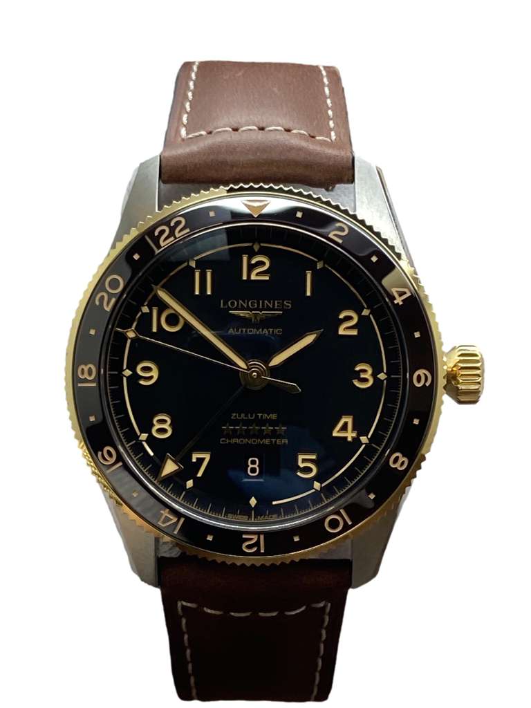 Stainless steel case with a leather strap. Bi-directional rotating 24 hour 18k gold cap bezel. Grey anthracite dial with luminous gold-tone hands and Arabic numeral hour markers. Dial type: analog. Caliber: l844.4 automatic movement with about 72 hours of power reserve. Scratch resistant anti-reflective sapphire crystal. Screw down crown. Solid case back. Case size: 42 mm. Case thickness: 13.9 mm. Round case shape. Band width: mm. Fold over with push button release clasp. Water resistant at 100 meters / 330 feet. Functions: gmt, date, hour, minute, seconds, cosc chronometer. Longines Spirit Zulu Time L3.812.5.53.2 Grey Anthracite Dial Automatic Men's Watch.