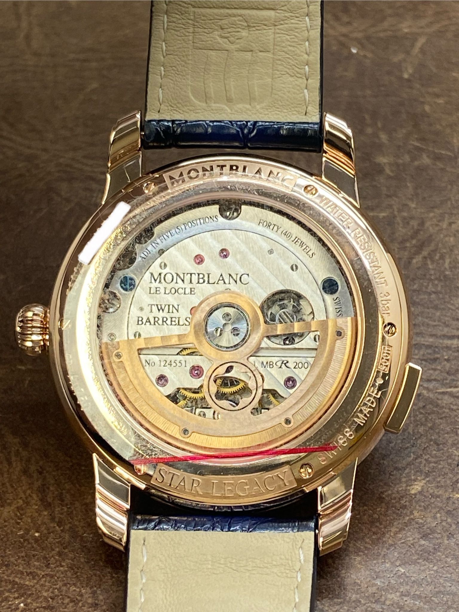 This pre-owned Montblanc Star Legacy Nicolas Rieussec Chronograph 18K Rose Gold 126097 is in excellent condition and comes with: original Montblanc double box, booklets and matching warranty papers dated Jan 2022. Max wrist size: 8 in.