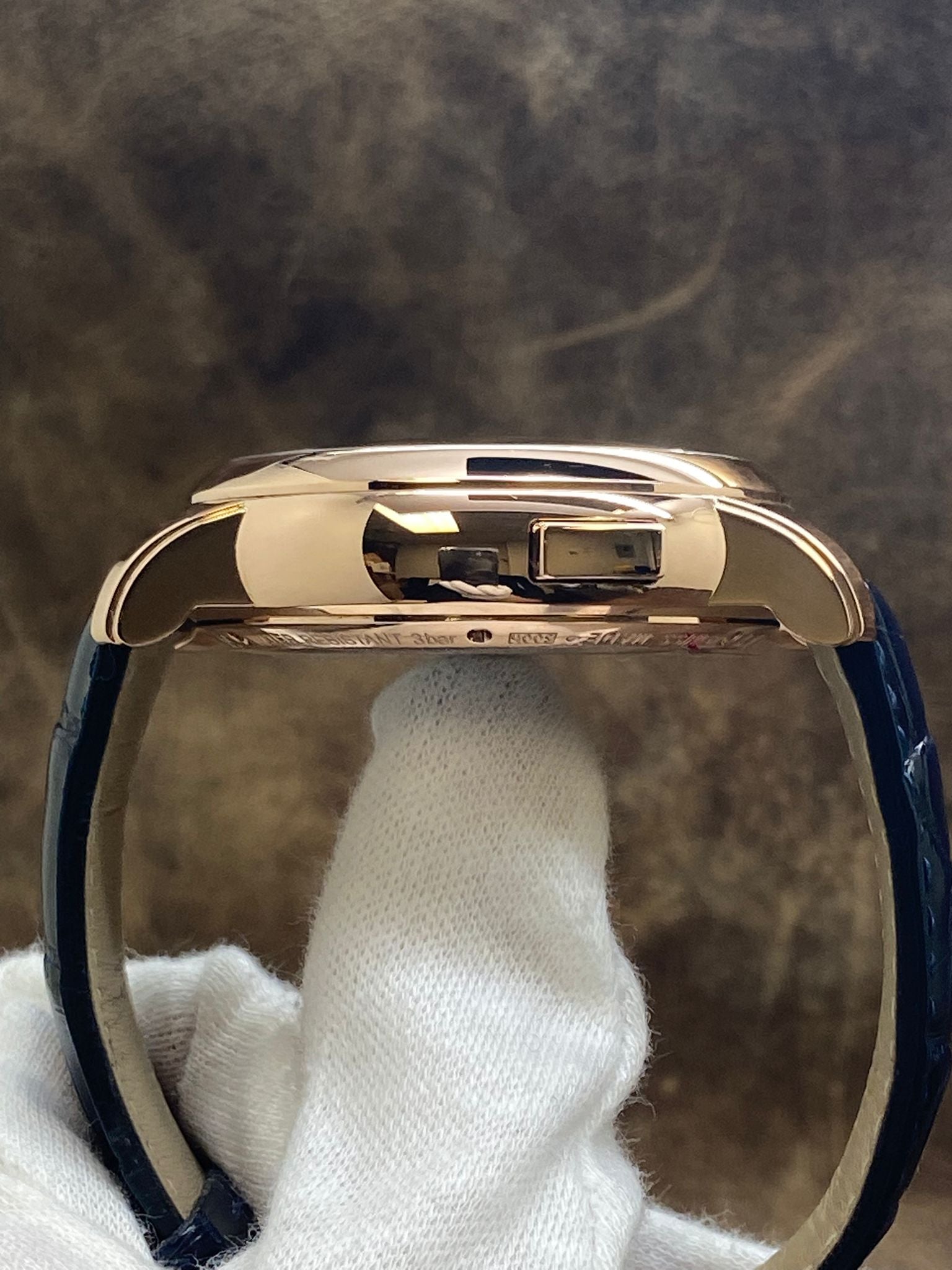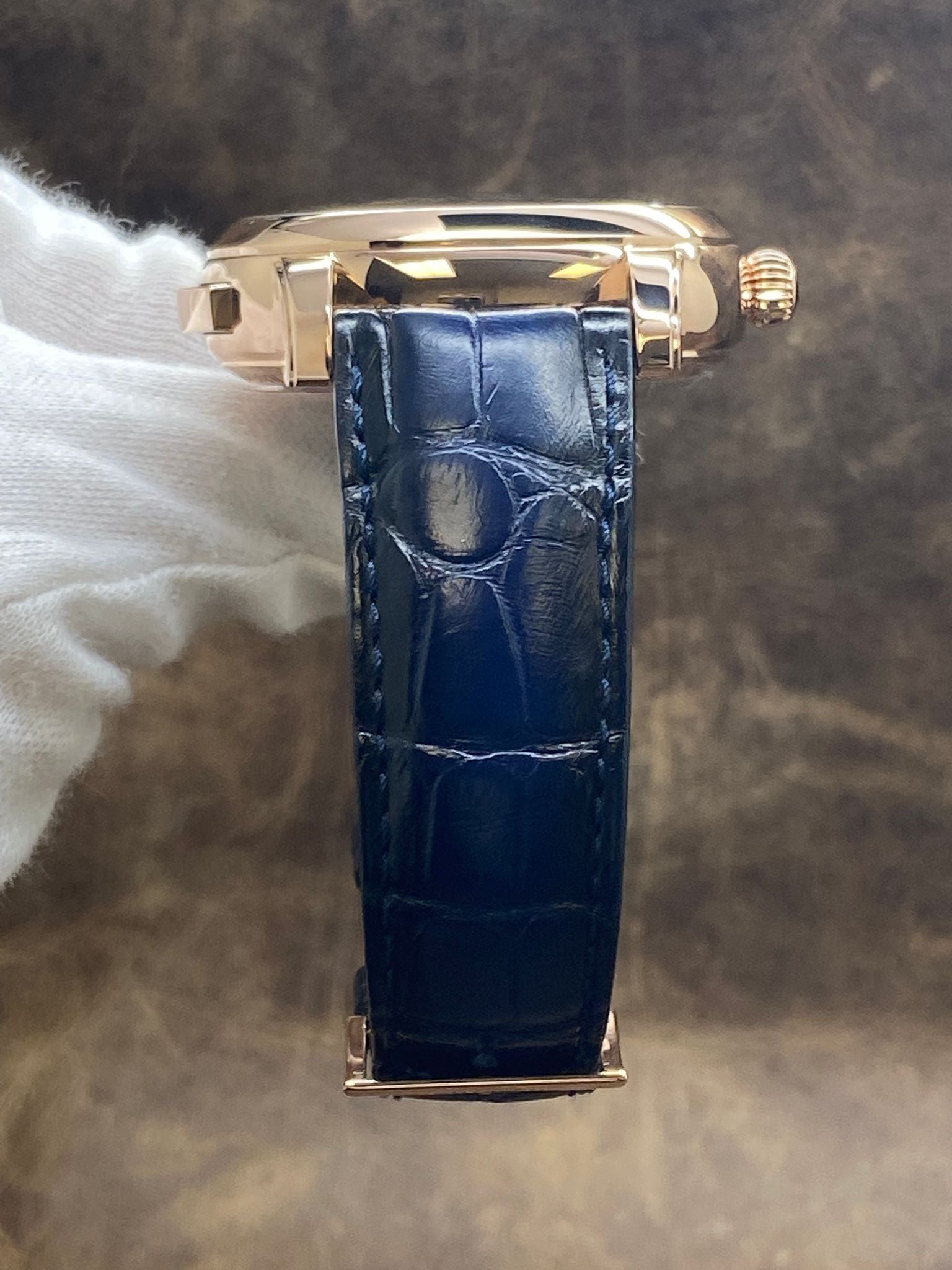 - Features Chronograph; Date; Hour; Minute; Second; 12-hour second time zone complication with day/night indicator; 18K Rose gold; Leather; Analog;