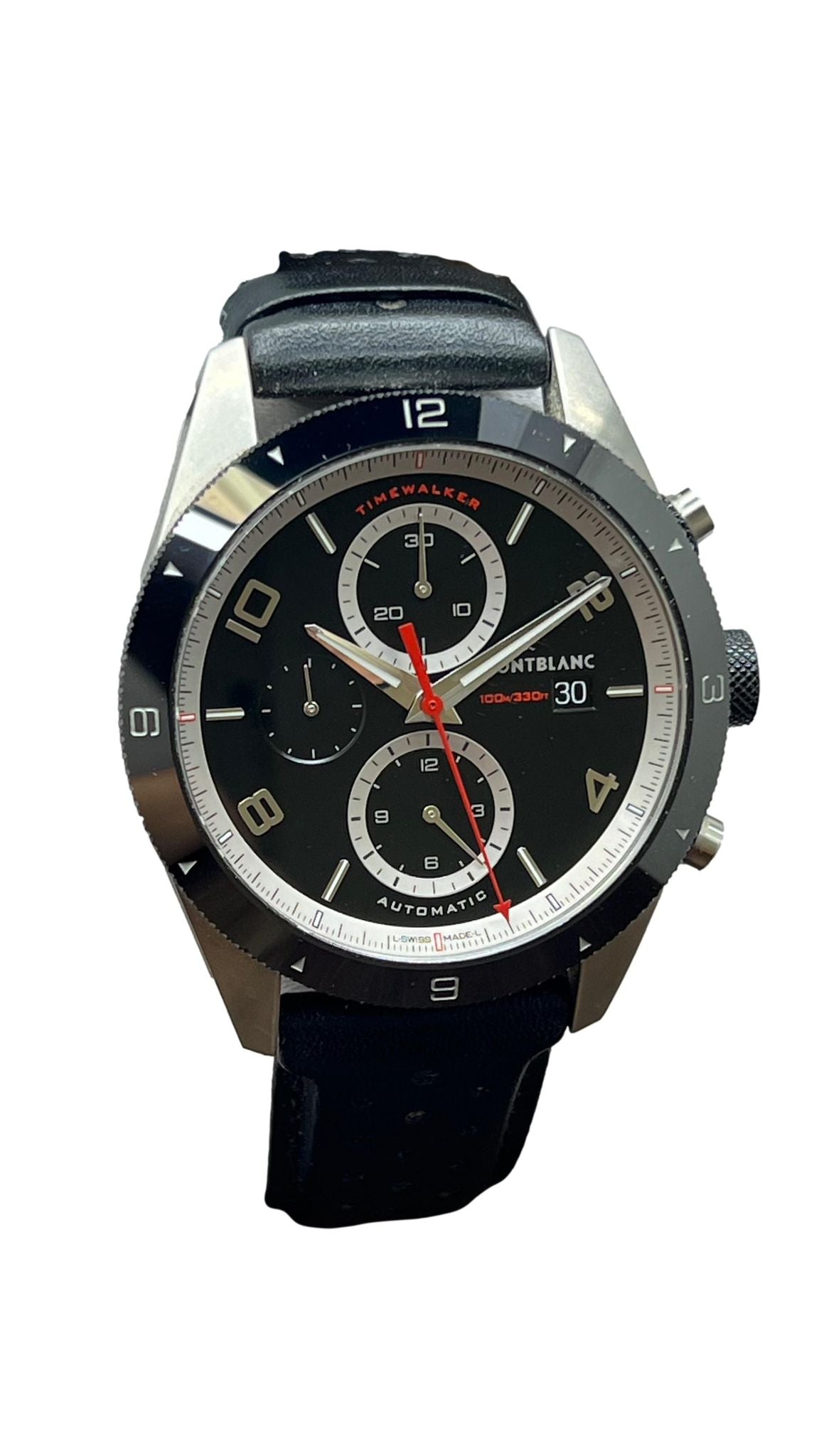 Stainless steel case with a leather strap. Uni-directional rotating ceramic bezel. Black dial with silver tone luminous hands and luminous index with Arabic 2, 4, 6, 8 hour markers. Dial type: analog. Montblanc calibre mb 25.07 automatic movement with about 42 of power reserve. Scratch resistant sapphire crystal. Pull / push crown. Exhibition case back. Case size: 43 mm. Case thickness: 15.2 mm. Round case shape. Band width: mm. Push button deployant clasp. Water resistant at 100 meters / 330 feet. Functions: hours, minutes, seconds, date, chronograph. Montblanc TimeWalker Chronograph 116098 Black Dial Automatic Men's Watch.