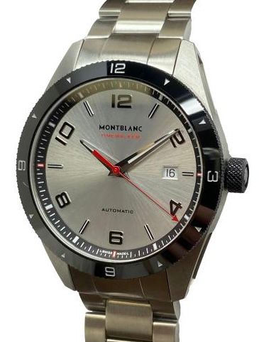 Stainless steel case with a stainless steel bracelet. Uni-directional rotating stainless steel with a ceramic top ring bezel. Silver dial with luminous silver-tone hands and index with 2, 4, 6, 8, 10 and 12 Arabic numerals hour markers. Dial type: analog. Mb 24.17 automatic movement with about 38 of power reserve. Scratch resistant sapphire crystal. Pull/push crown. Transparent case back. Case size: 41 mm. Case thickness: 11.38 mm. Round case shape. Band width: mm. Double fold-over with push button release clasp. Water resistant at 100 meters / 330 feet. Functions: date, hour, minute, second. Montblanc Timewalker 7426 Silver Dial Automatic Men's Watch.