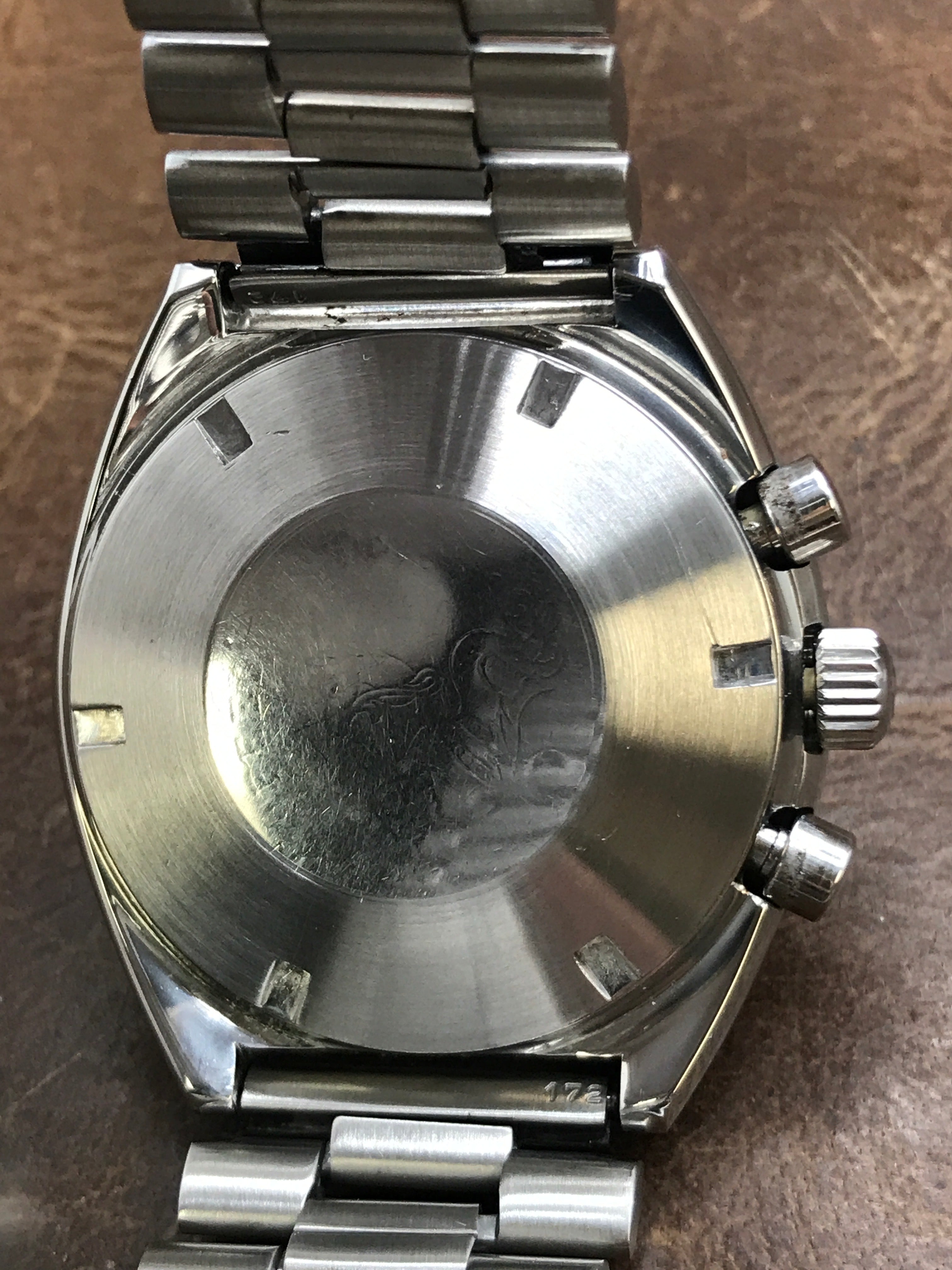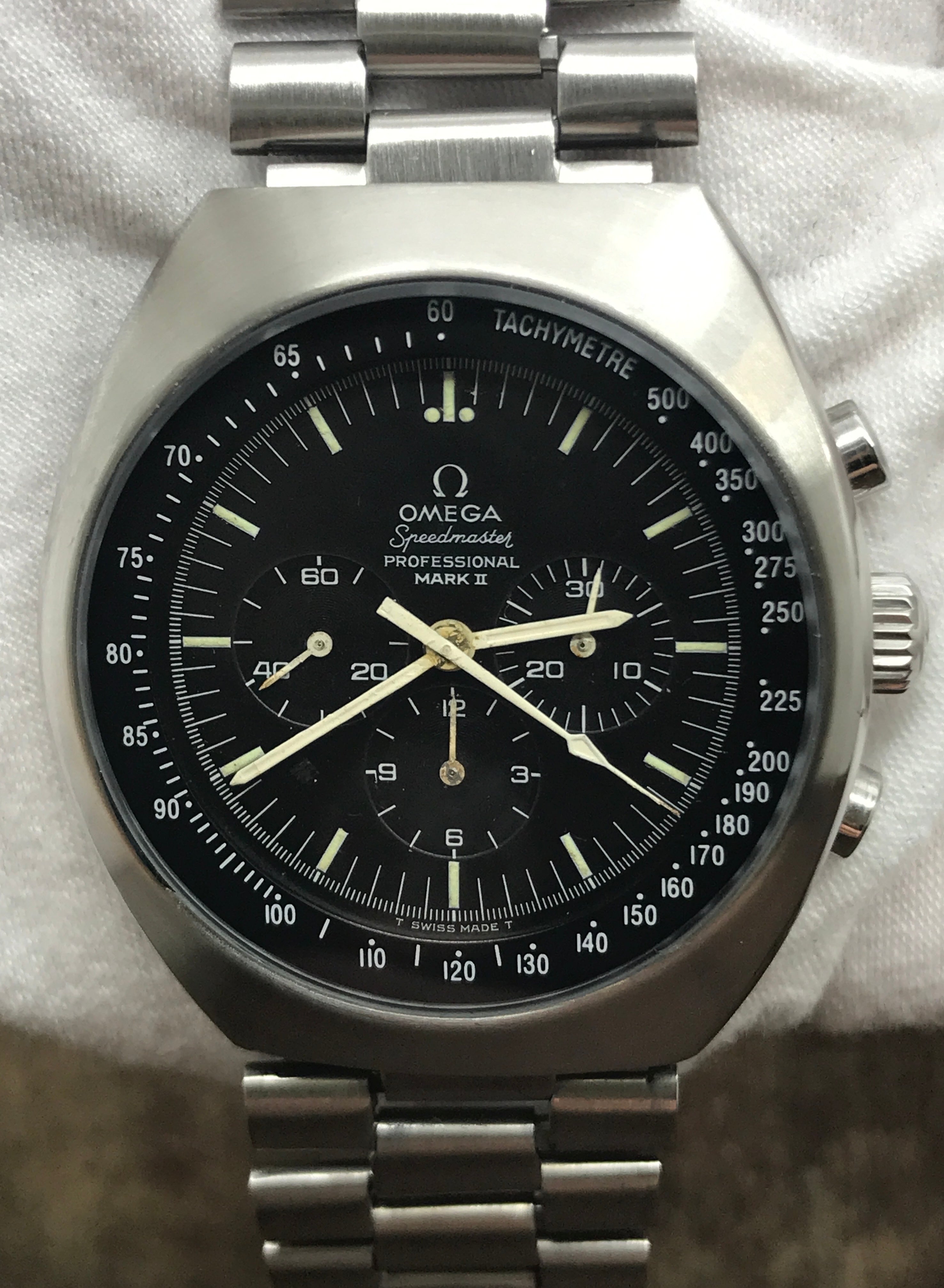 This pre-owned Omega Speedmaster Mark II 145.014 is in very good condition and comes with: NO box or papers. The dial has a few marks on it between 7-8 o’clock & also near 10. Hands have marks as seen in the pictures. Max wrist size: 8 in.