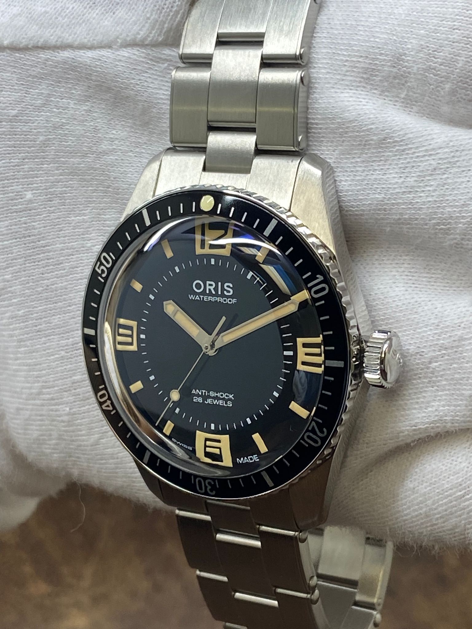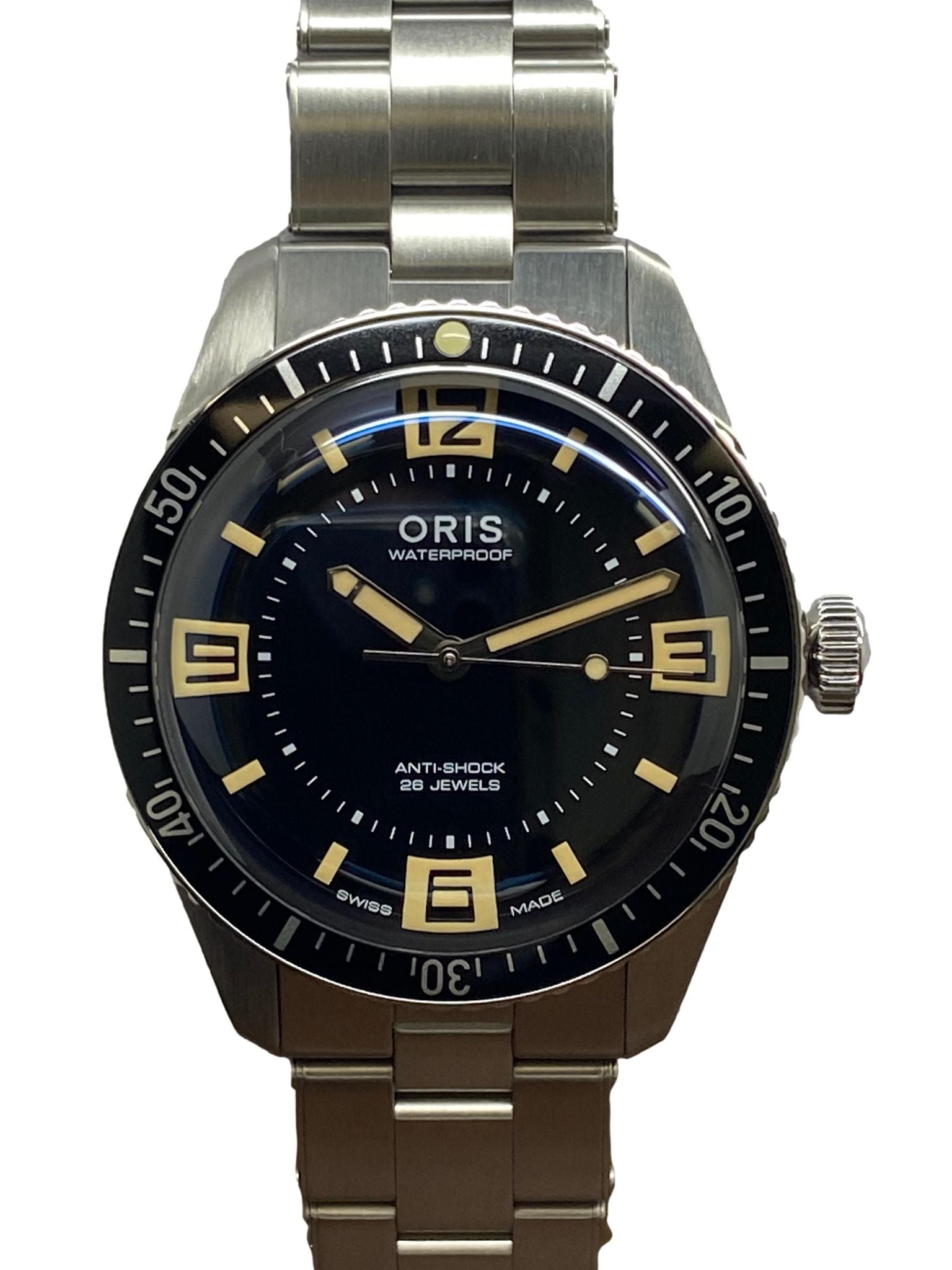 Stainless steel case with a stainless steel bracelet. Uni-directional rotating stainless steel with an aluminum top ring bezel. Black dial with luminous silver-tone hands and index & 3, 6, 9, 12 Arabic numeral hour markers. Dial type: analog. Oris caliber 733 automatic movement with about 41 hours of power reserve. Domed sapphire crystal with anti-reflective coating crystal. Screw down crown. Solid case back. Case size: 40 mm. Case thickness: 12.8 mm. Round case shape. Band width: mm. Fold over with push button release clasp. Water resistant at 100 meters / 330 feet. Functions: hours, minutes, seconds. Oris Divers Sixty Five 01 733 7772 4034 Black Dial Automatic Men's Watch.