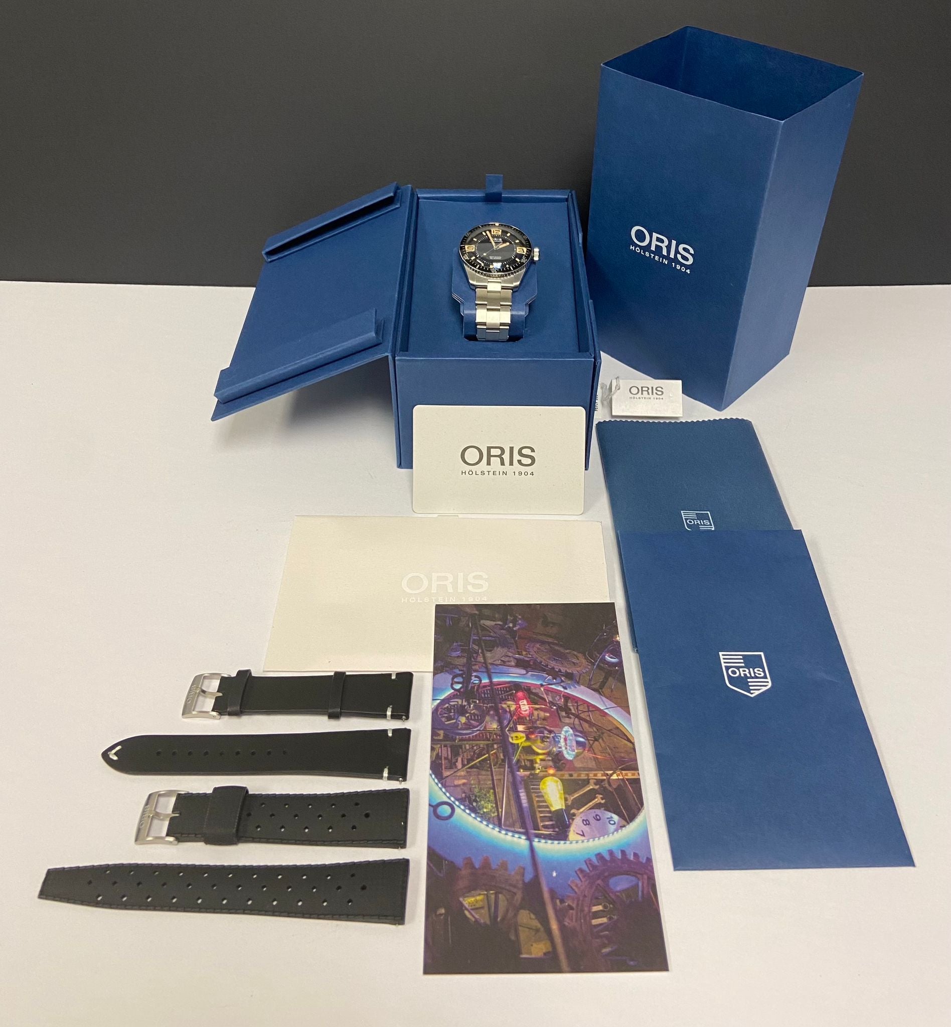 - original Oris double box, booklets, 2 extra straps (rubber & leather) and matching warranty card