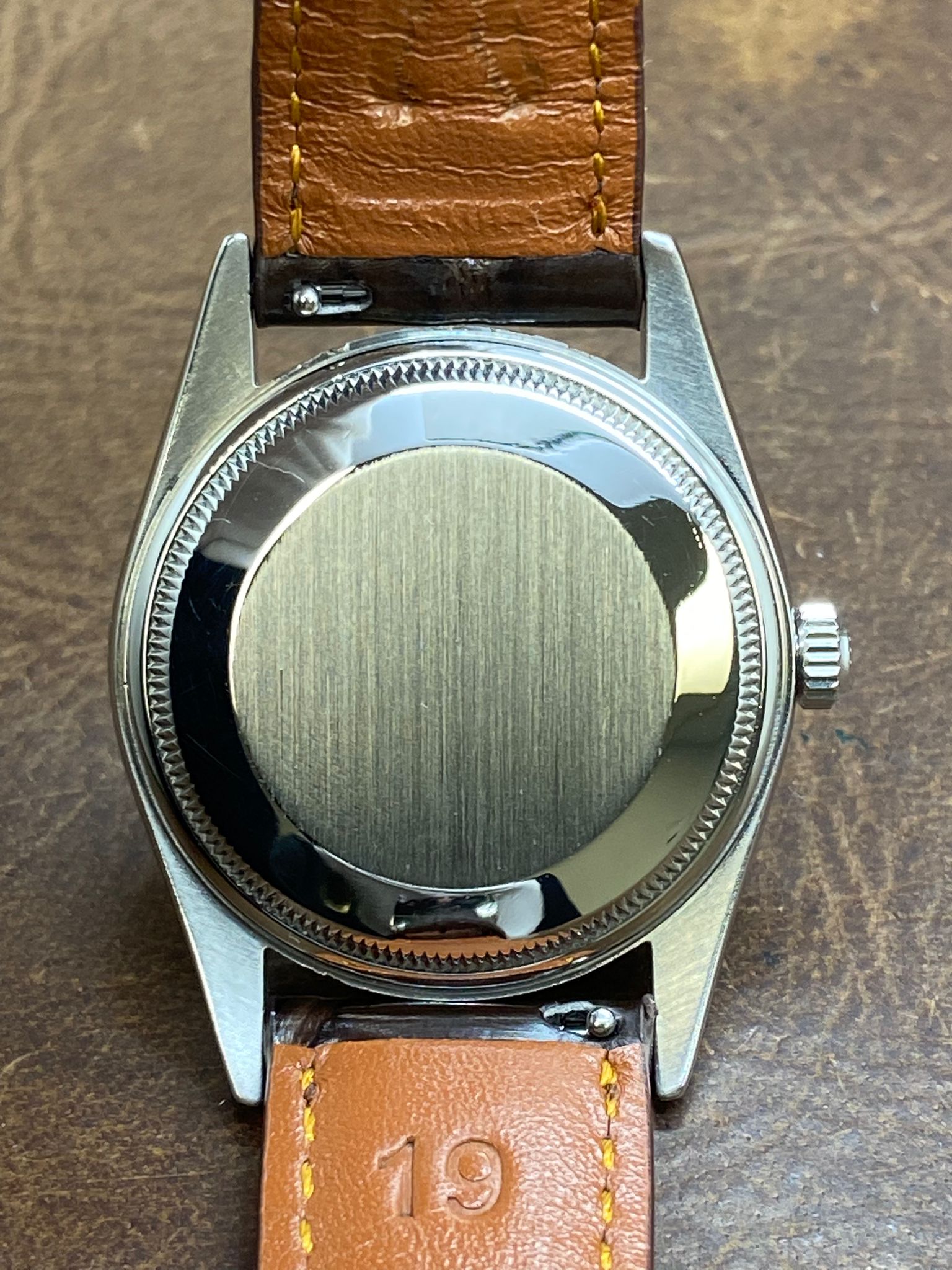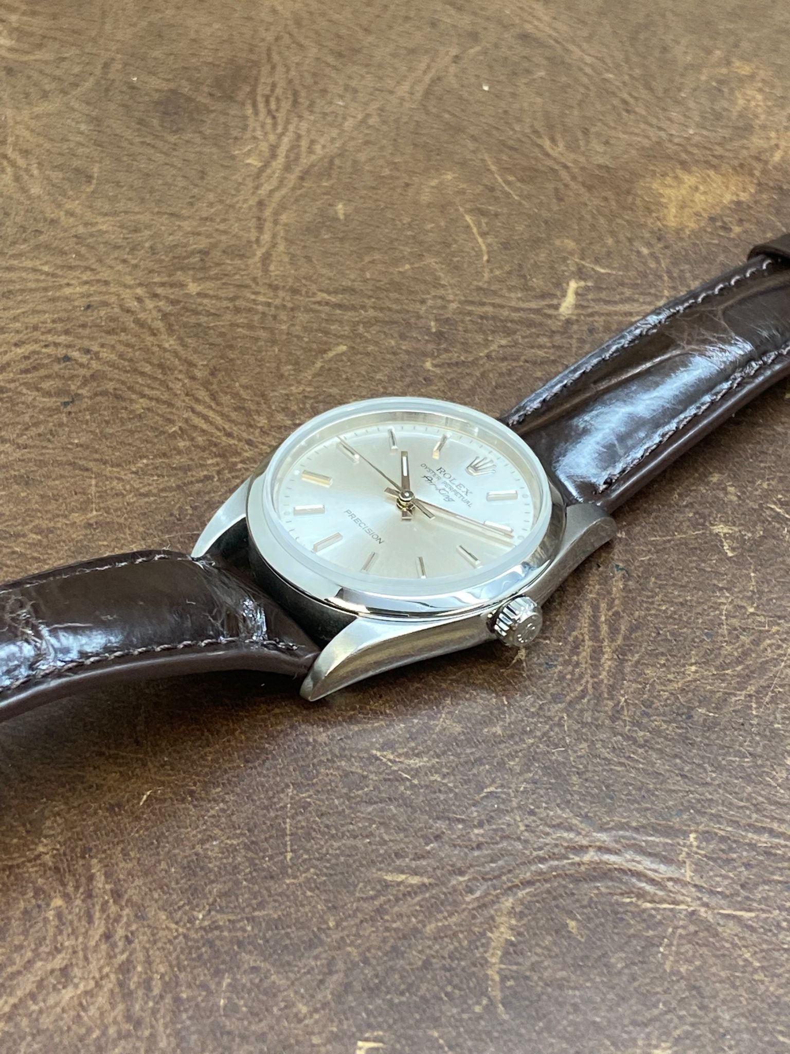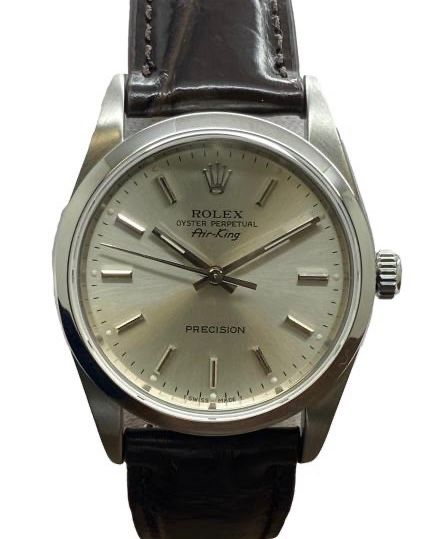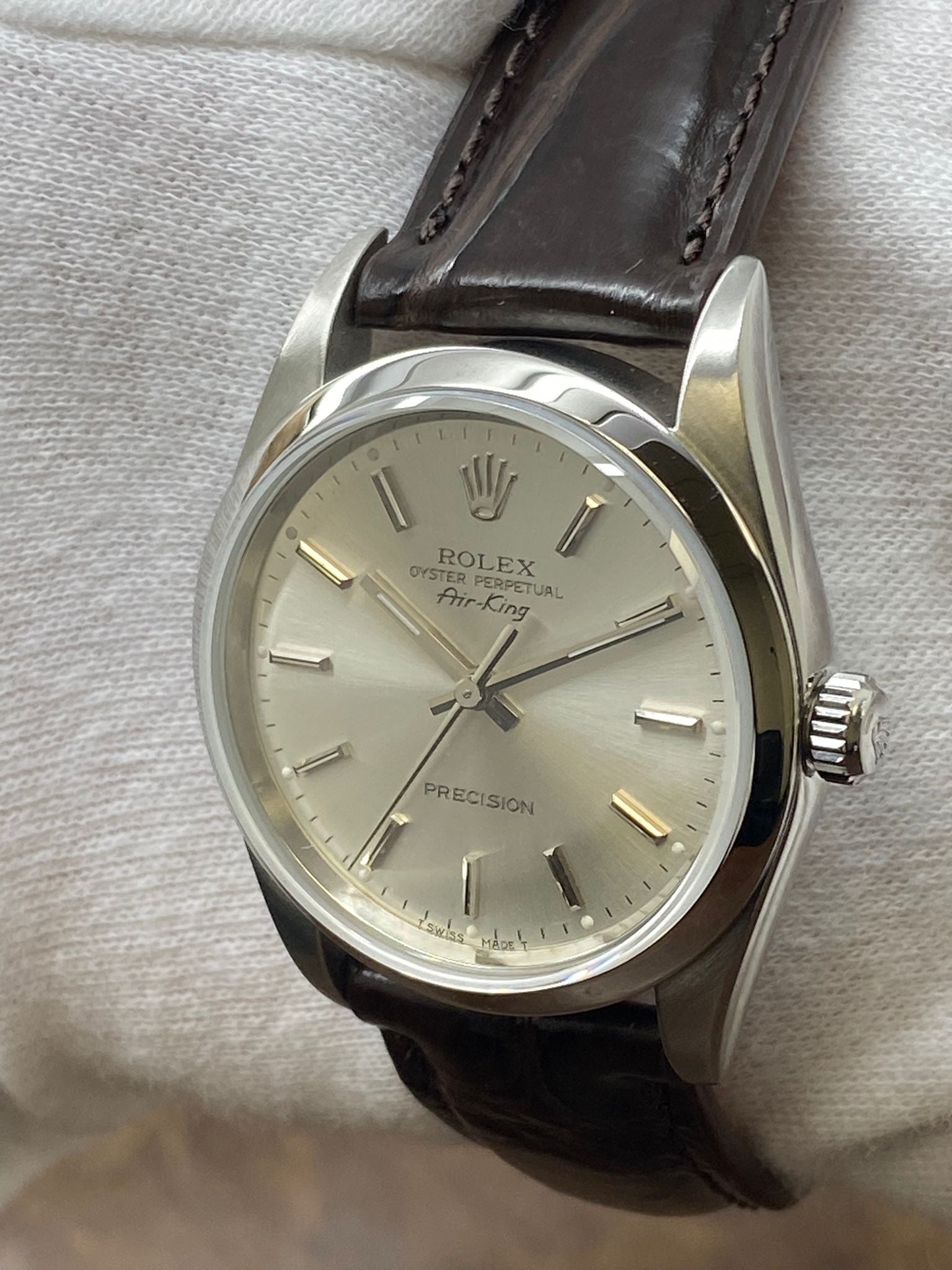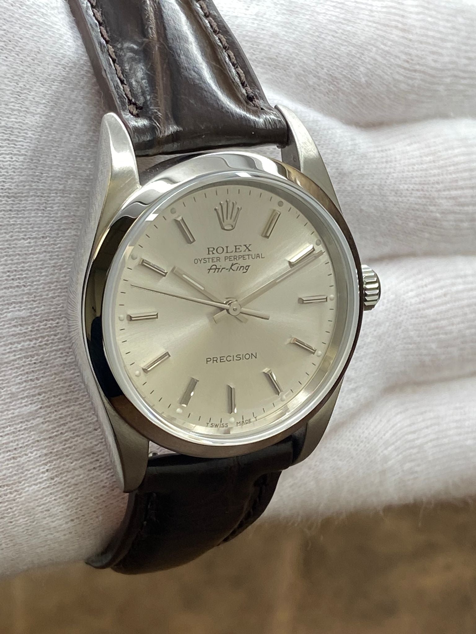 This pre-owned Rolex Air-King 34mm Precision 14000 is in excellent condition and comes with: NO box or papers. The watch comes with a custom leather strap and steel tang buckle. It is NOT waterproof. Max wrist size: 7 in.