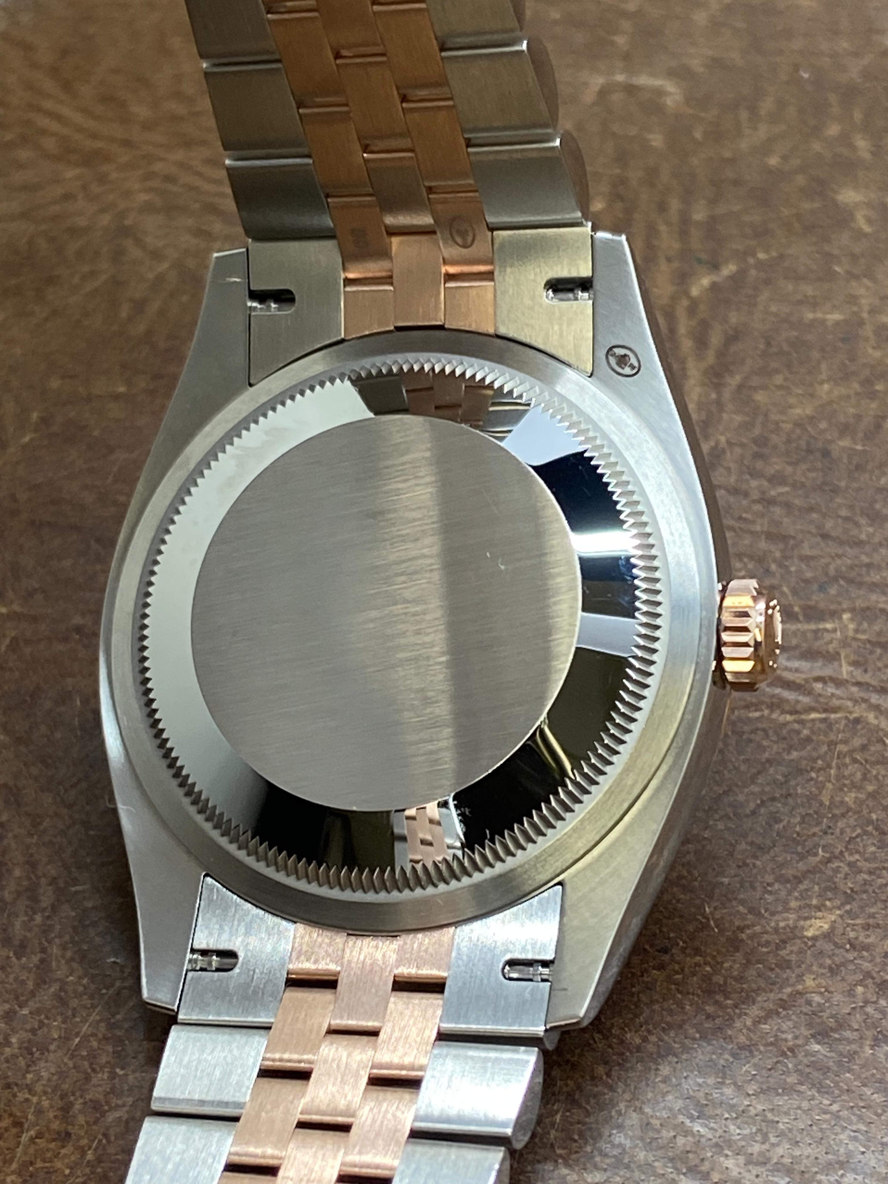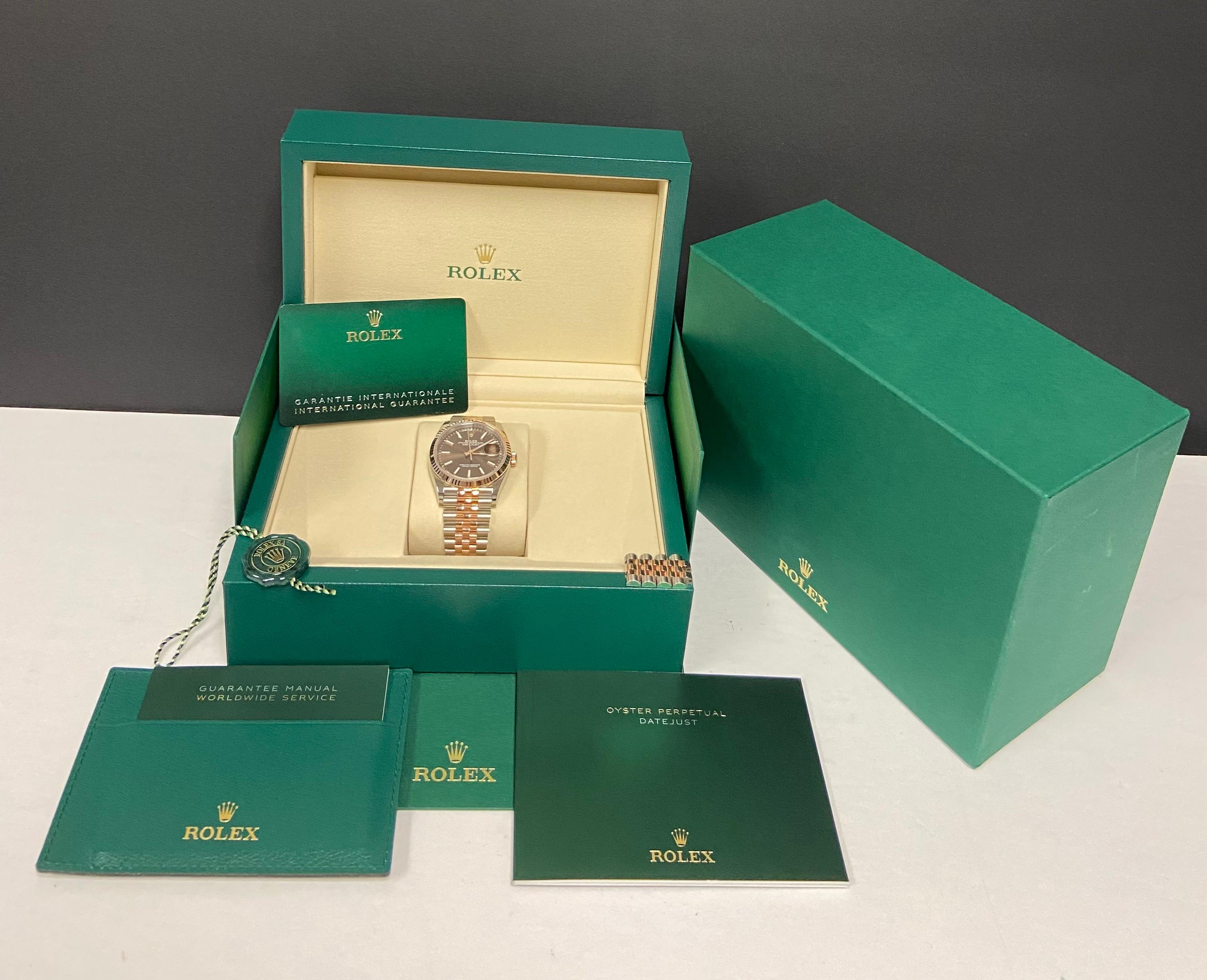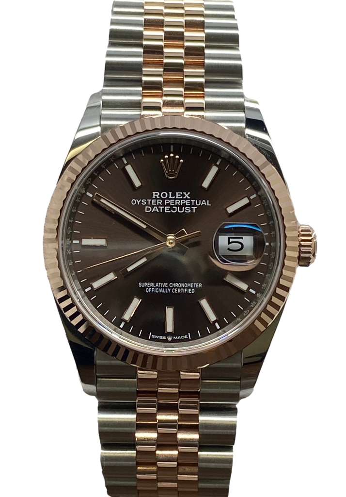 Stainless steel case with a stainless steel & 18k rose gold jubilee bracelet. Fixed fluted 18k rose gold bezel. Chocolate dial with rose gold tone & luminous hands and index hour markers. Dial type: analog. Rolex calibre 3235 automatic movement with about 70 hours of power reserve. Sapphire crystal. Screw down crown. Solid case back. Case size: 36 mm. Case thickness: 12 mm. Round case shape. Band width: mm. Oysterclasp clasp. Water resistant at 100 meters / 330 feet. Functions: hours, minutes, seconds, date. Rolex Datejust 36 126231 Chocolate Dial Automatic Watch.