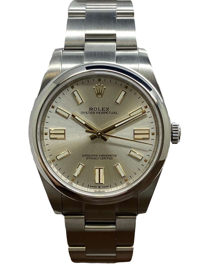 Stainless steel case with a stainless steel oyster bracelet. Smooth - fixed stainless steel bezel. Silver dial with luminous gold-tone hands and index hour markers. Dial type: analog. Caliber 3230 automatic movement with about 70 of power reserve. Scratch resistant sapphire crystal. Screw-down crown. Solid case back. Case size: 41 mm. Case thickness: 11.7 mm. Round case shape. Band width: mm. Fold over clasp. Water resistant at 100m/330ft. Functions: date, hour, minute, seconds, chronometer. Rolex Oyster Perpetual 41 124300 Silver Dial Automatic Men's Watch.