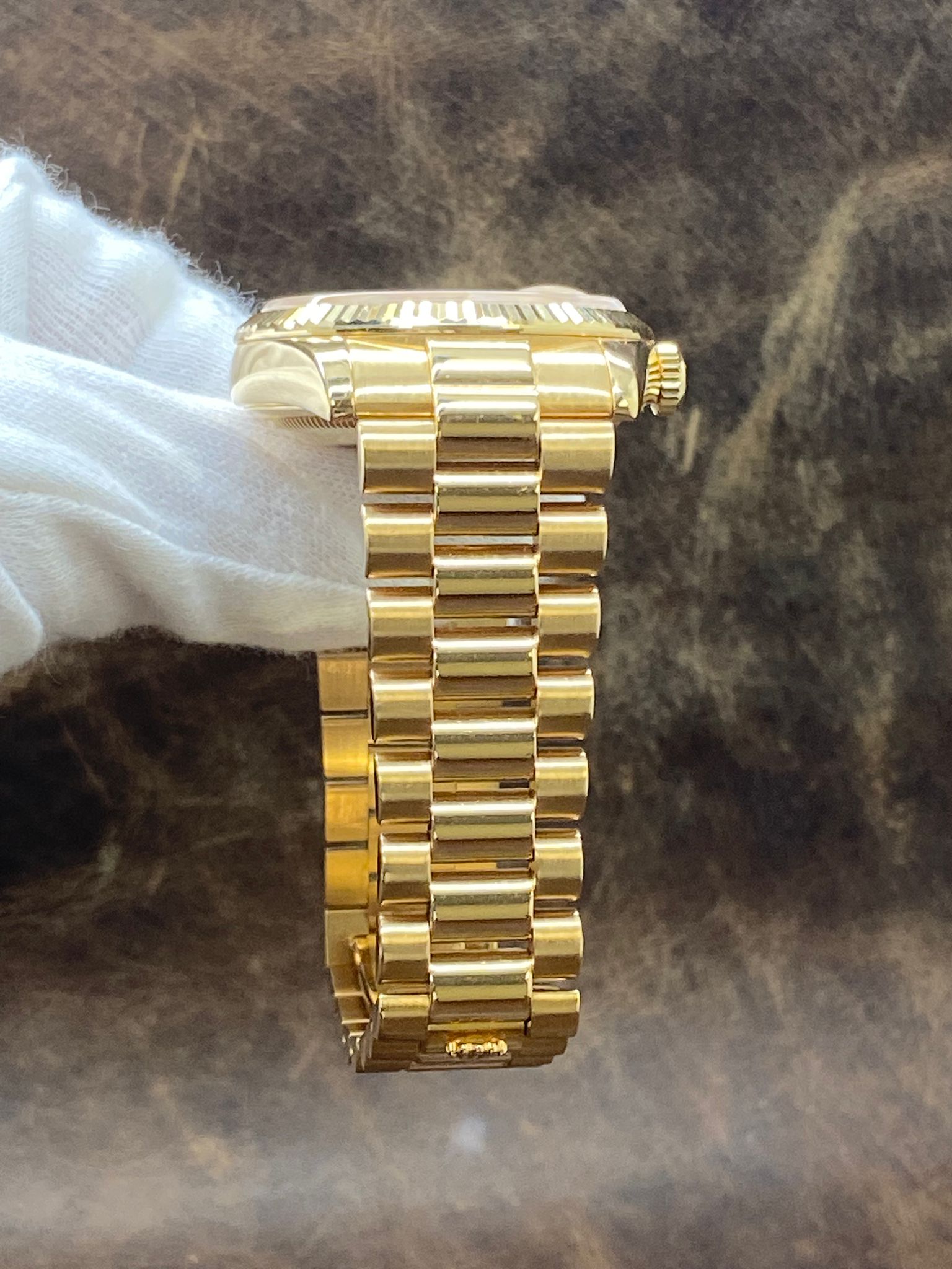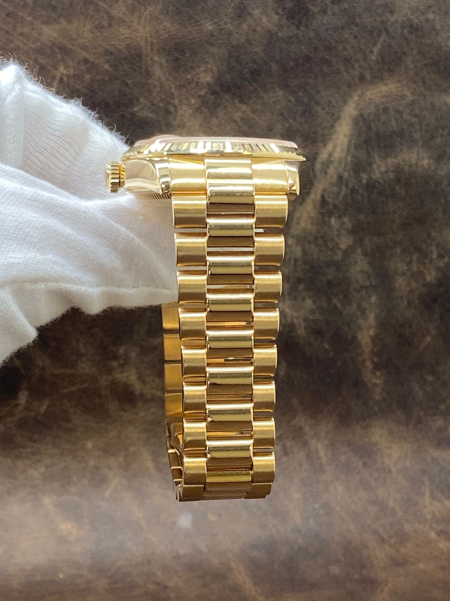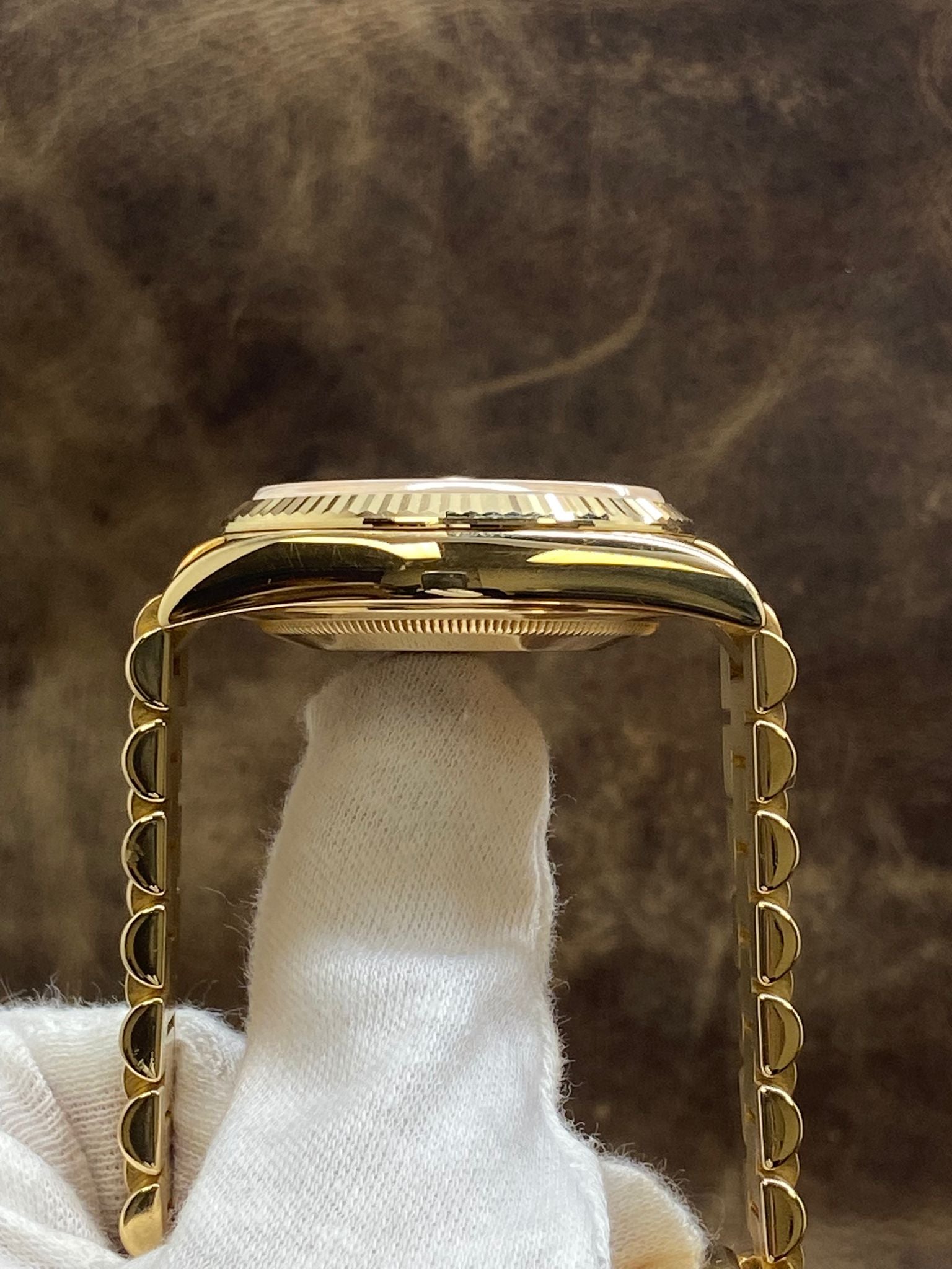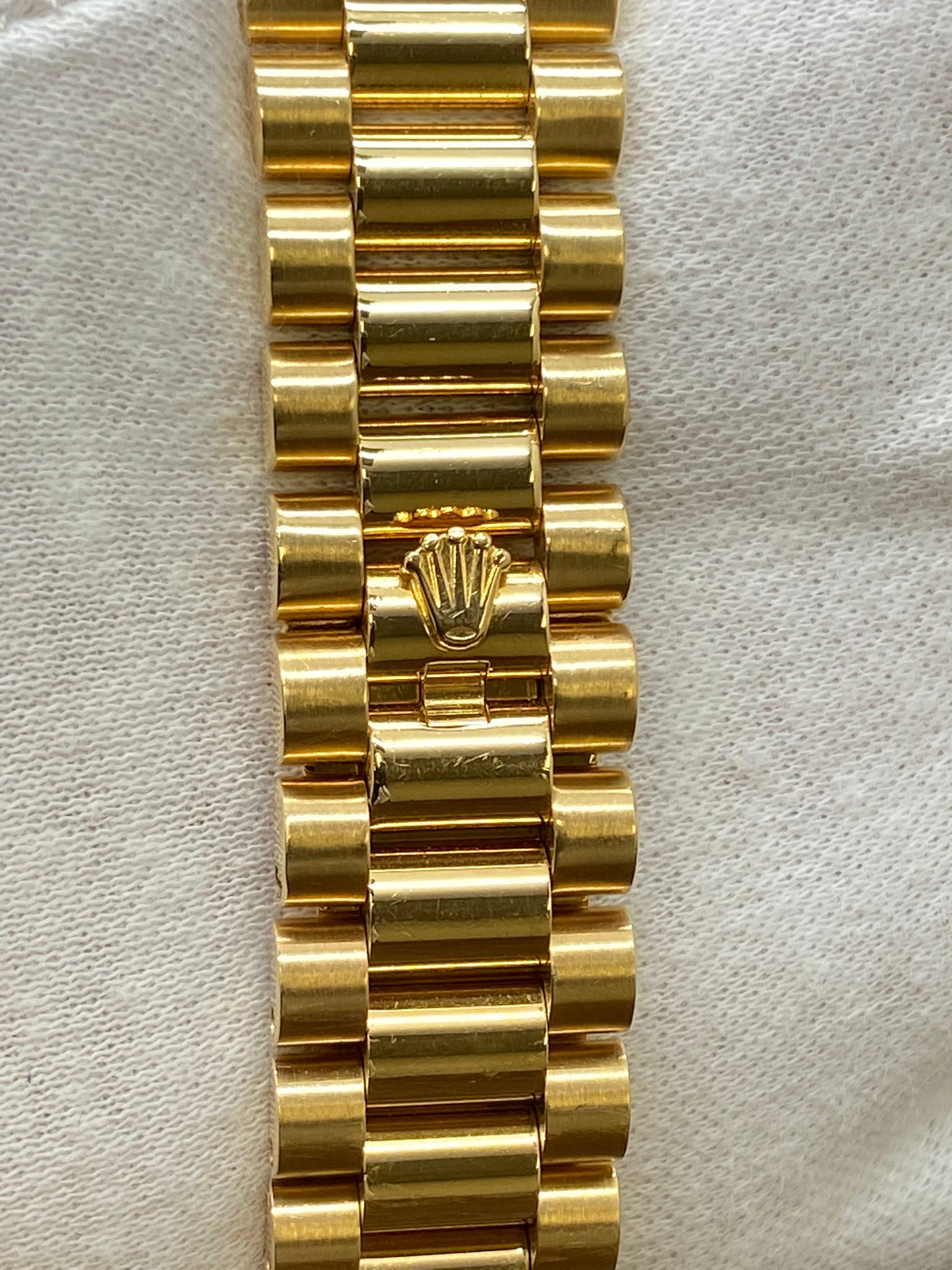 This pre-owned Rolex President Day Date 36mm Fat Buckle 118238 is in excellent condition and comes with: original Rolex box, booklets and matching service warranty card valid factory warranty until Dec 2026. The watch has minor signs of wear on case and bracelet and comes with matching Service warranty card dated Dec 2024 with valid Factory warranty until Dec 2026. Max wrist size: 7.25 in.