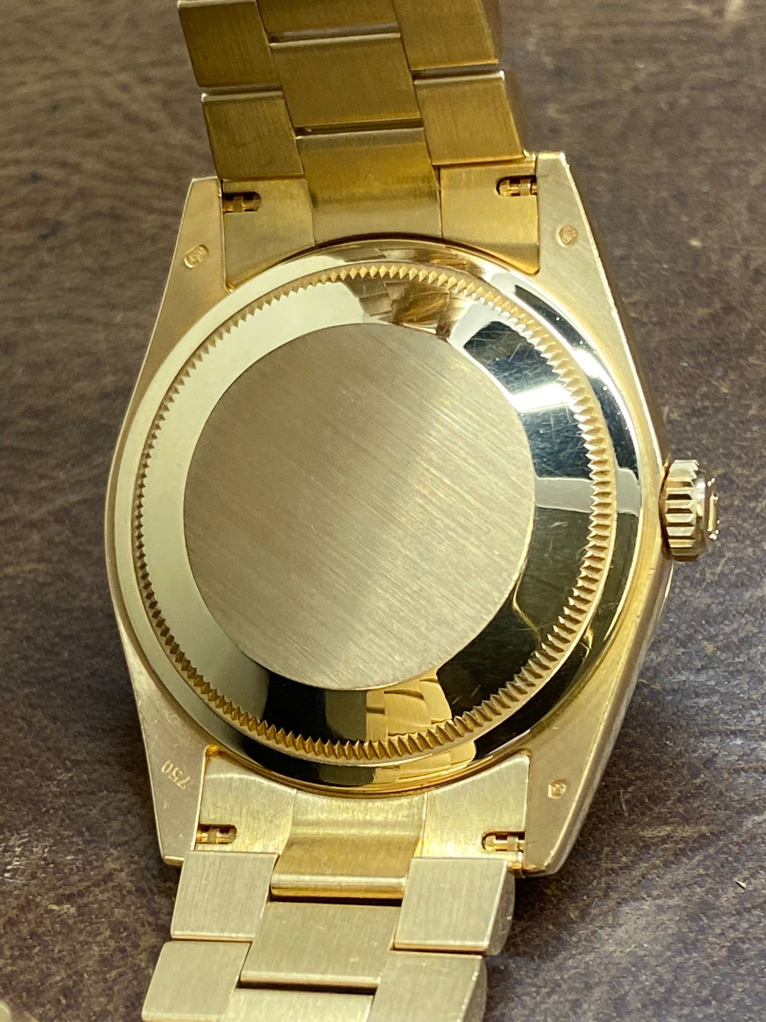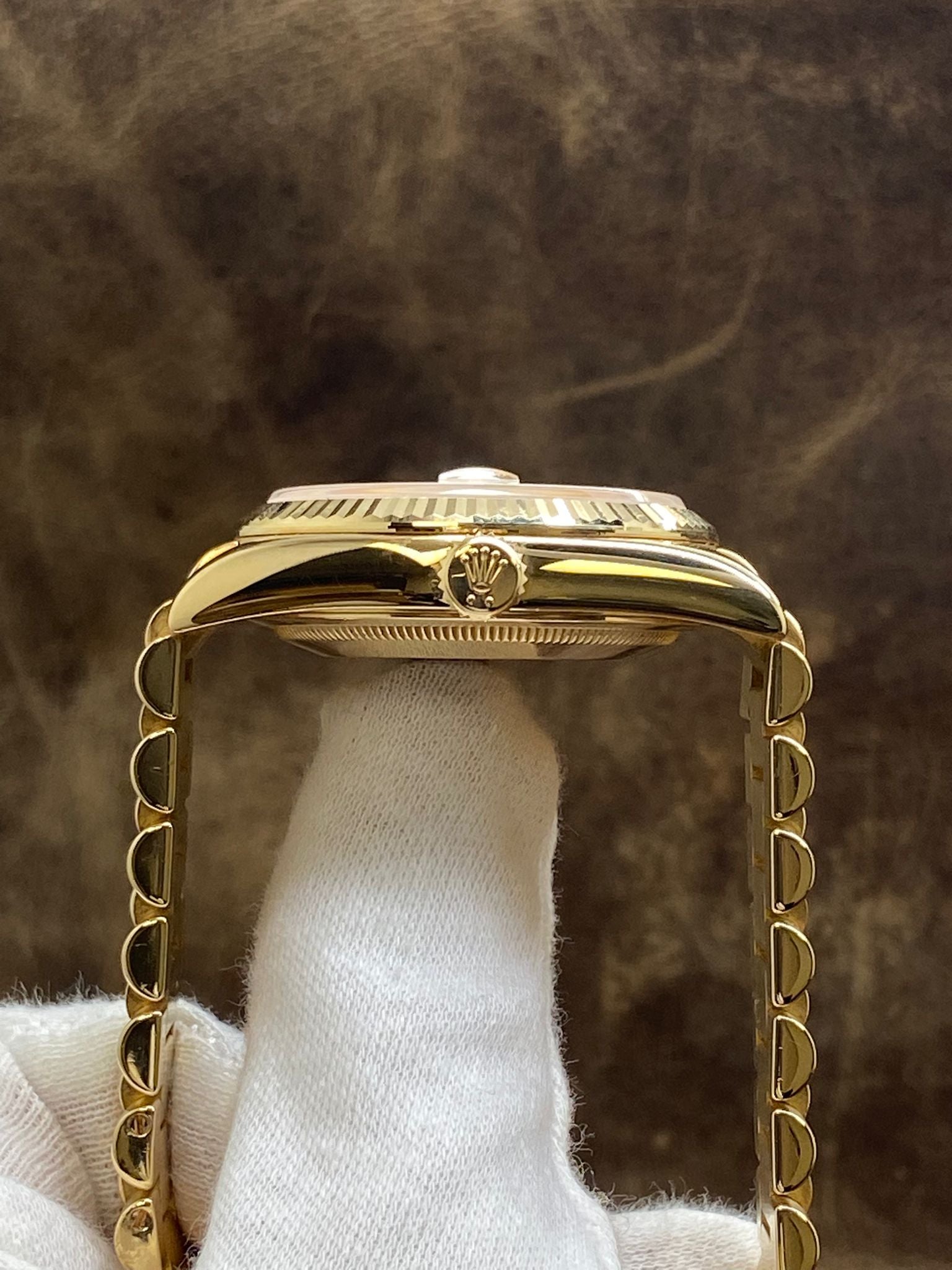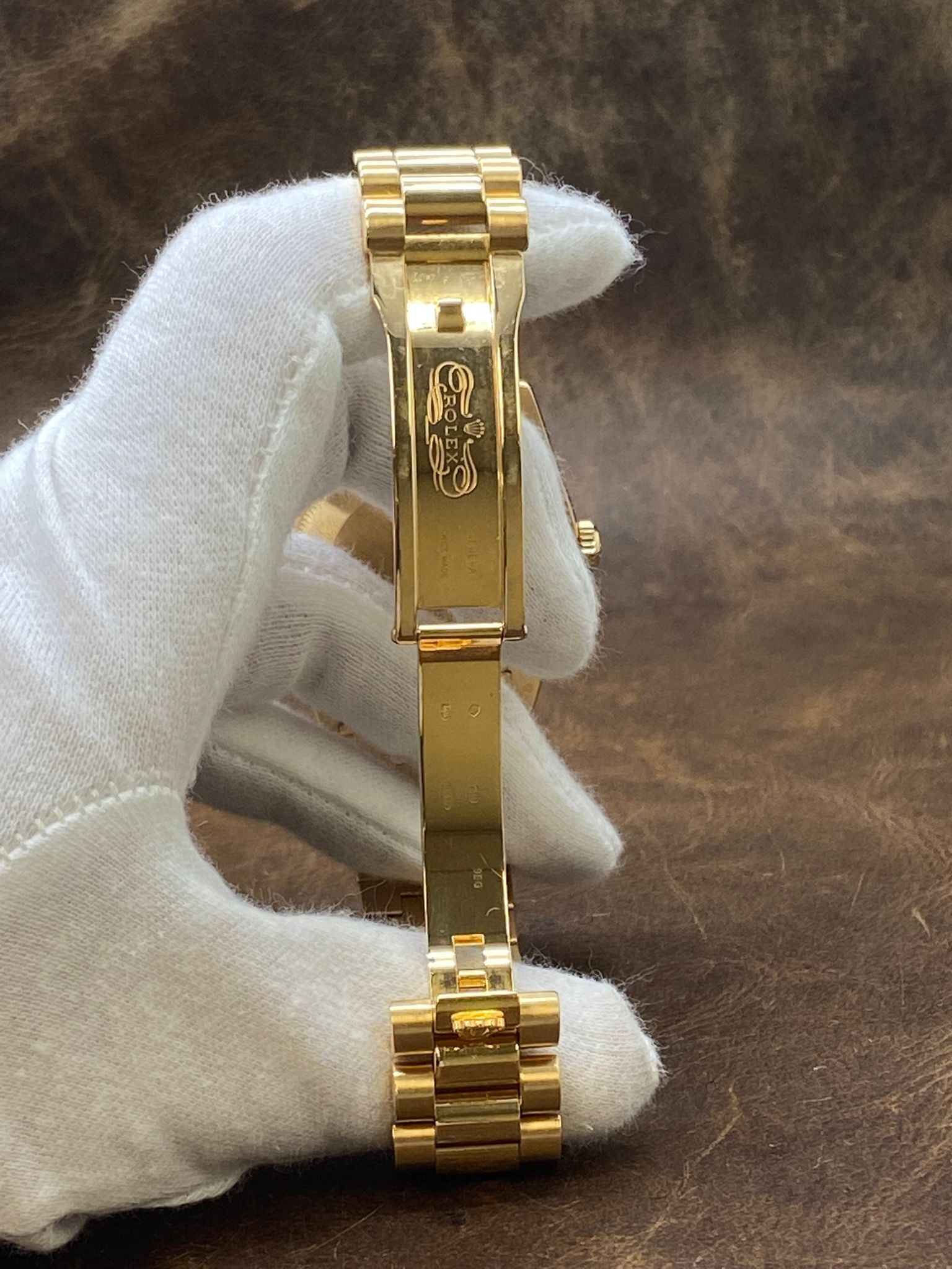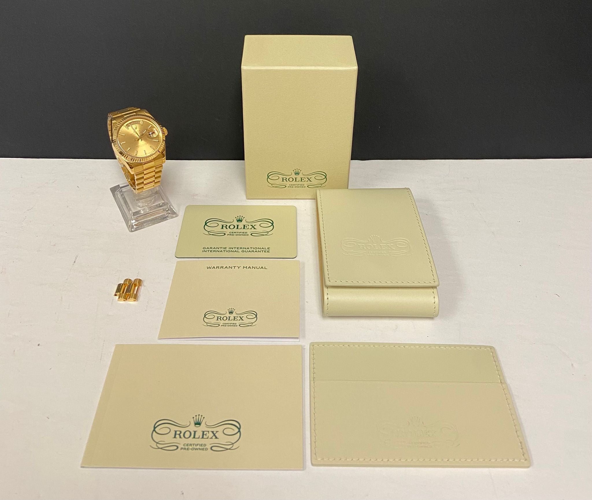 This pre-owned Rolex President Day Date 36mm Fat Buckle 118238 is in excellent condition and comes with: original Rolex box, booklets and matching service warranty card valid factory warranty until Dec 2026. The watch has minor signs of wear on case and bracelet and comes with matching Service warranty card dated Dec 2024 with valid Factory warranty until Dec 2026. Max wrist size: 7.25 in.